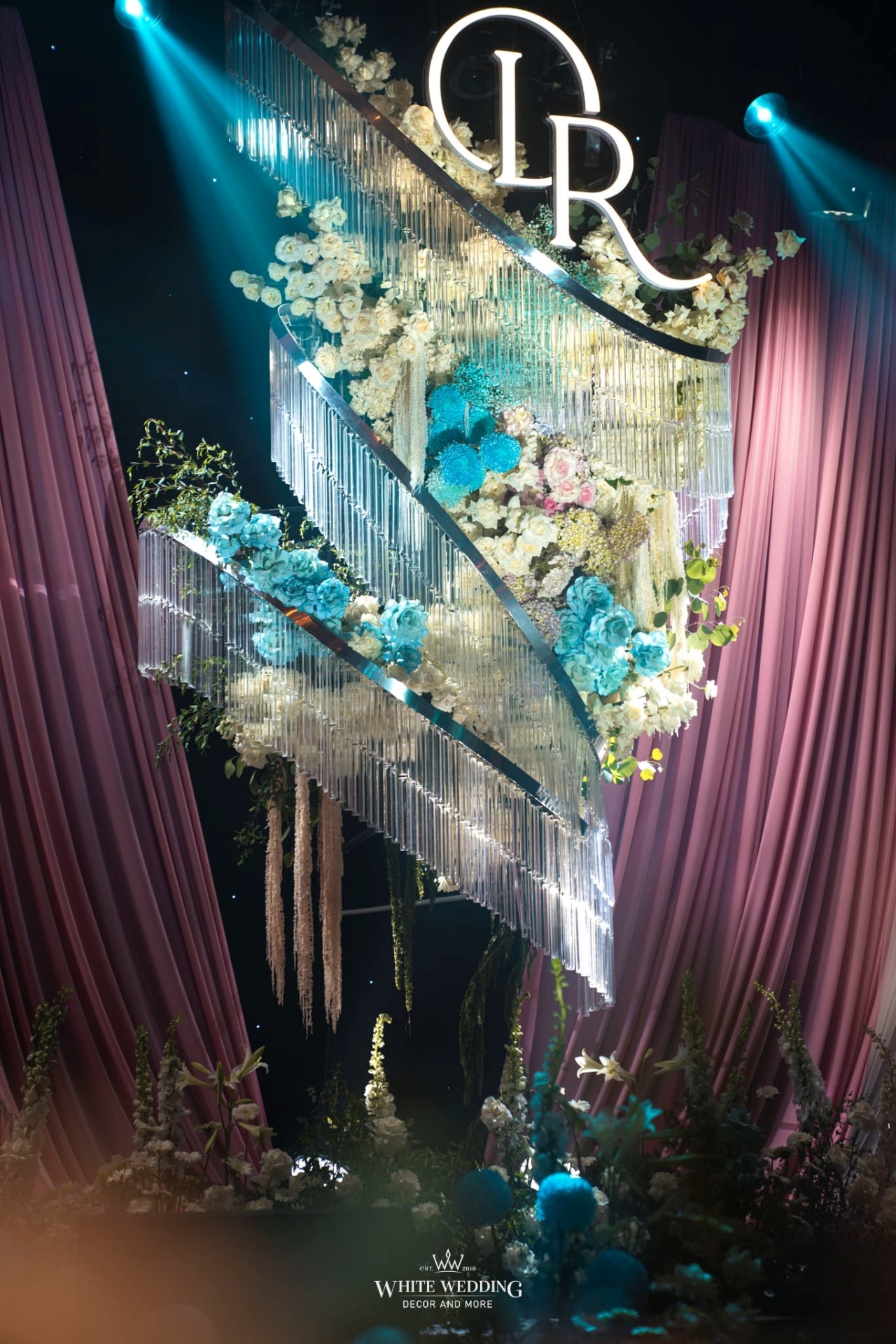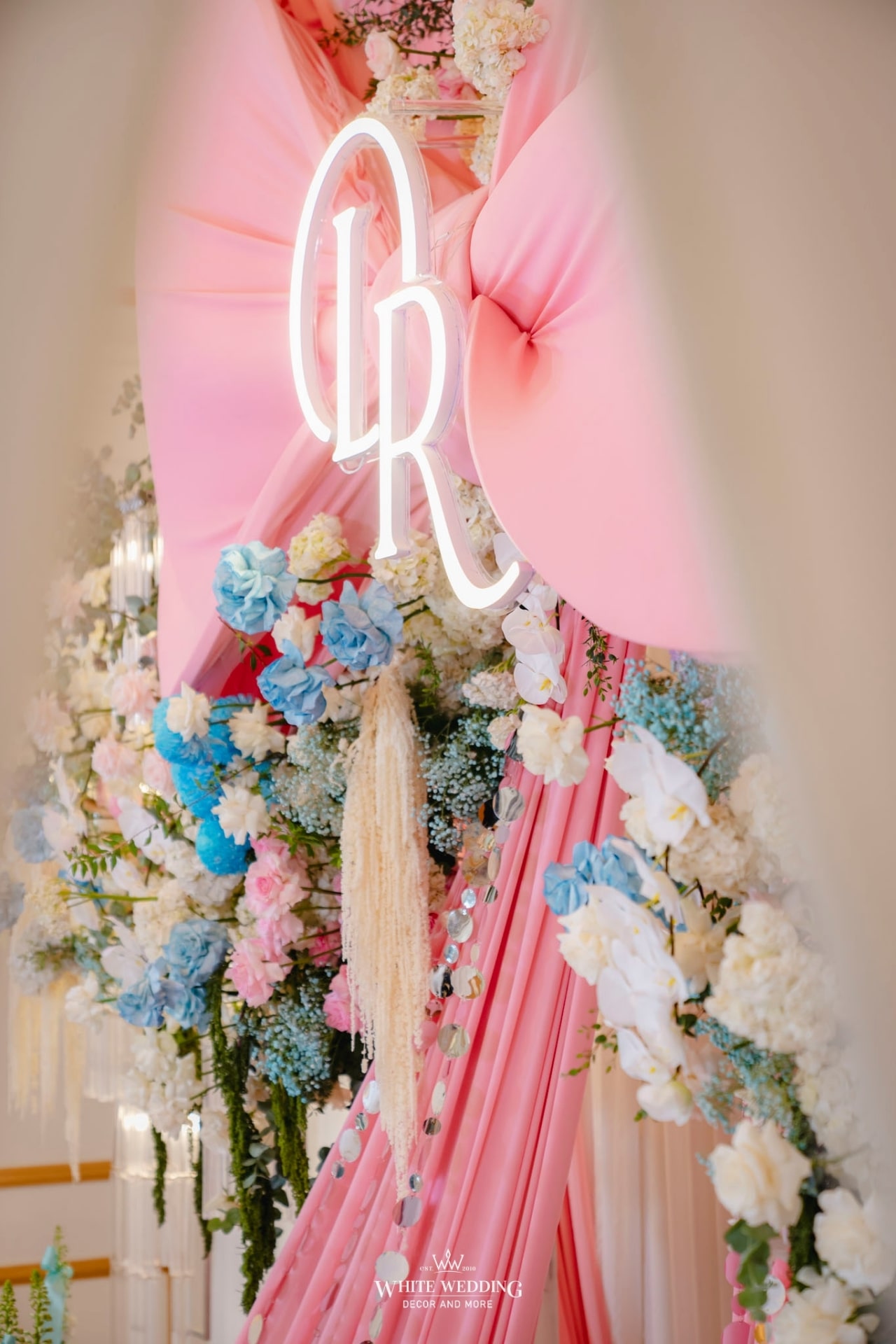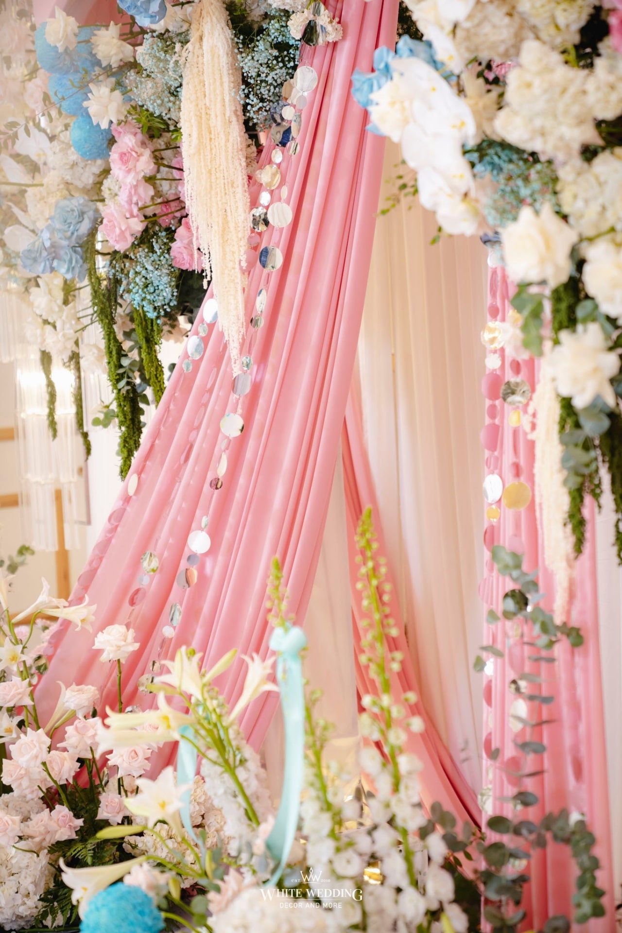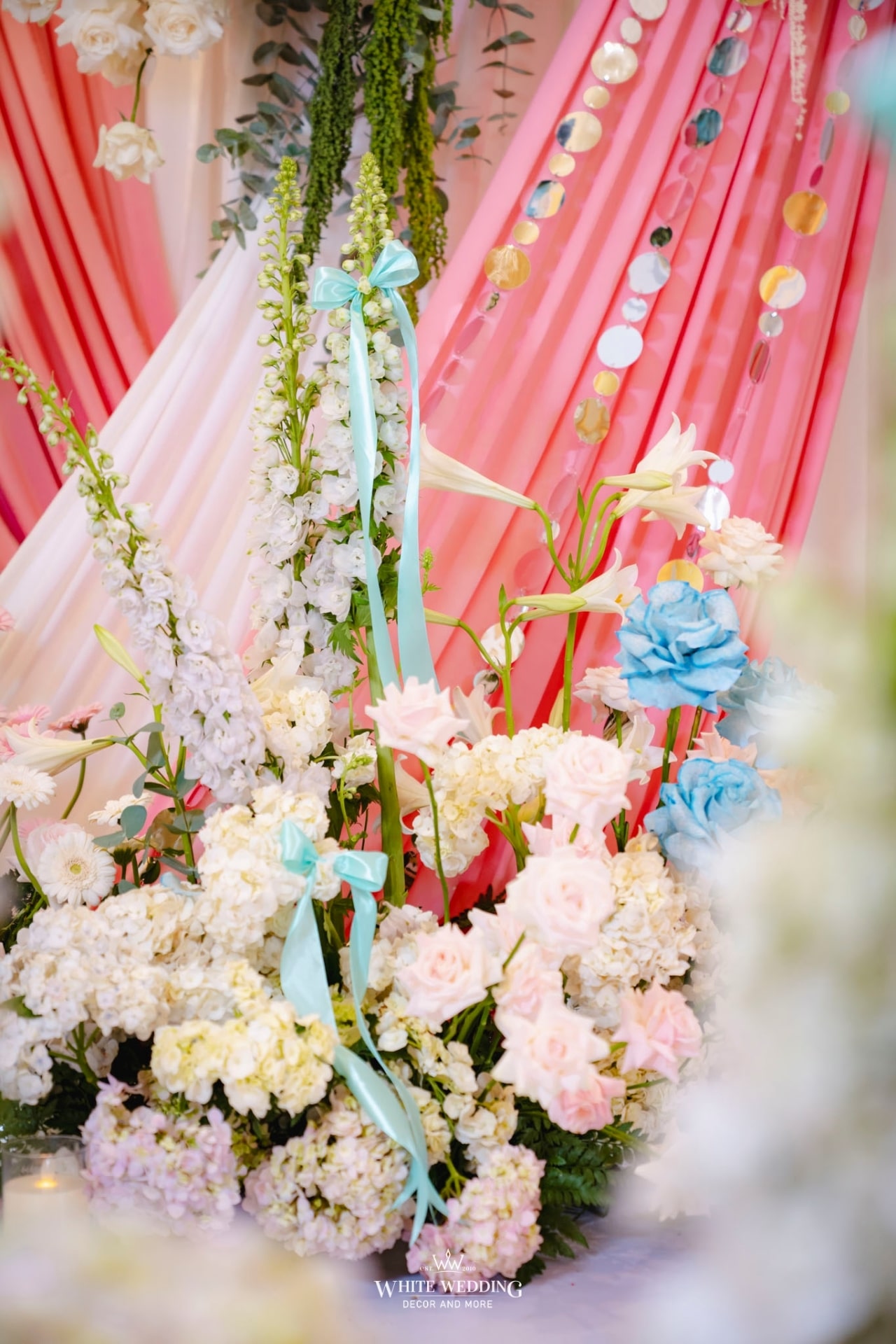 Chiếc nơ quen thuộc nay được White Wedding làm mới bằng cách kết hợp những dải sequin ánh bạc lấp lánh. Cùng với đó là sự tráng lệ, xa hoa của chiếc đèn chùm pha lê được thiết kế riêng cho nàng dâu Ray ở trung tâm sân khấu. Vừa đủ trang trọng cho lễ gia tiên, vừa phản chiếu trọn vẹn gu thẩm mỹ riêng của nàng dâu Gen Z.