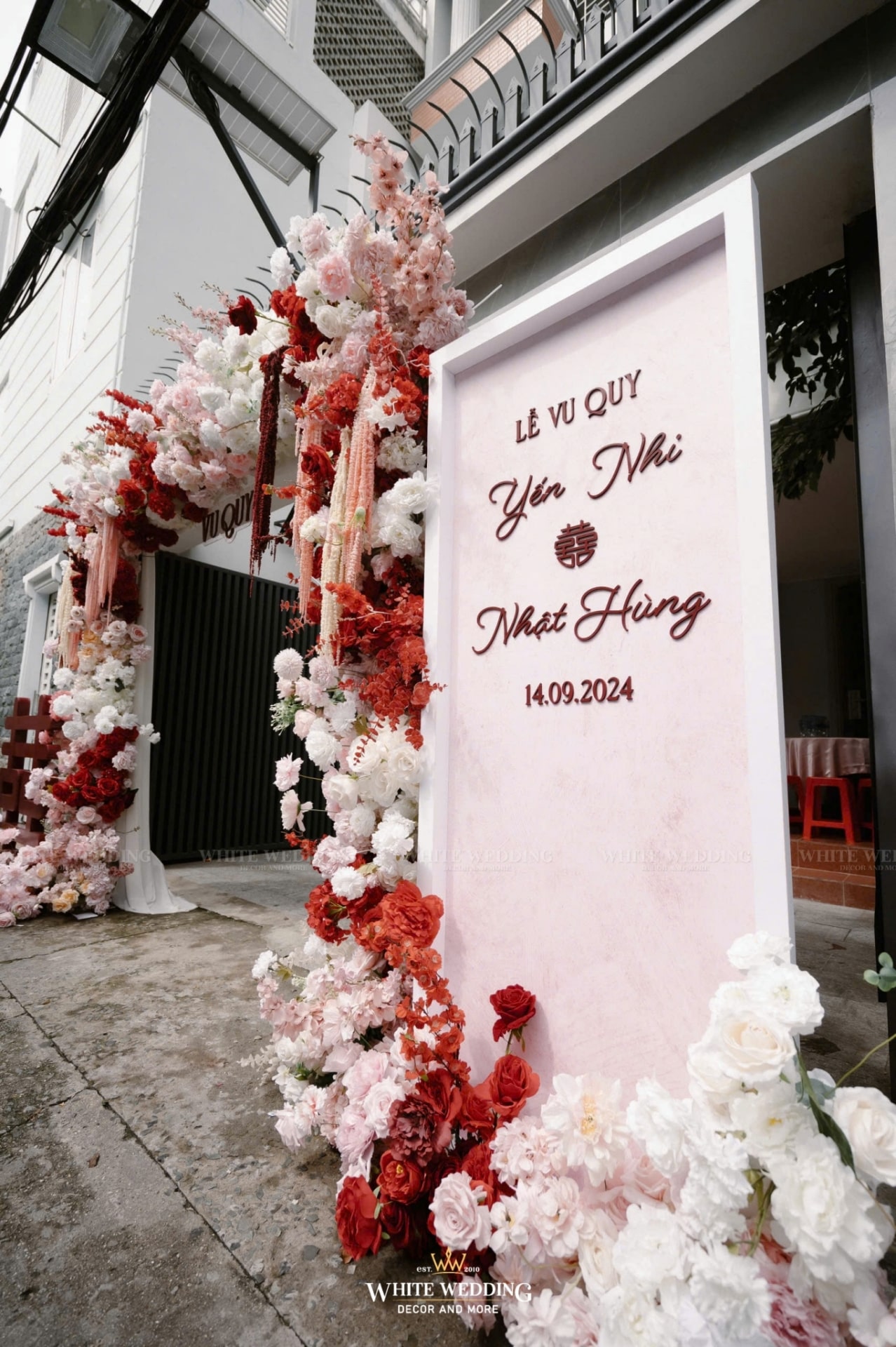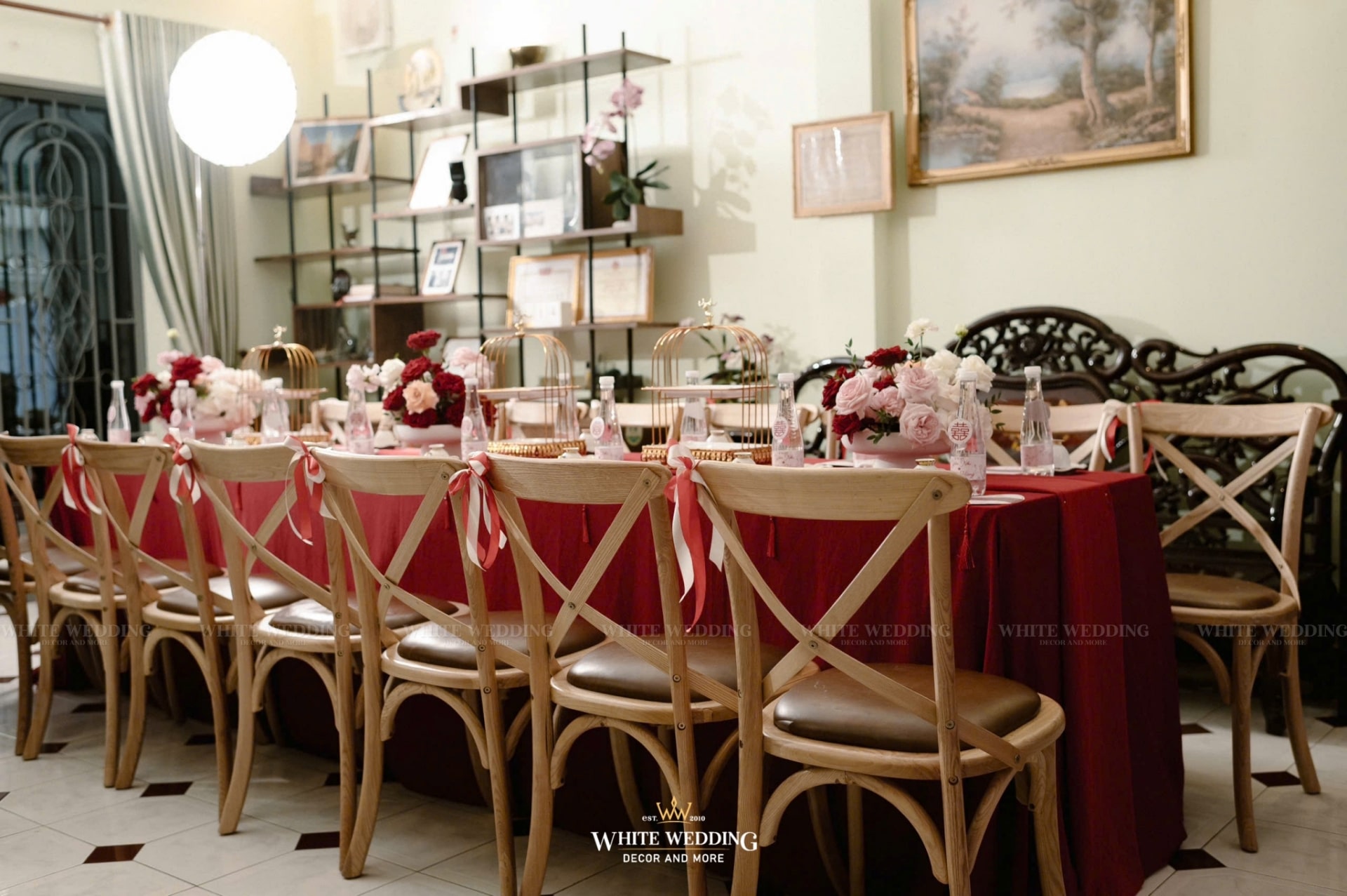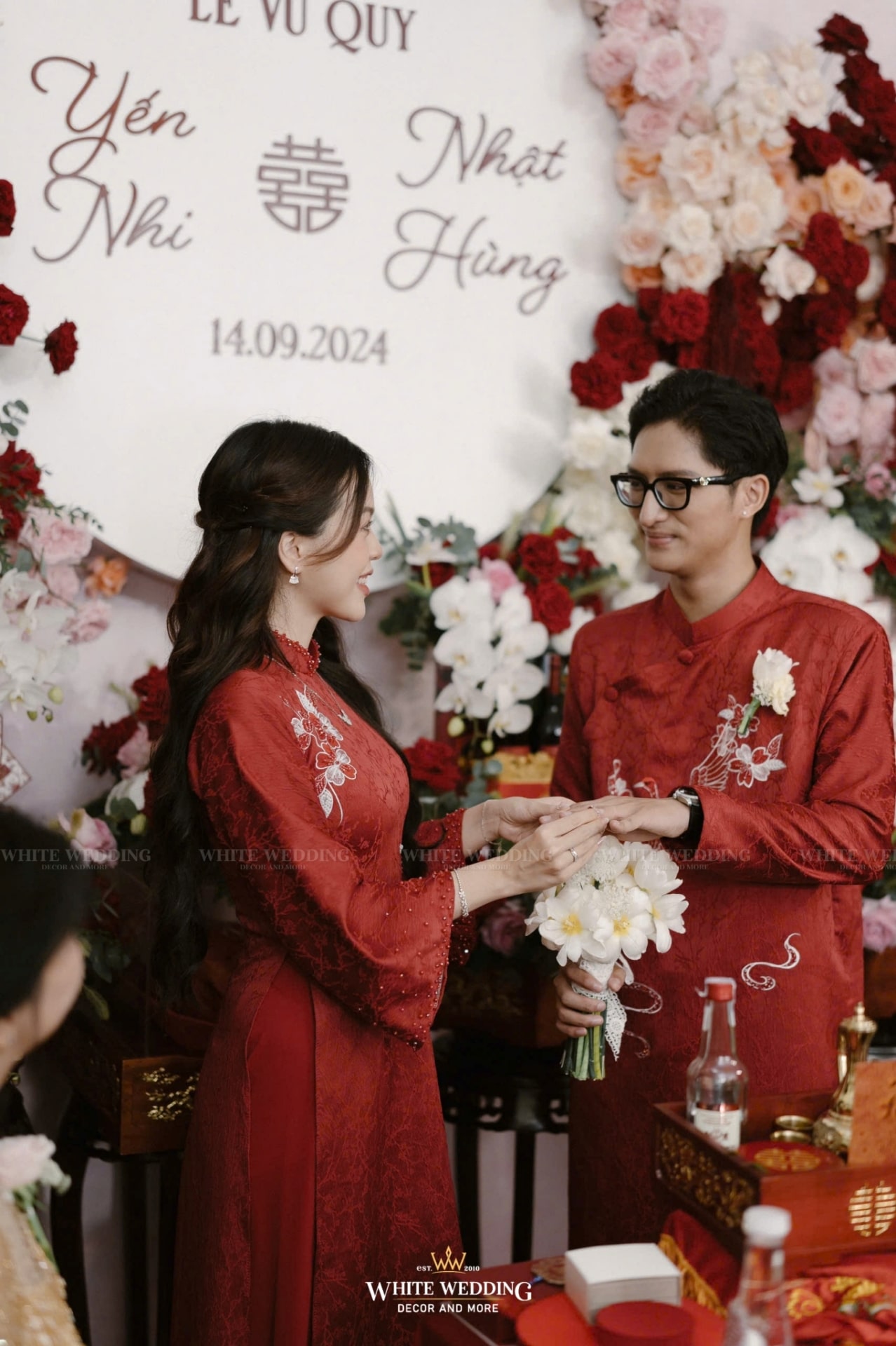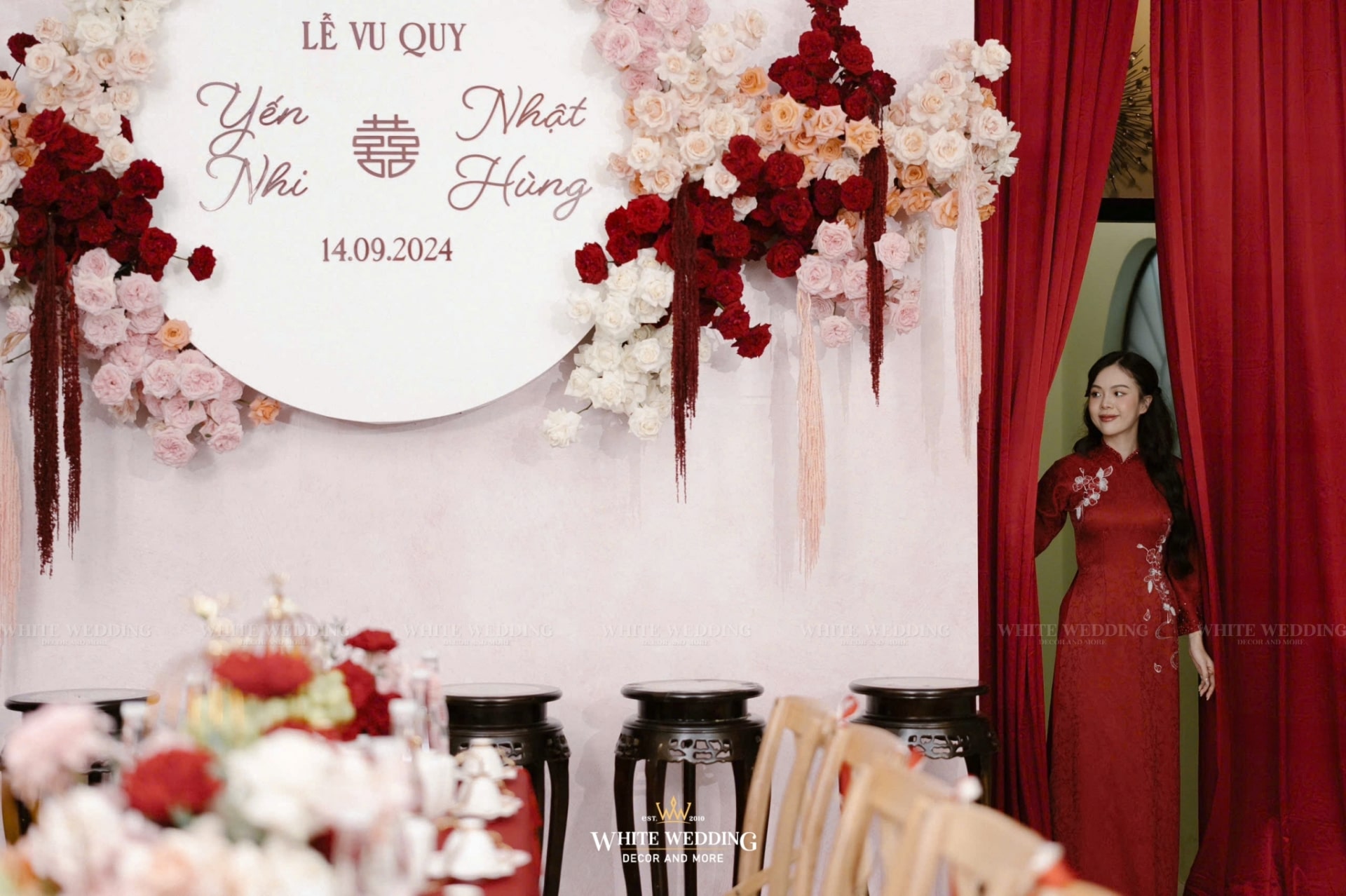 Red Rose – concept vu quy mang đậm sắc thái truyền thống, với điểm nhấn là hoa hồng đỏ rực phối cùng dền rủ buông nhẹ. Từ cổng cưới đến không gian bàn tiệc, mọi chi tiết đều được chăm chút để tôn vinh sự nồng nàn, trang trọng và đầy cảm xúc cho ngày về nhà chồng của Yến Nhi.