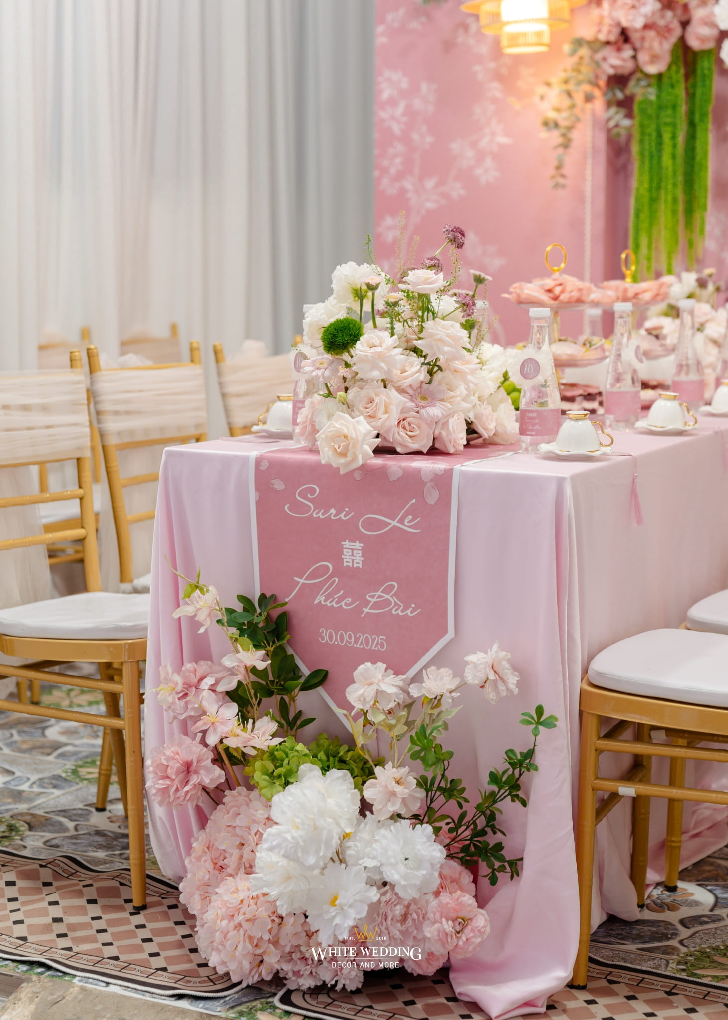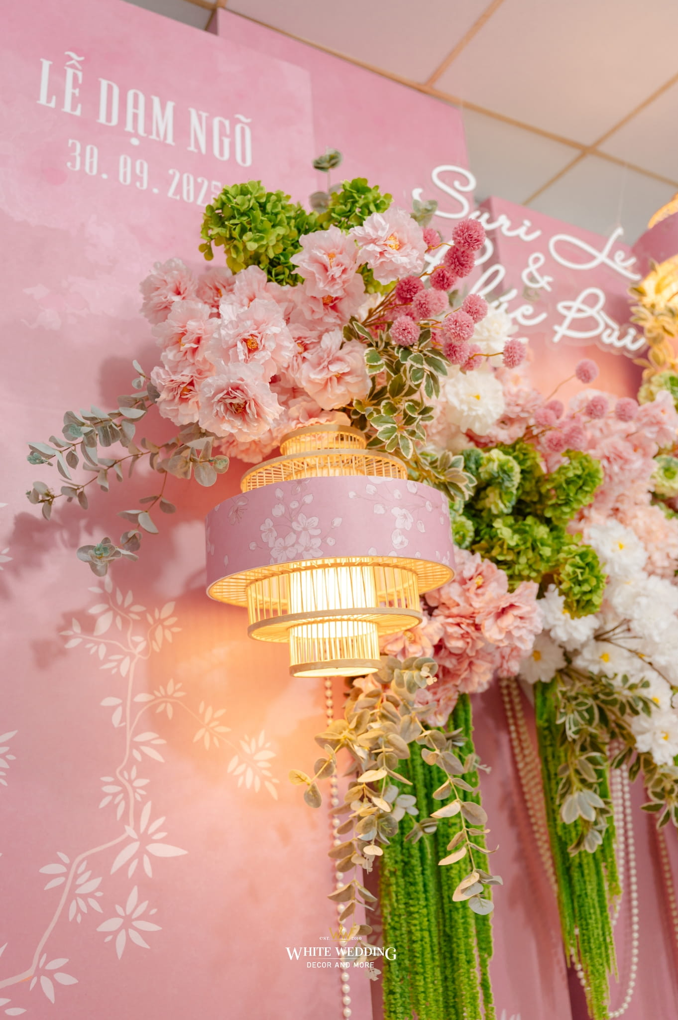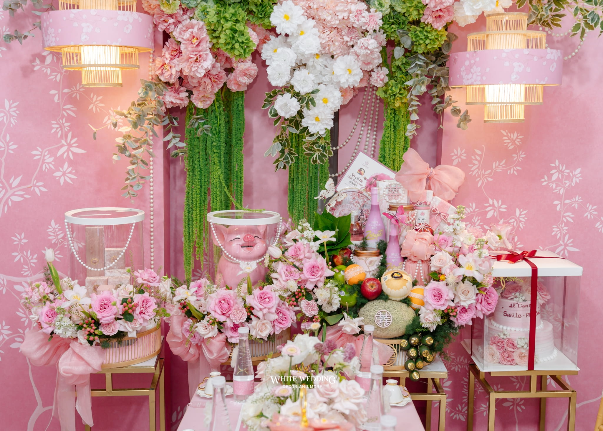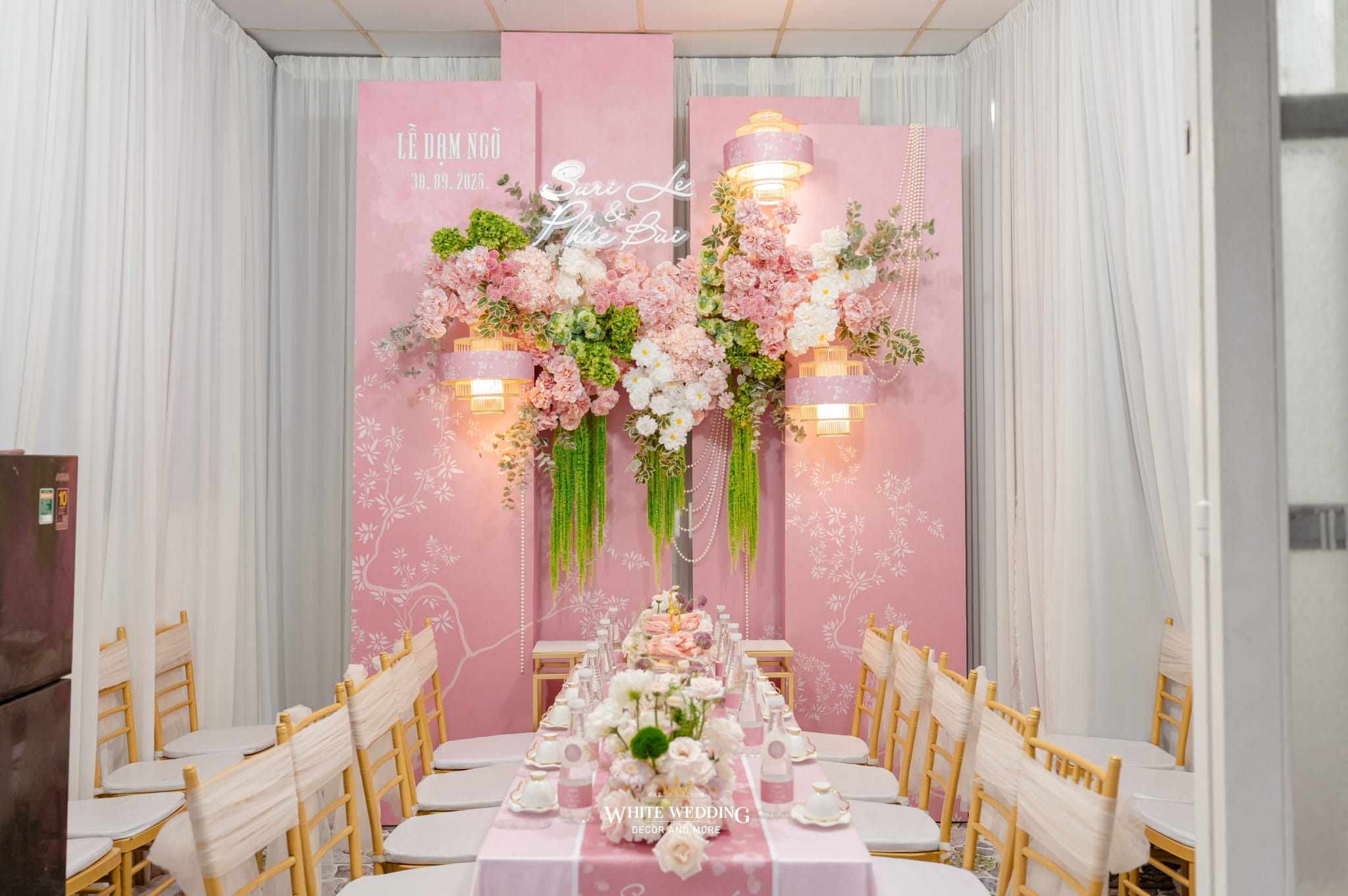 Lấy cảm hứng từ nàng dâu Suri – cô gái cá tính nhưng yêu sắc hồng nữ tính – White Wedding đã tạo nên concept Rosé Whisper. Tông hồng pastel chủ đạo mang đến cảm giác dịu dàng, mở đầu cho khoảnh khắc đính ước của đôi uyên ương. Trên nền hồng tinh tế, hoa và ngọc trai được sắp đặt khéo léo, tạo điểm nhấn thơ mộng, nữ tính và lãng mạn cho không gian buổi lễ.