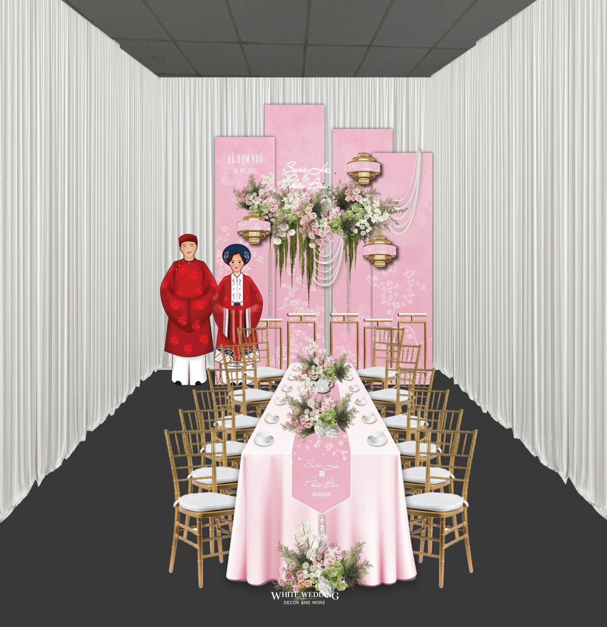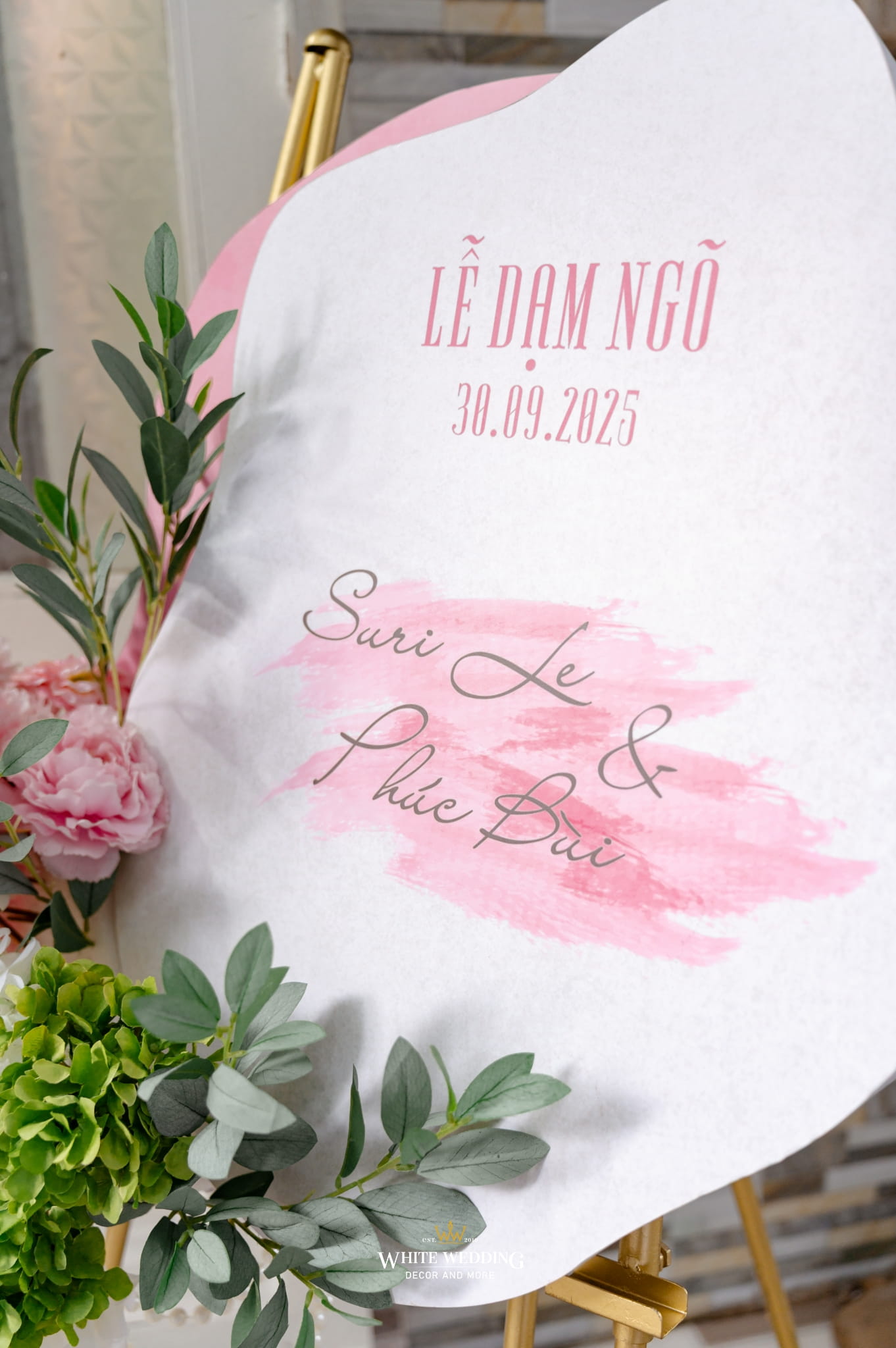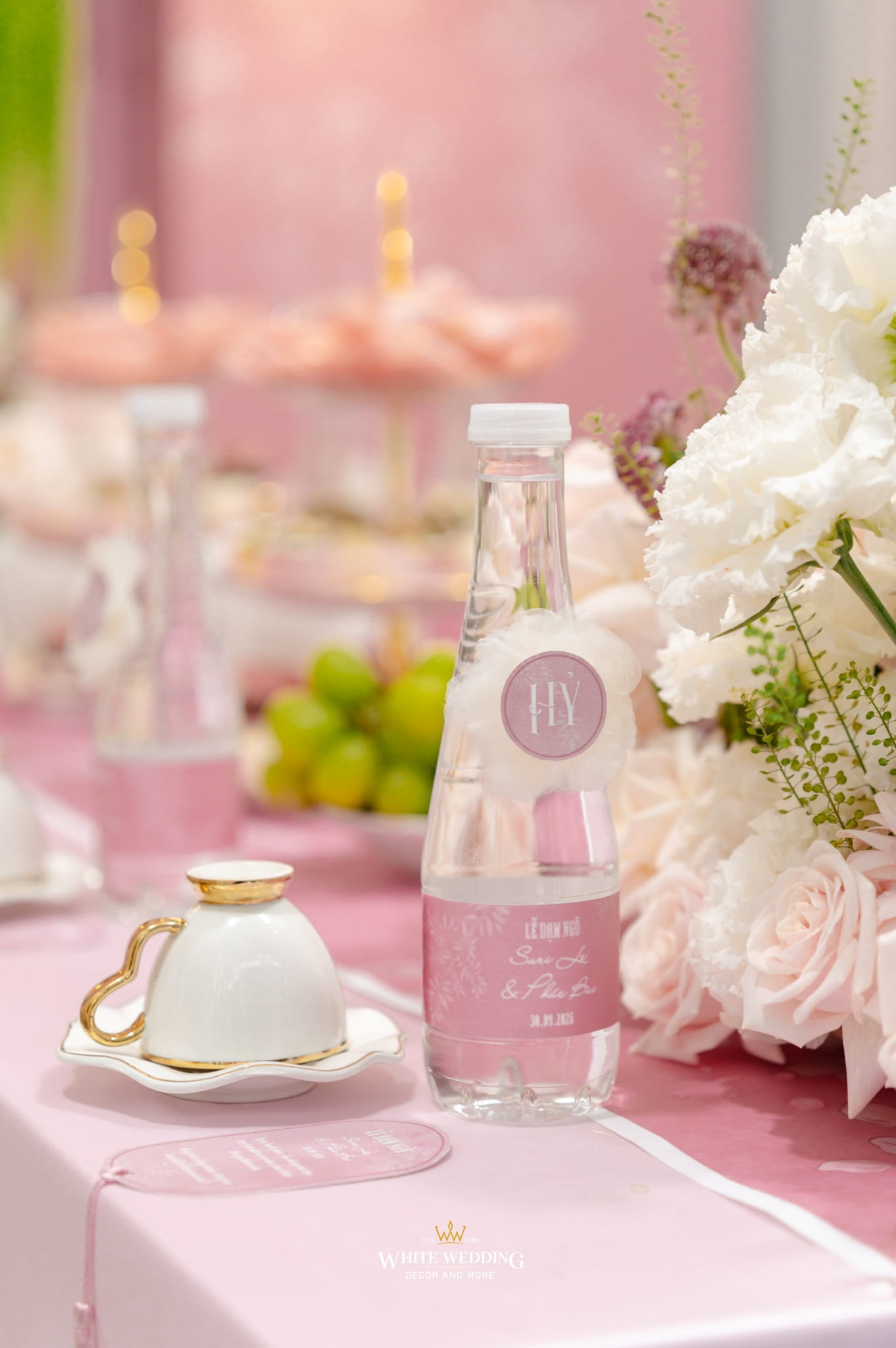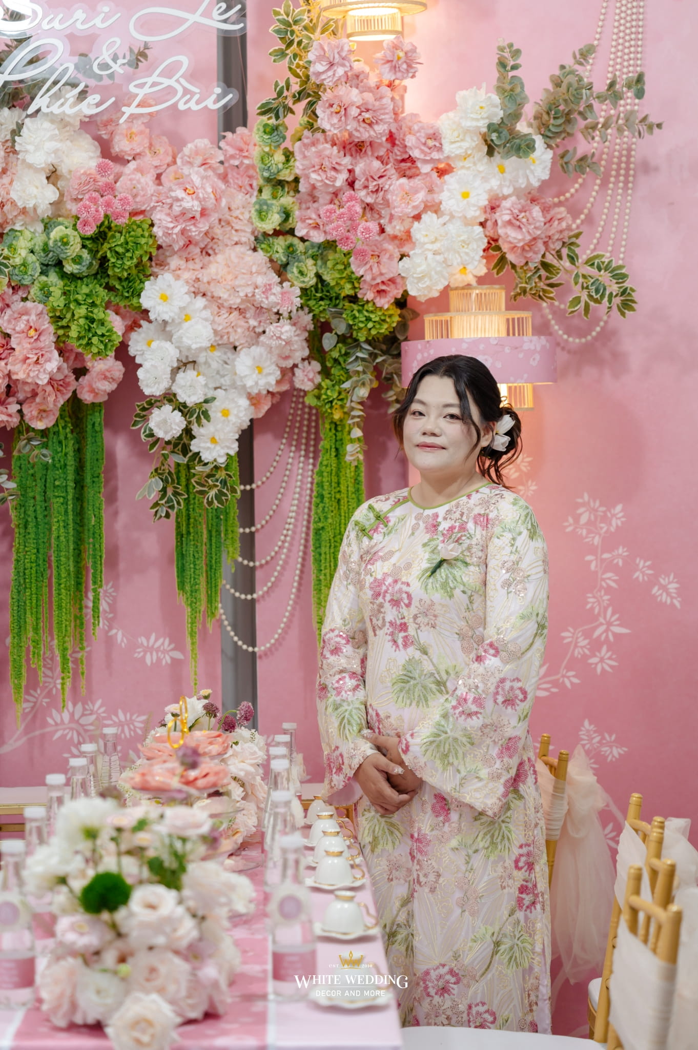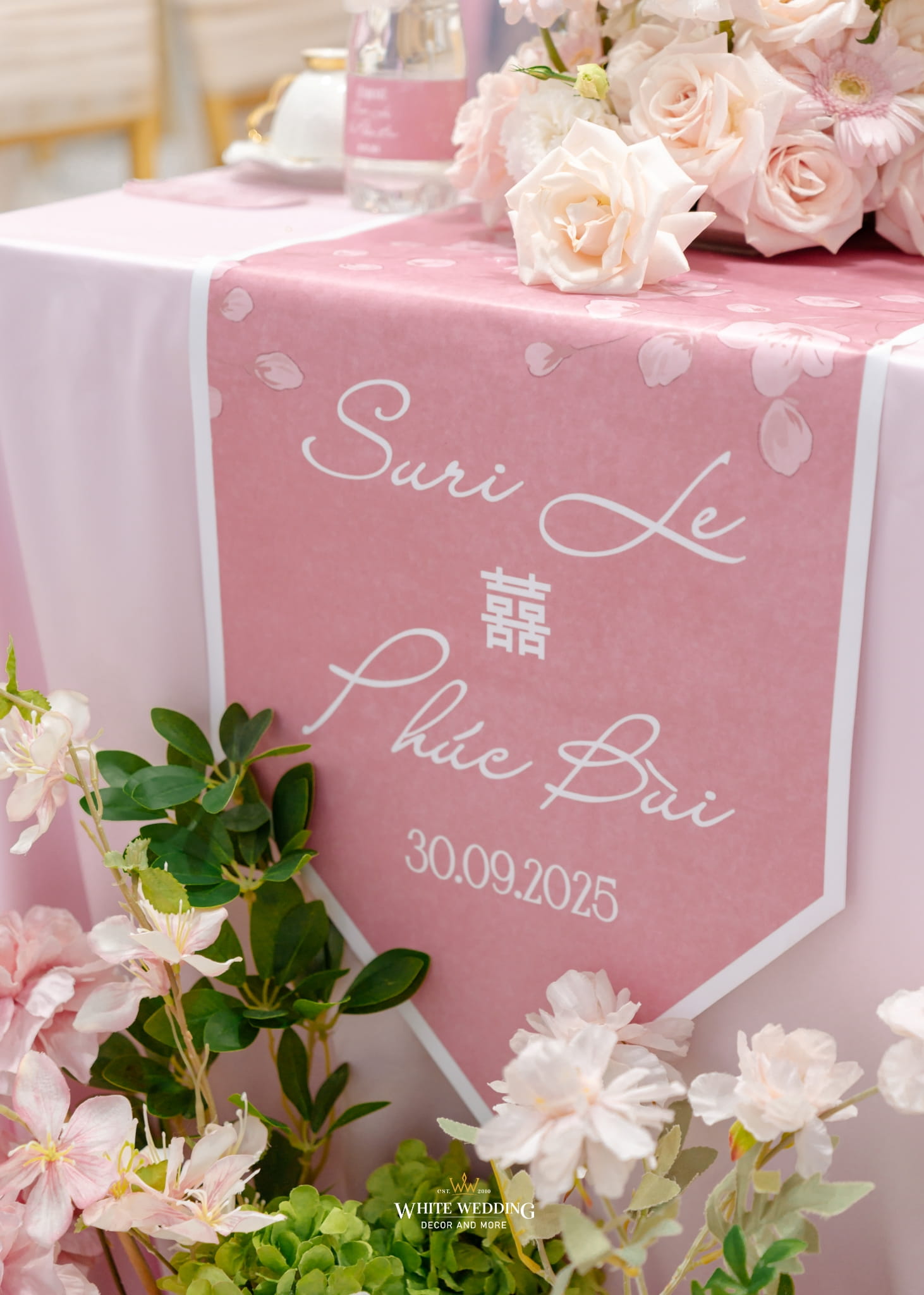 Lấy cảm hứng từ nàng dâu Suri – cô gái cá tính nhưng yêu sắc hồng nữ tính – White Wedding đã tạo nên concept Rosé Whisper. Tông hồng pastel chủ đạo mang đến cảm giác dịu dàng, mở đầu cho khoảnh khắc đính ước của đôi uyên ương. Trên nền hồng tinh tế, hoa và ngọc trai được sắp đặt khéo léo, tạo điểm nhấn thơ mộng, nữ tính và lãng mạn cho không gian buổi lễ.