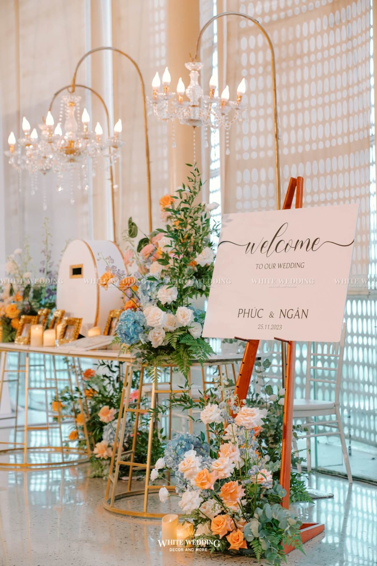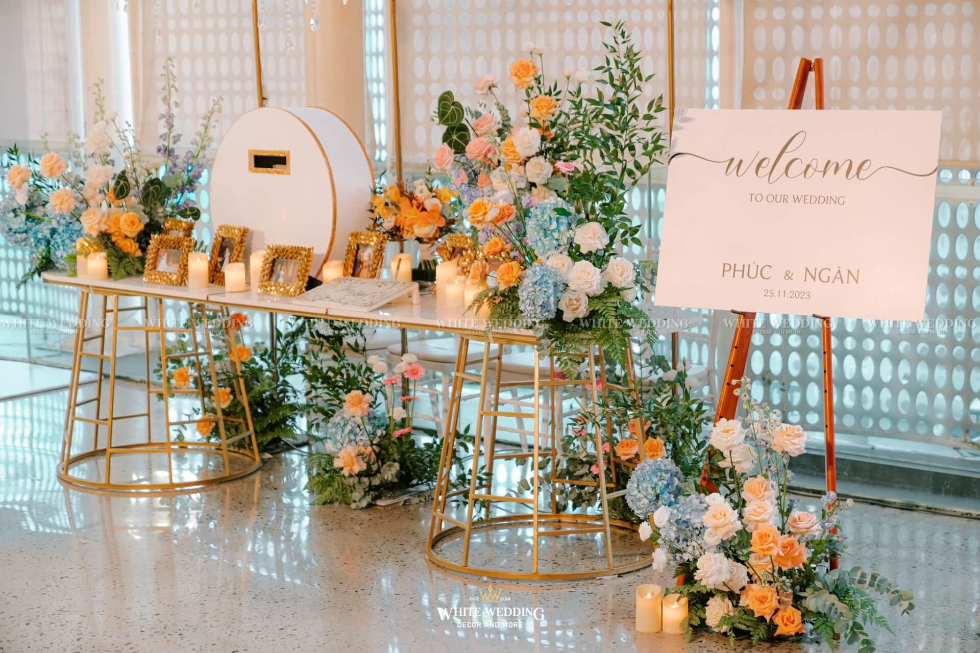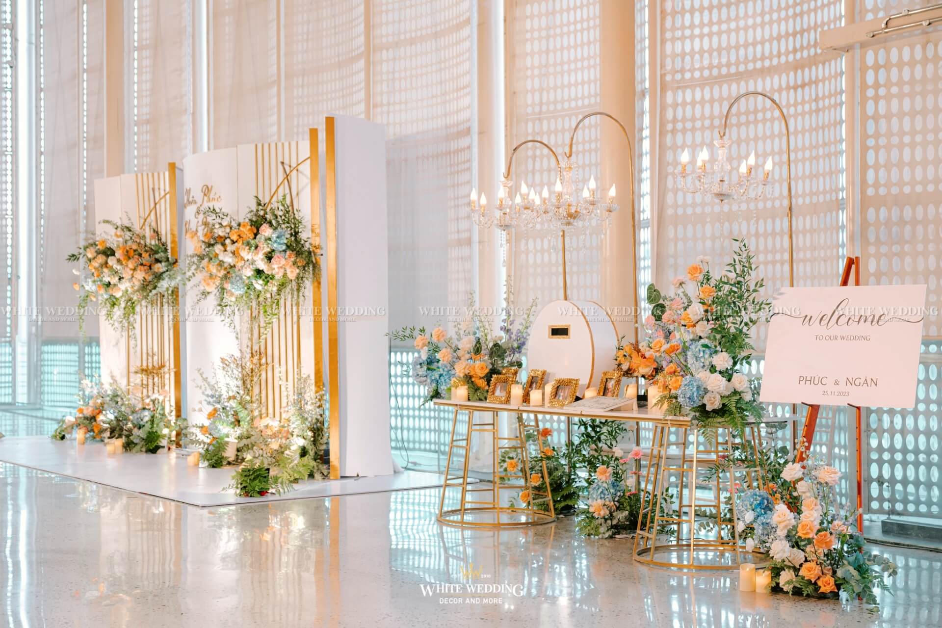 Soft Glow mang đến không gian tiệc cưới nhẹ nhàng, thanh thoát như một buổi chiều thu dịu nắng. Tông màu pastel cam – xanh – trắng kết hợp ánh nến vàng ấm áp và chi tiết ánh kim sang trọng tạo nên hiệu ứng lung linh đầy mộng mơ.