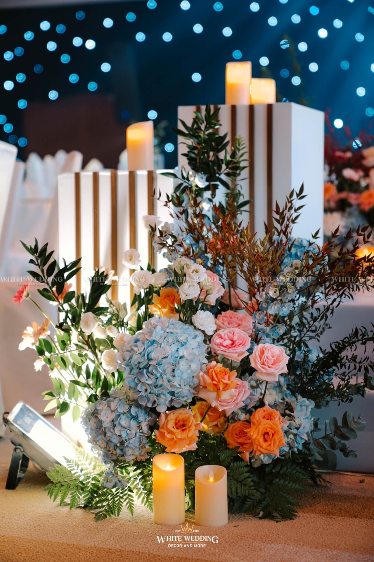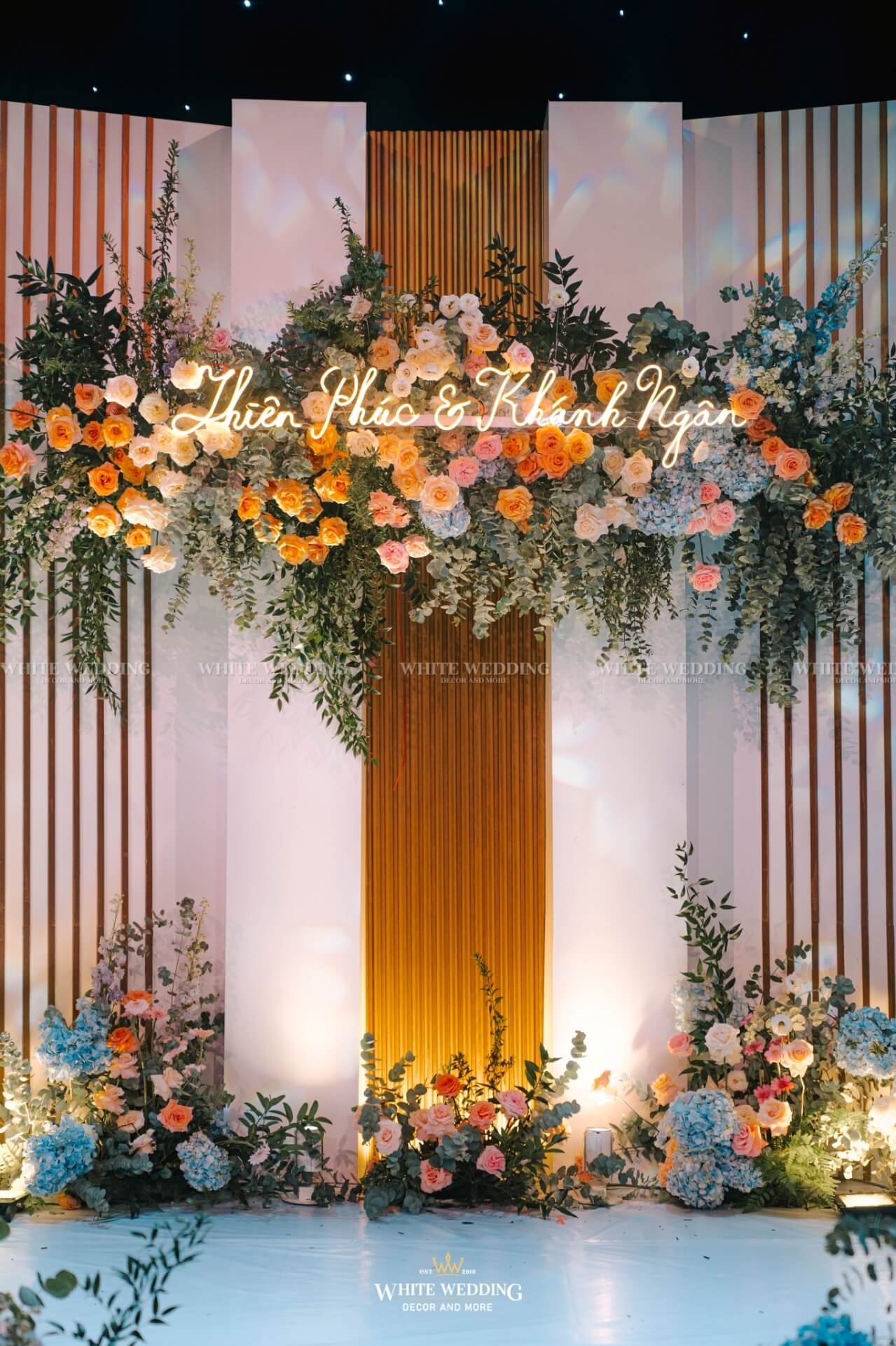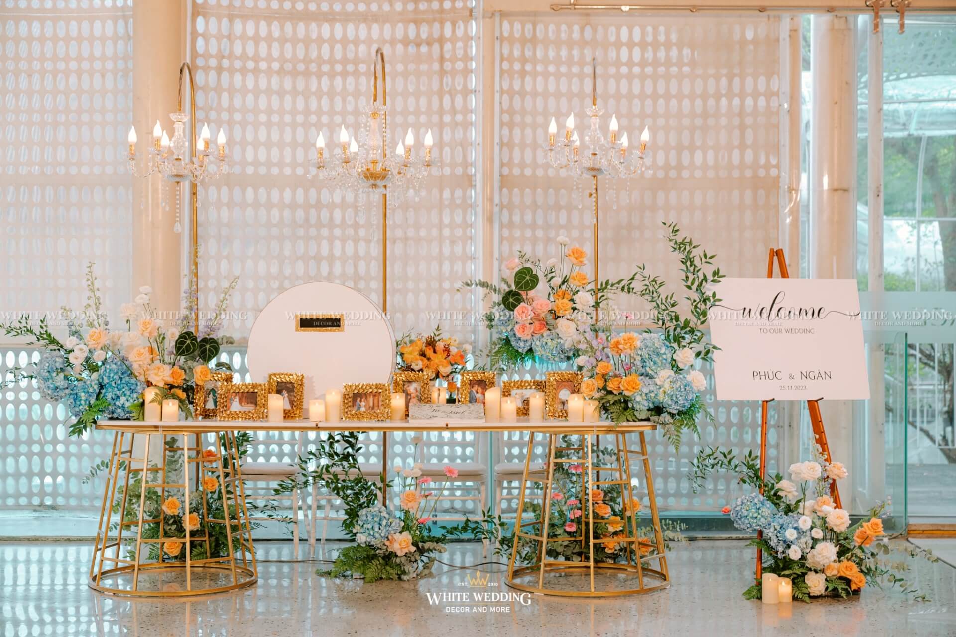 Soft Glow mang đến không gian tiệc cưới nhẹ nhàng, thanh thoát như một buổi chiều thu dịu nắng. Tông màu pastel cam – xanh – trắng kết hợp ánh nến vàng ấm áp và chi tiết ánh kim sang trọng tạo nên hiệu ứng lung linh đầy mộng mơ.