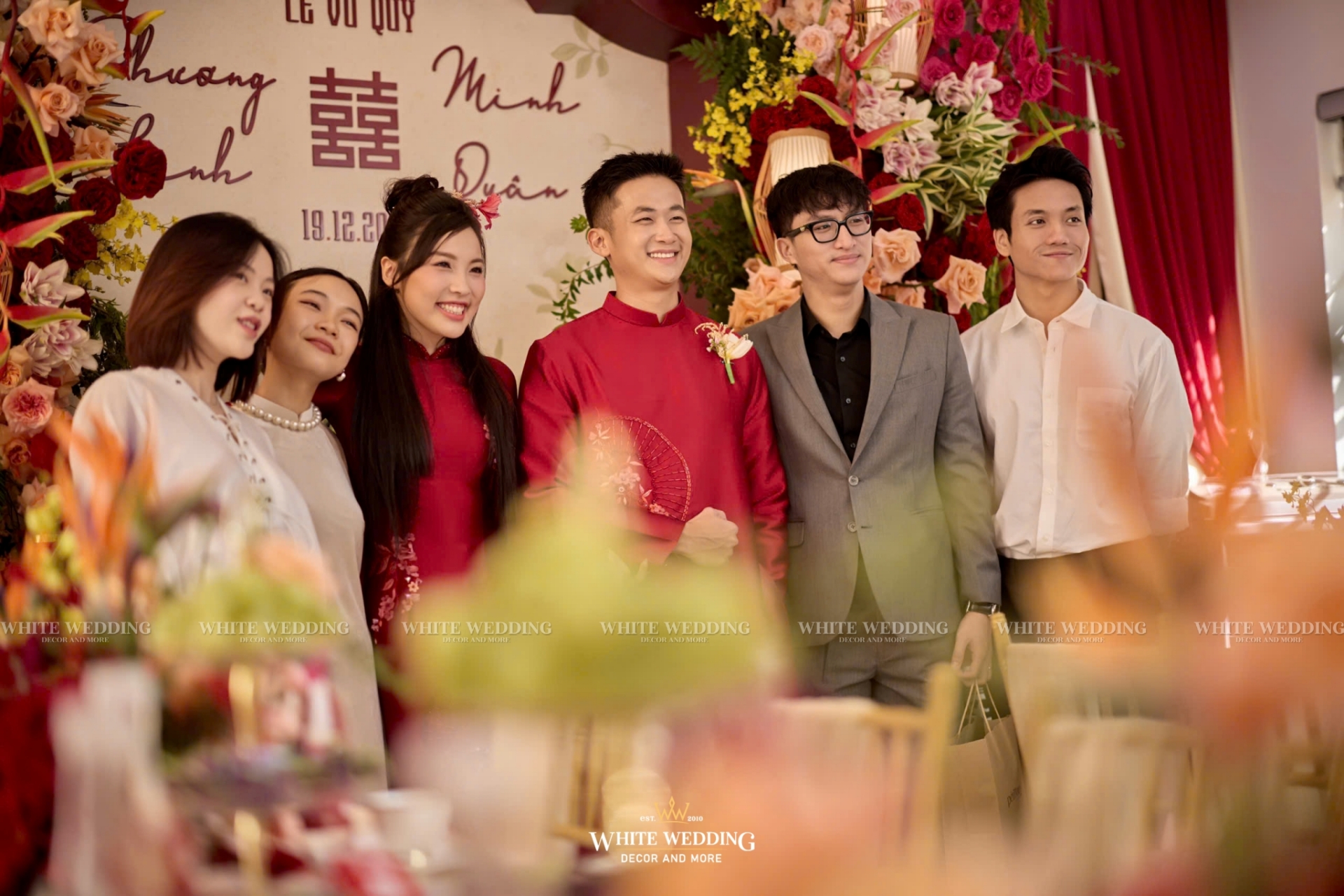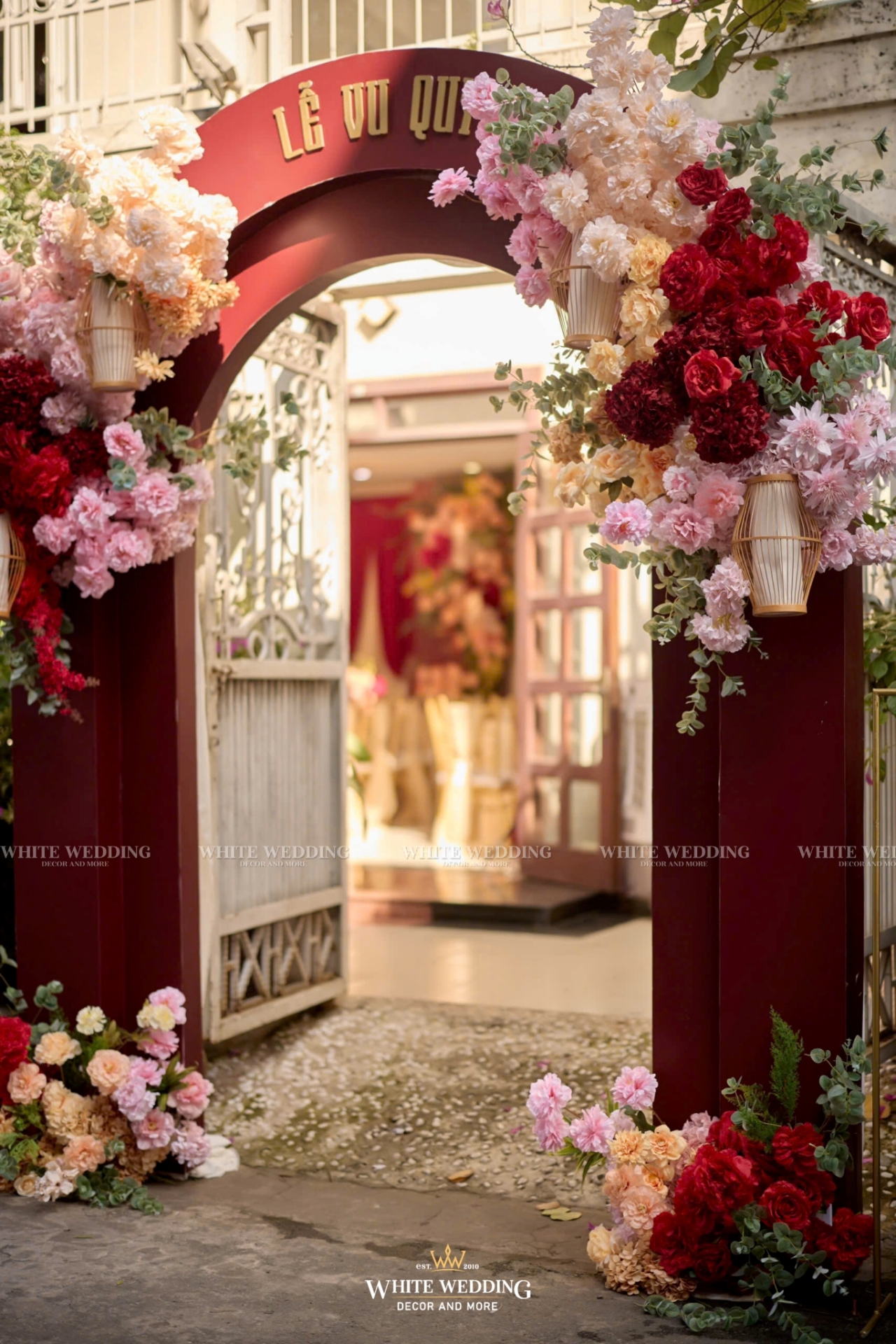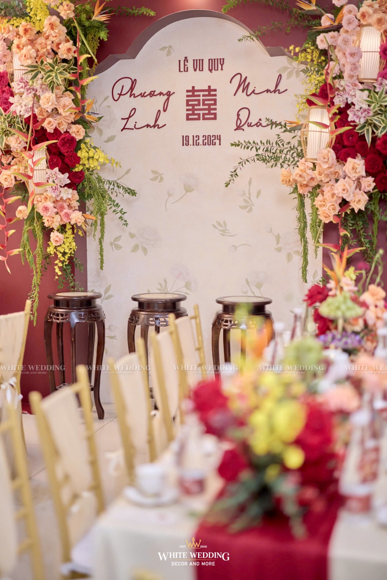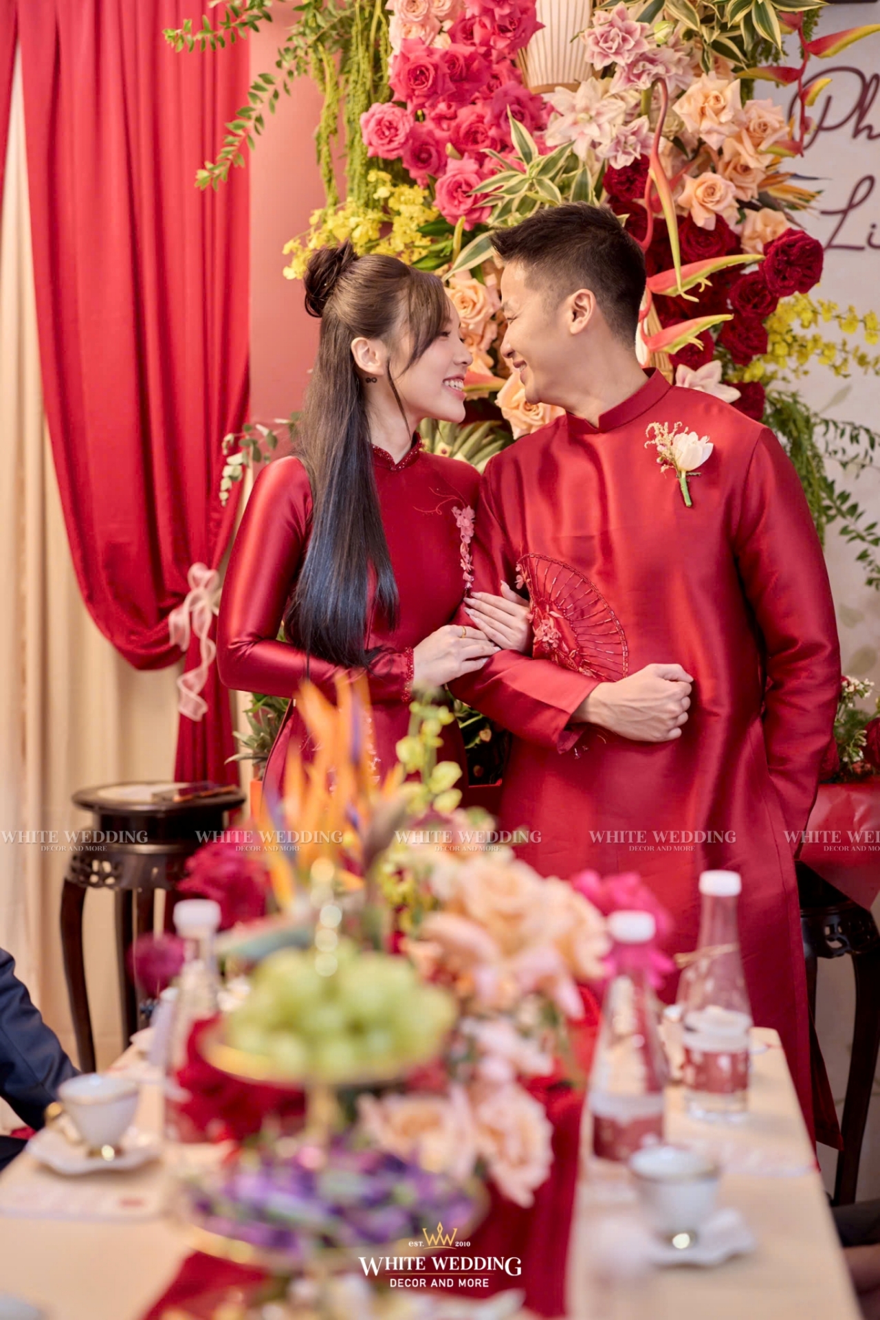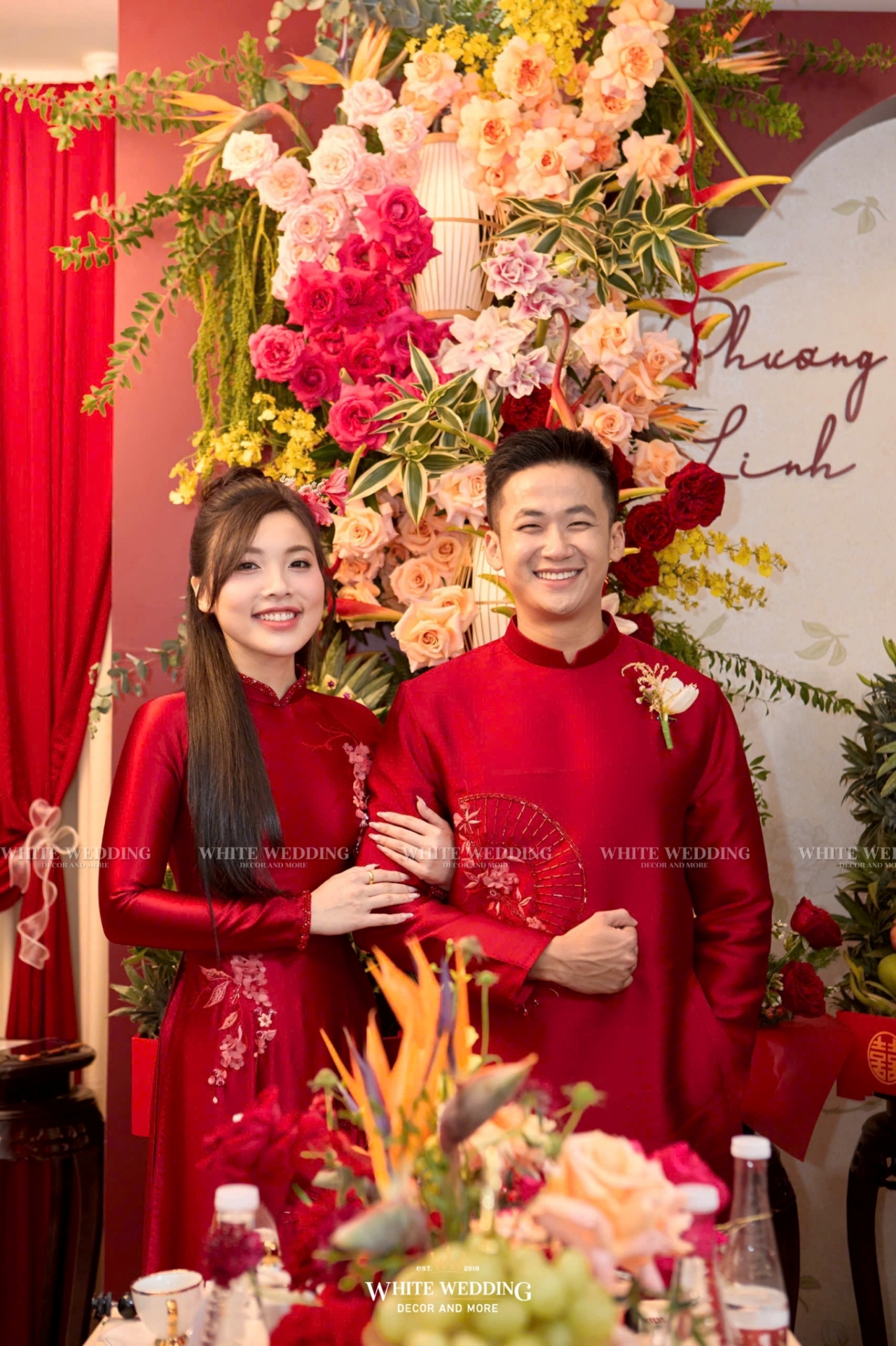 Toàn bộ không gian được thiết kế theo yêu cầu riêng của cặp đôi, sử dụng hoa tươi 100% – từ tone đỏ son chủ đạo đến những sắc cam, hồng đậm xen kẽ, tạo nên hiệu ứng thị giác mãn nhãn và cực kỳ sang trọng.