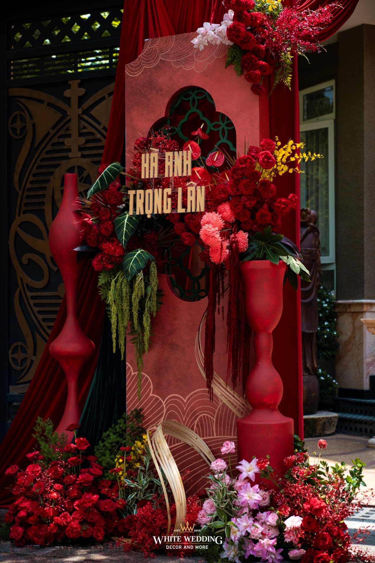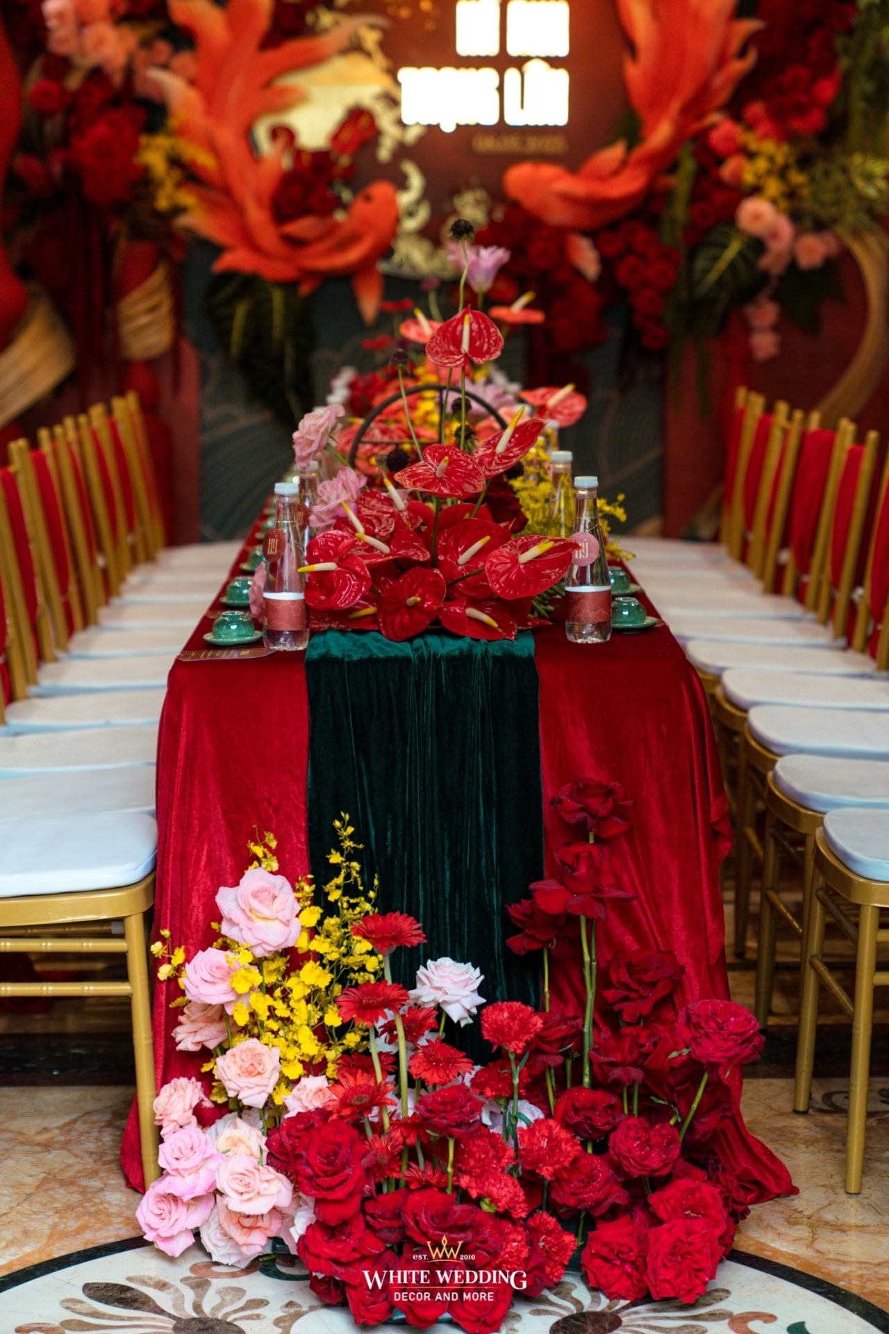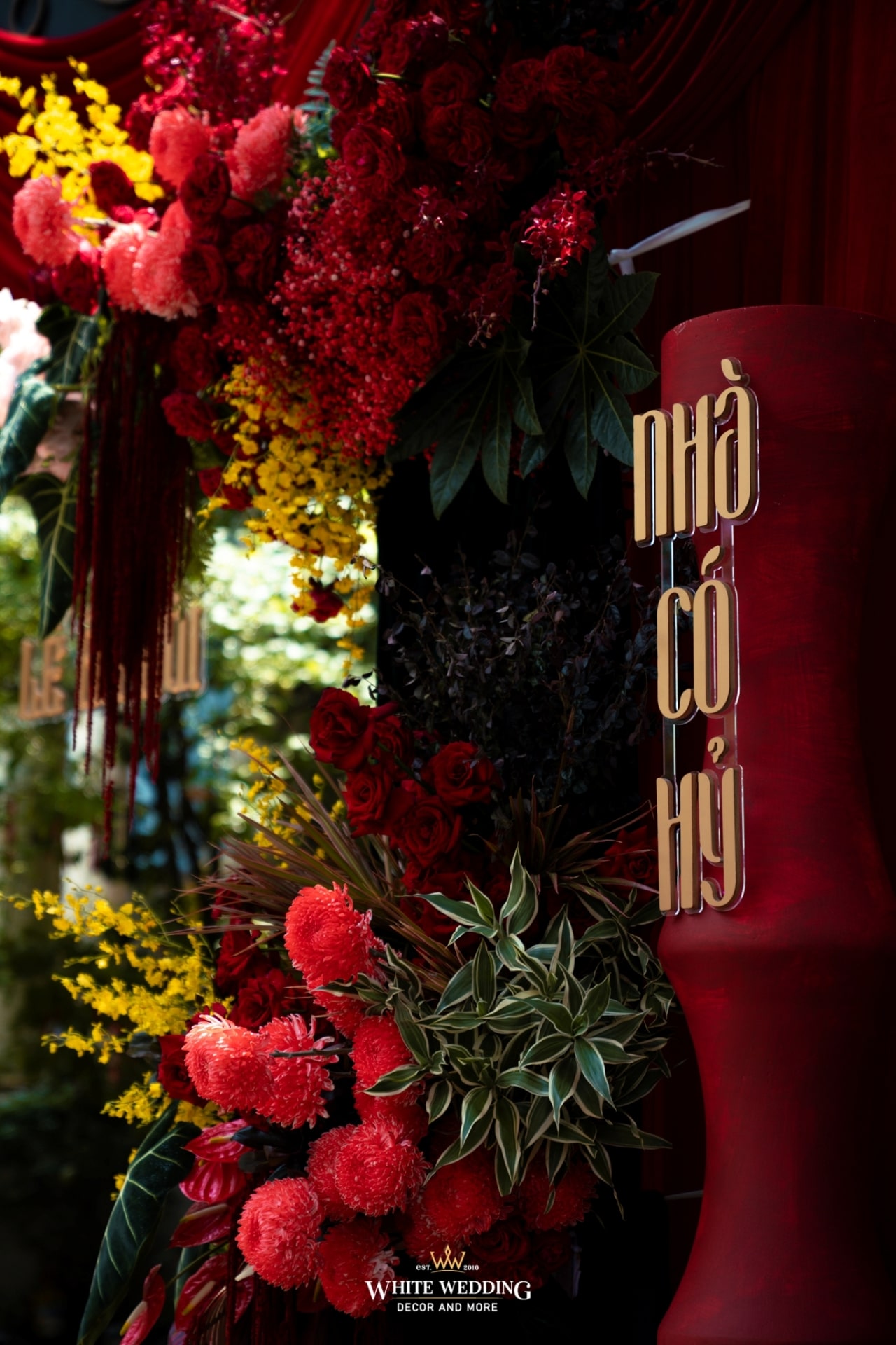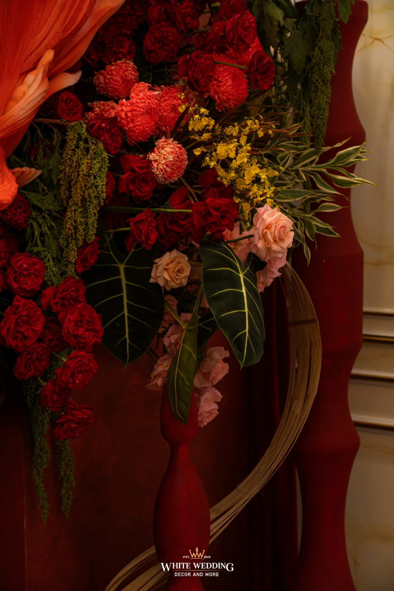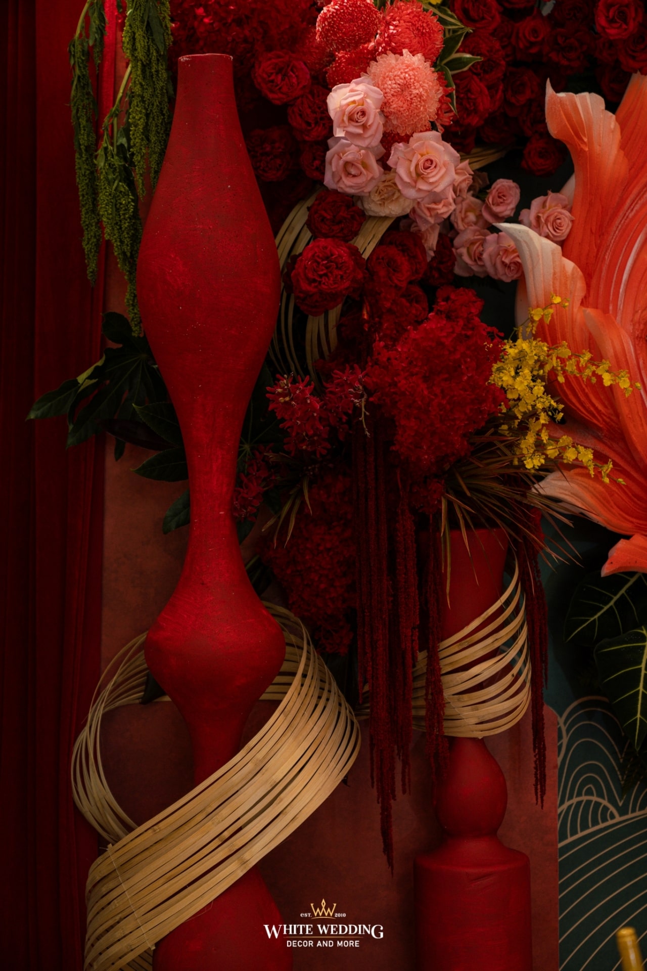 Không gian xung quanh cũng được chăm chút tỉ mỉ với chất liệu tre nứa đặc trưng của Indochine, điểm xuyết vào đó là hoa hồng, cẩm tú cầu, cúc mẫu đơn… Tất cả hòa quyện trong bảng màu đỏ trầm – gam màu biểu tượng cho hỷ sự và may mắn – cùng những tông màu tương sinh như vàng đồng, cam đất và xanh lá đậm. Một bản phối vừa nổi bật thị giác, vừa có chiều sâu phong thủy, như một lời nguyện cầu an lành cho hành trình lứa đôi.