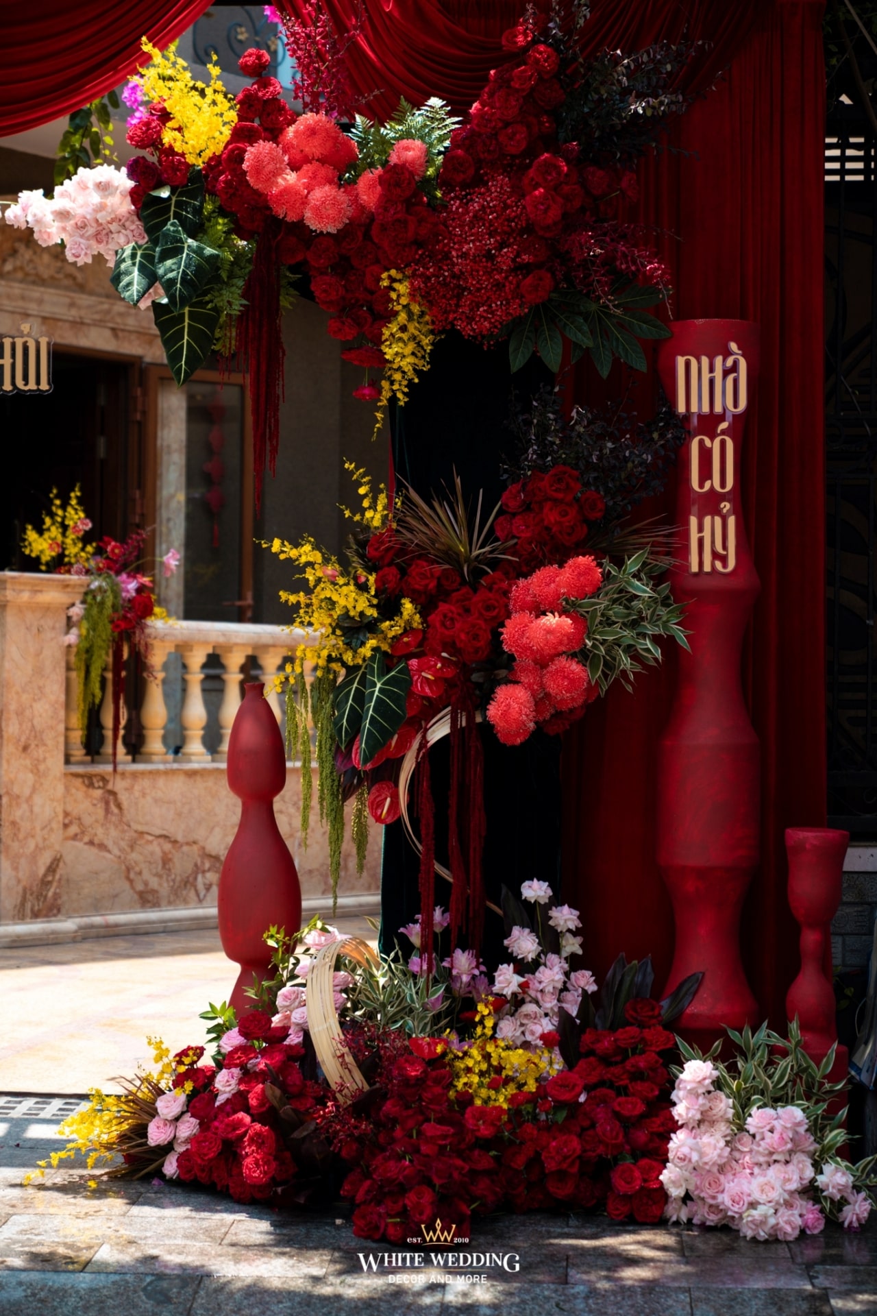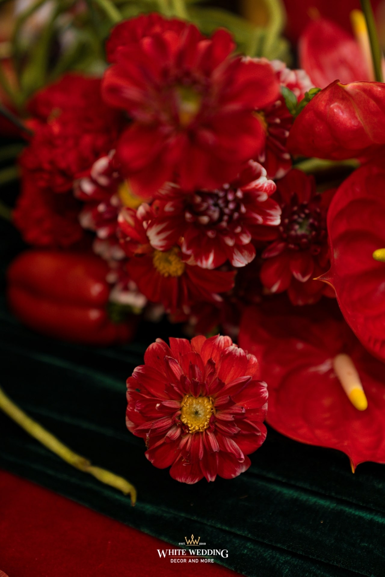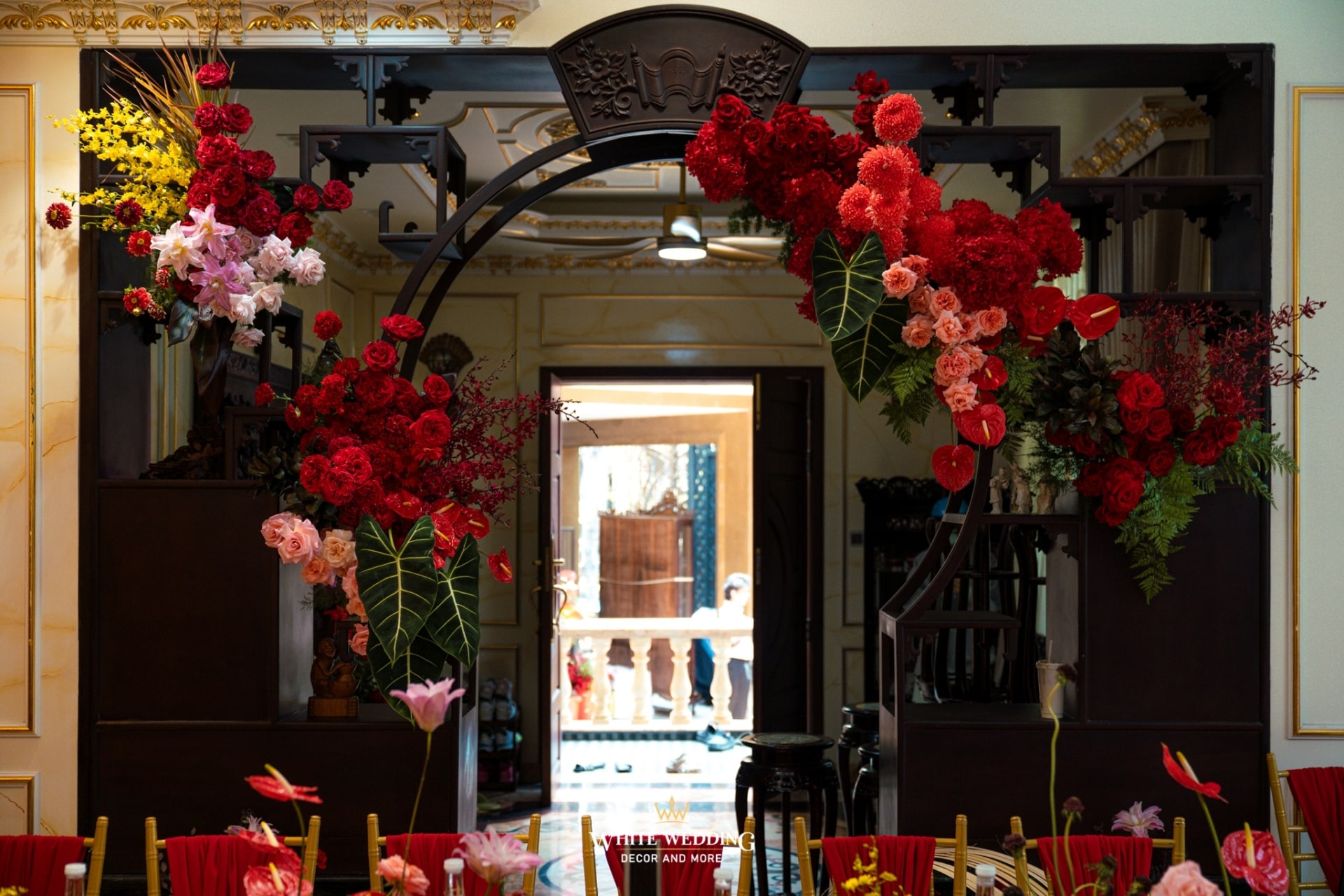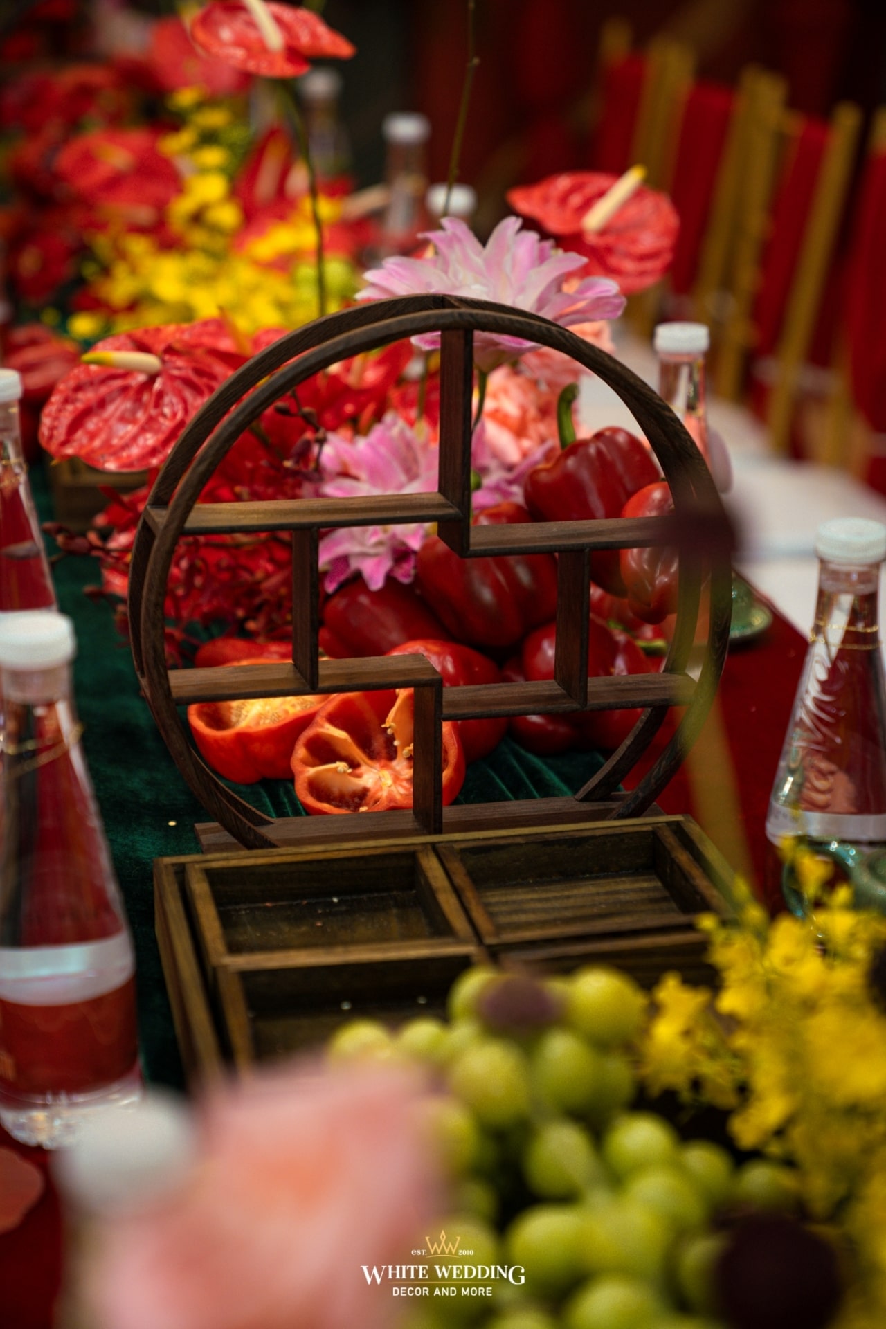 Không gian xung quanh cũng được chăm chút tỉ mỉ với chất liệu tre nứa đặc trưng của Indochine, điểm xuyết vào đó là hoa hồng, cẩm tú cầu, cúc mẫu đơn… Tất cả hòa quyện trong bảng màu đỏ trầm – gam màu biểu tượng cho hỷ sự và may mắn – cùng những tông màu tương sinh như vàng đồng, cam đất và xanh lá đậm. Một bản phối vừa nổi bật thị giác, vừa có chiều sâu phong thủy, như một lời nguyện cầu an lành cho hành trình lứa đôi.