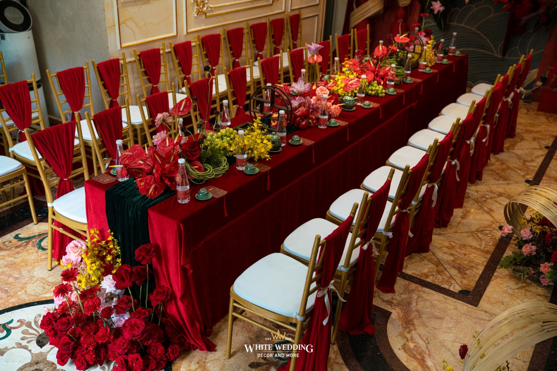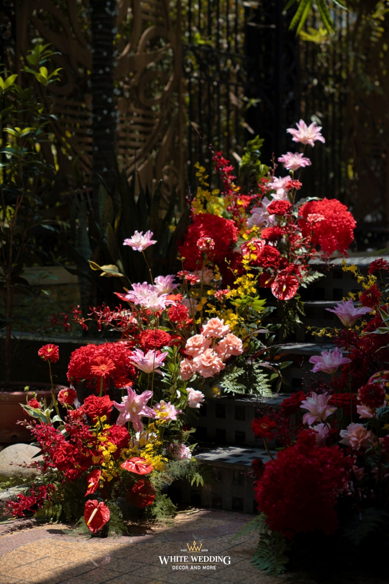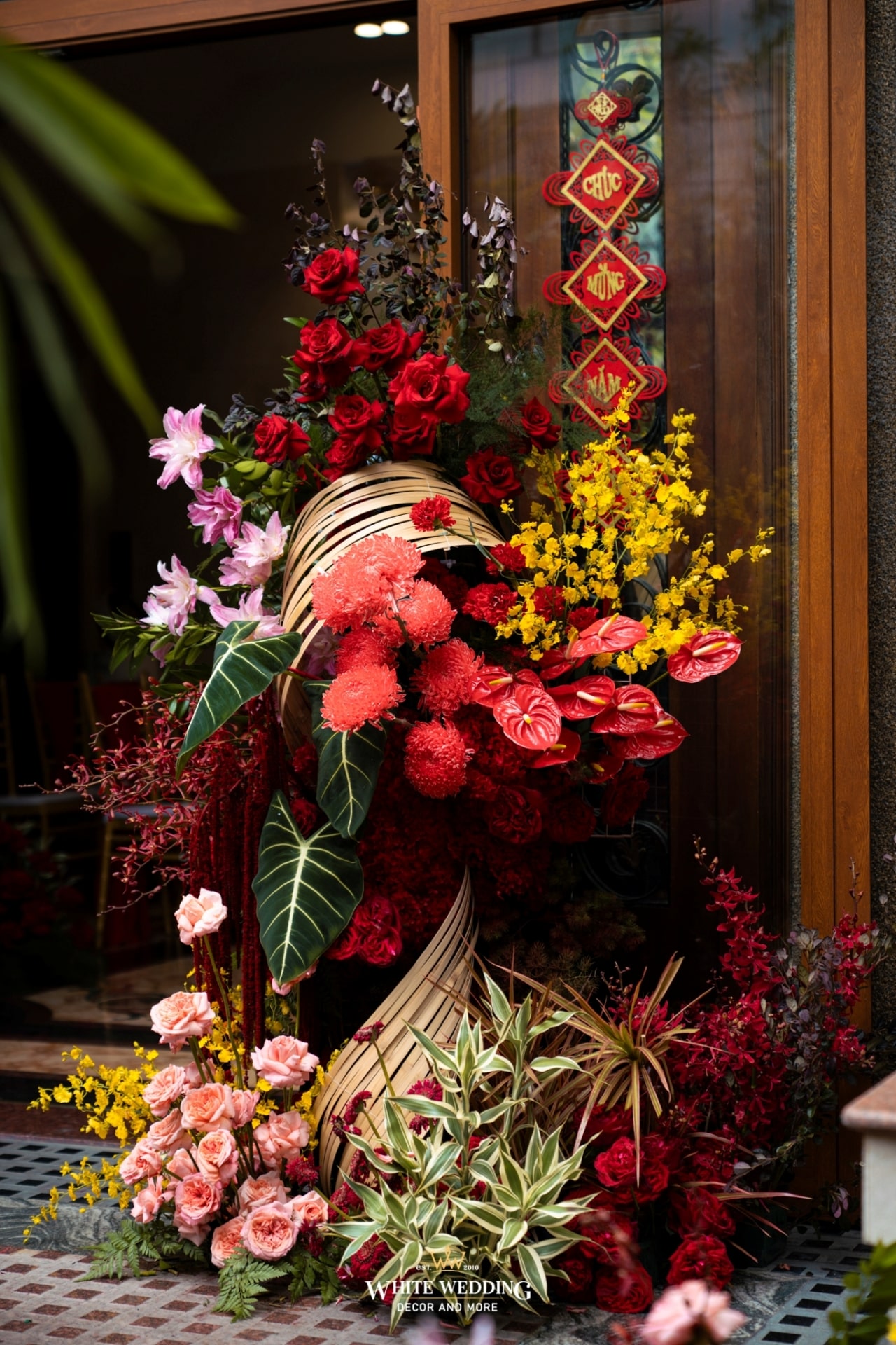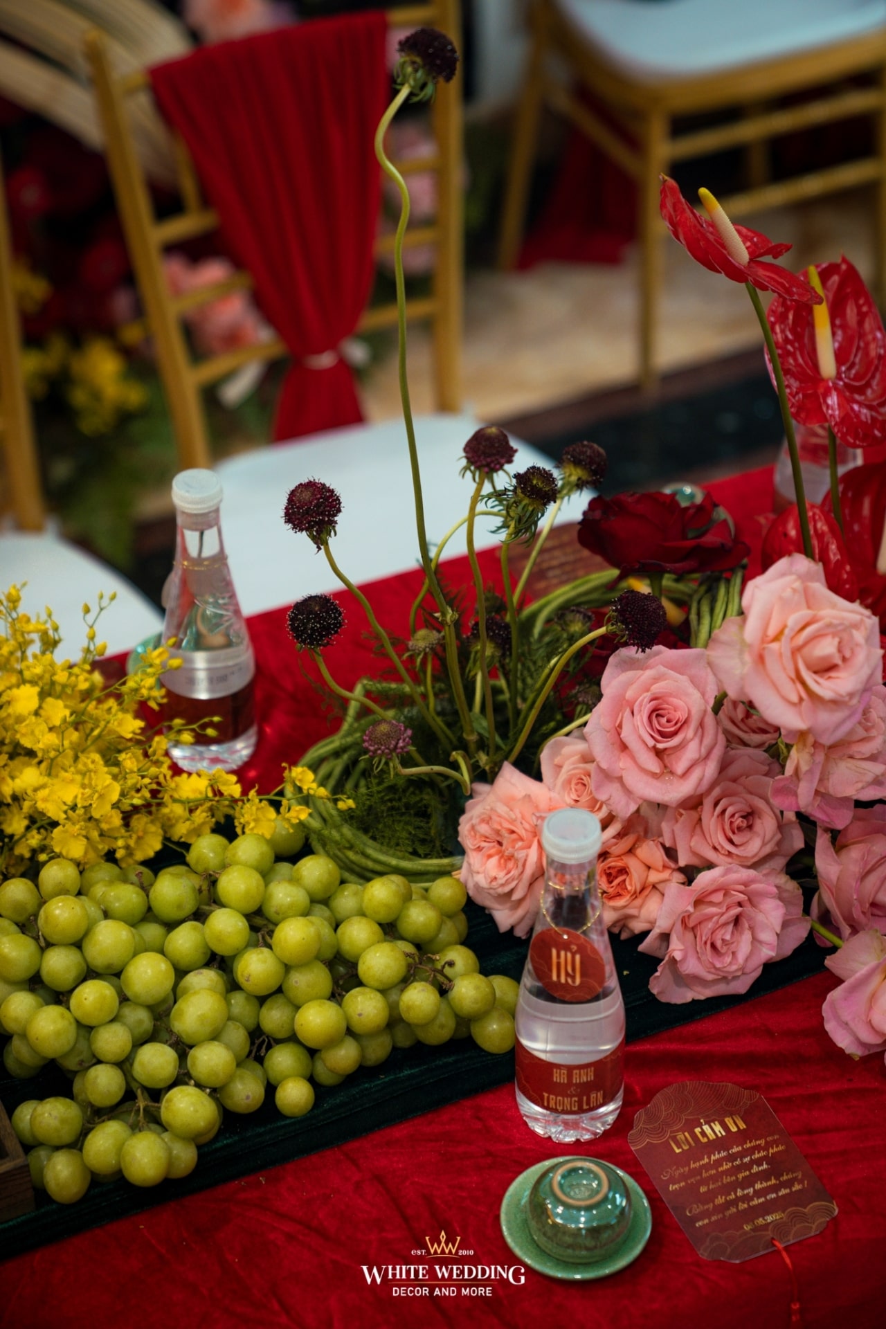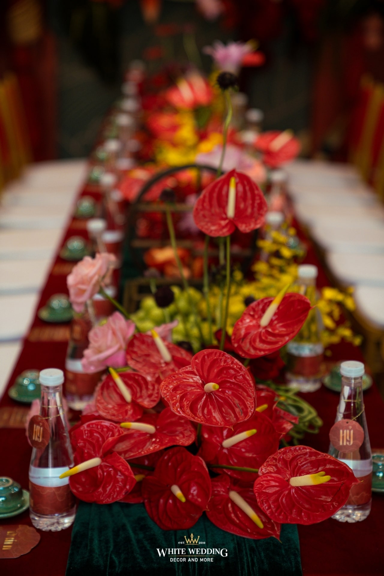 Không gian xung quanh cũng được chăm chút tỉ mỉ với chất liệu tre nứa đặc trưng của Indochine, điểm xuyết vào đó là hoa hồng, cẩm tú cầu, cúc mẫu đơn… Tất cả hòa quyện trong bảng màu đỏ trầm – gam màu biểu tượng cho hỷ sự và may mắn – cùng những tông màu tương sinh như vàng đồng, cam đất và xanh lá đậm. Một bản phối vừa nổi bật thị giác, vừa có chiều sâu phong thủy, như một lời nguyện cầu an lành cho hành trình lứa đôi.