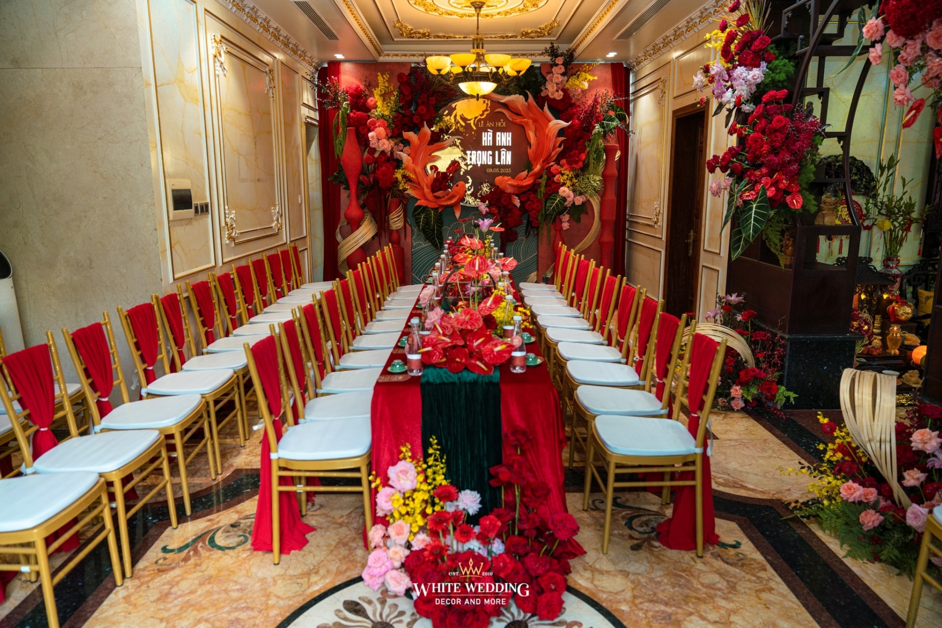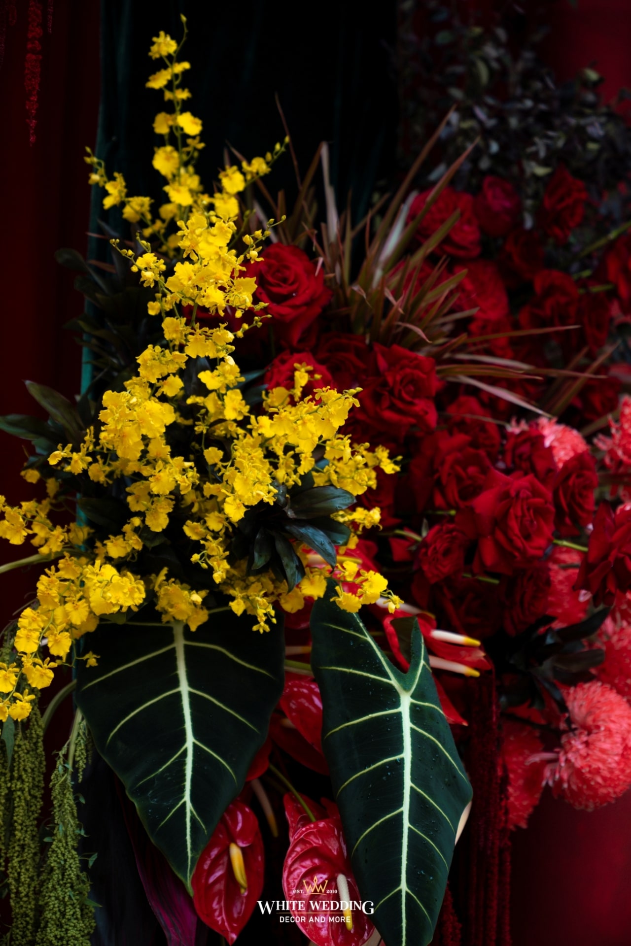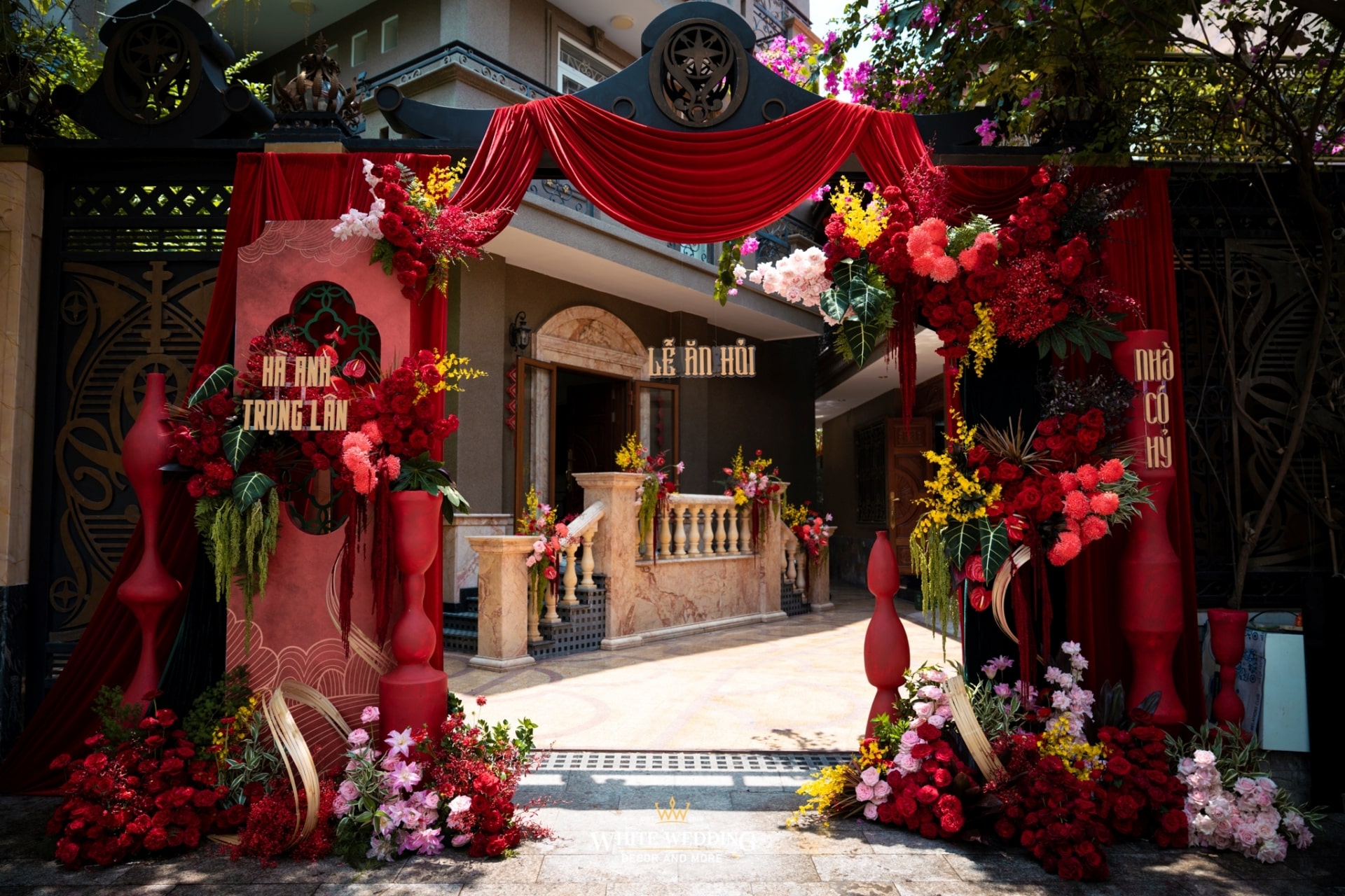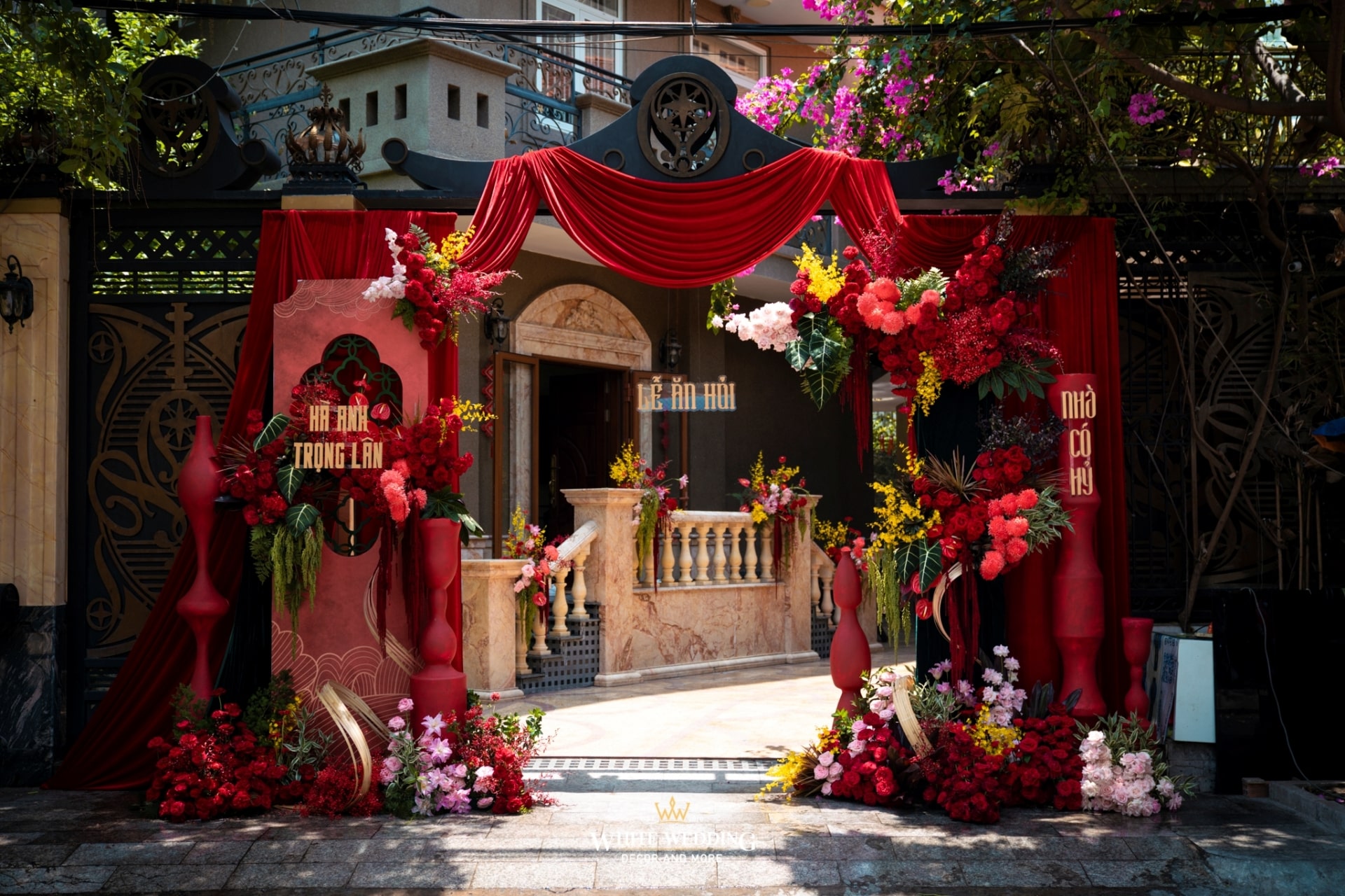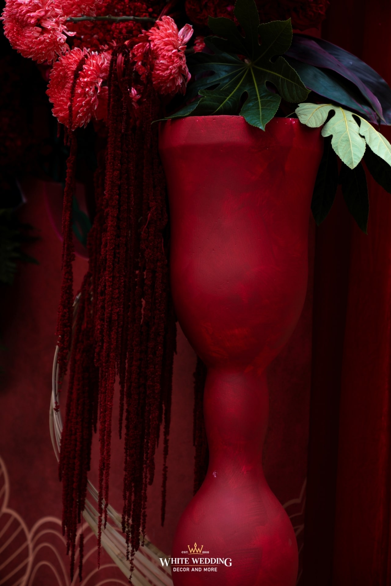 Không gian xung quanh cũng được chăm chút tỉ mỉ với chất liệu tre nứa đặc trưng của Indochine, điểm xuyết vào đó là hoa hồng, cẩm tú cầu, cúc mẫu đơn… Tất cả hòa quyện trong bảng màu đỏ trầm – gam màu biểu tượng cho hỷ sự và may mắn – cùng những tông màu tương sinh như vàng đồng, cam đất và xanh lá đậm. Một bản phối vừa nổi bật thị giác, vừa có chiều sâu phong thủy, như một lời nguyện cầu an lành cho hành trình lứa đôi.