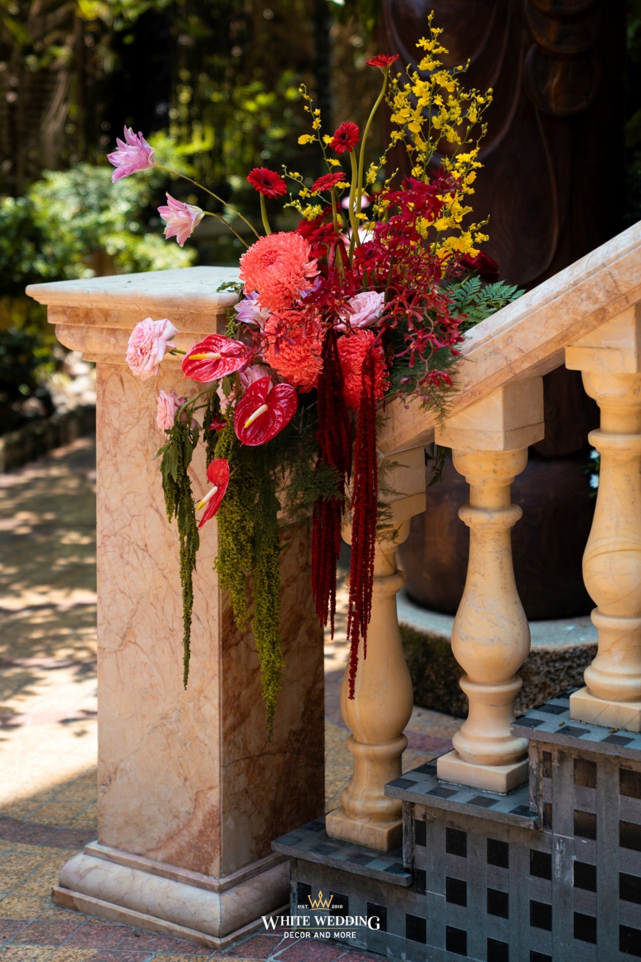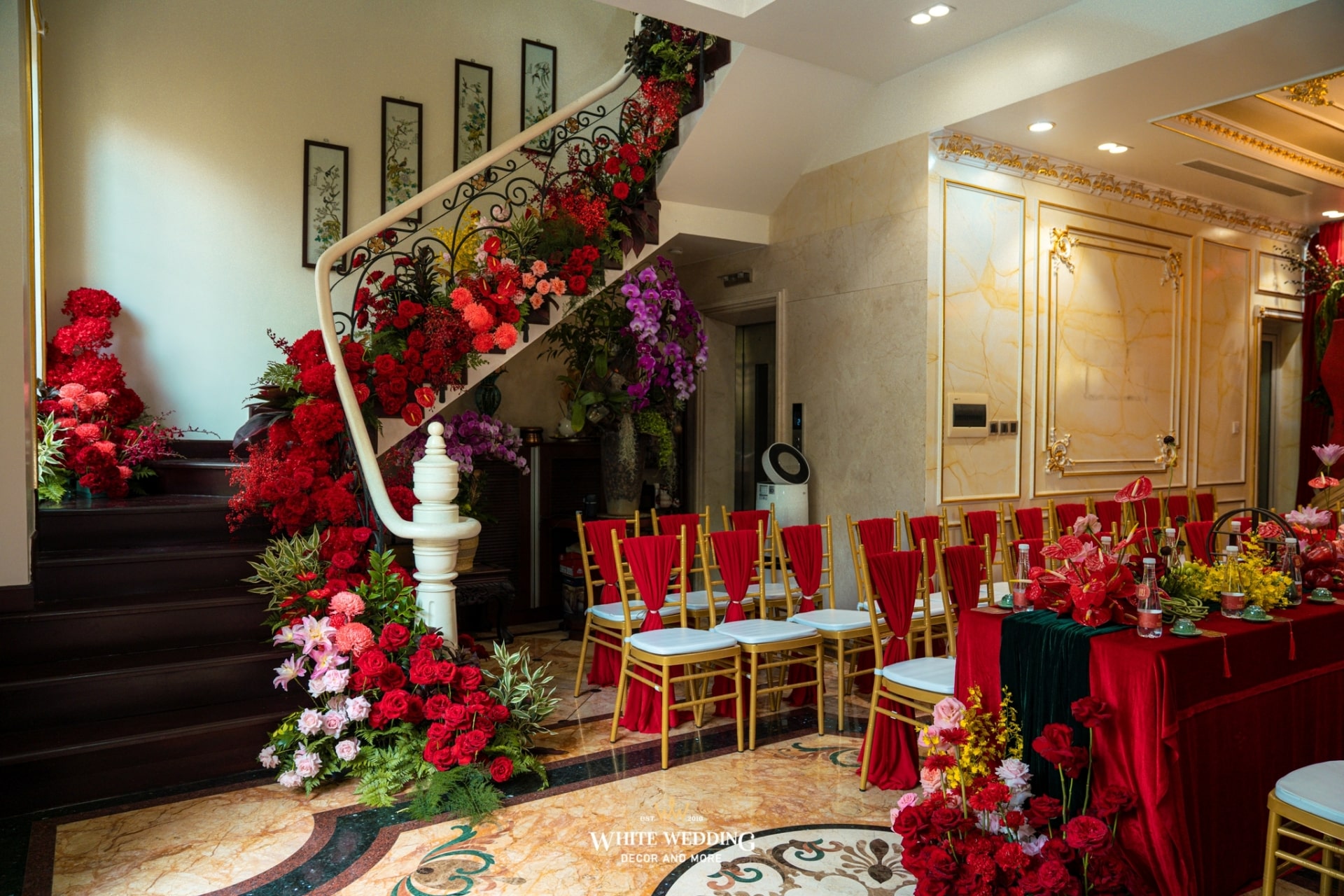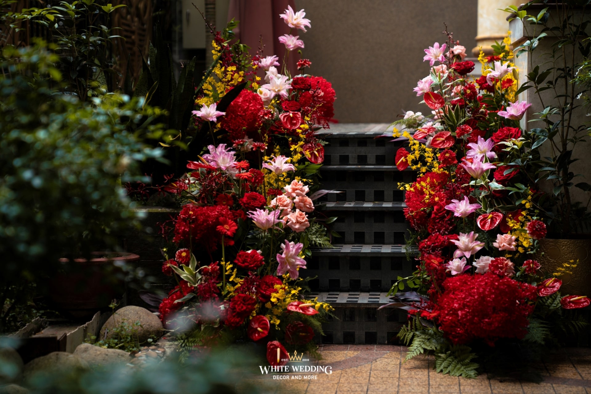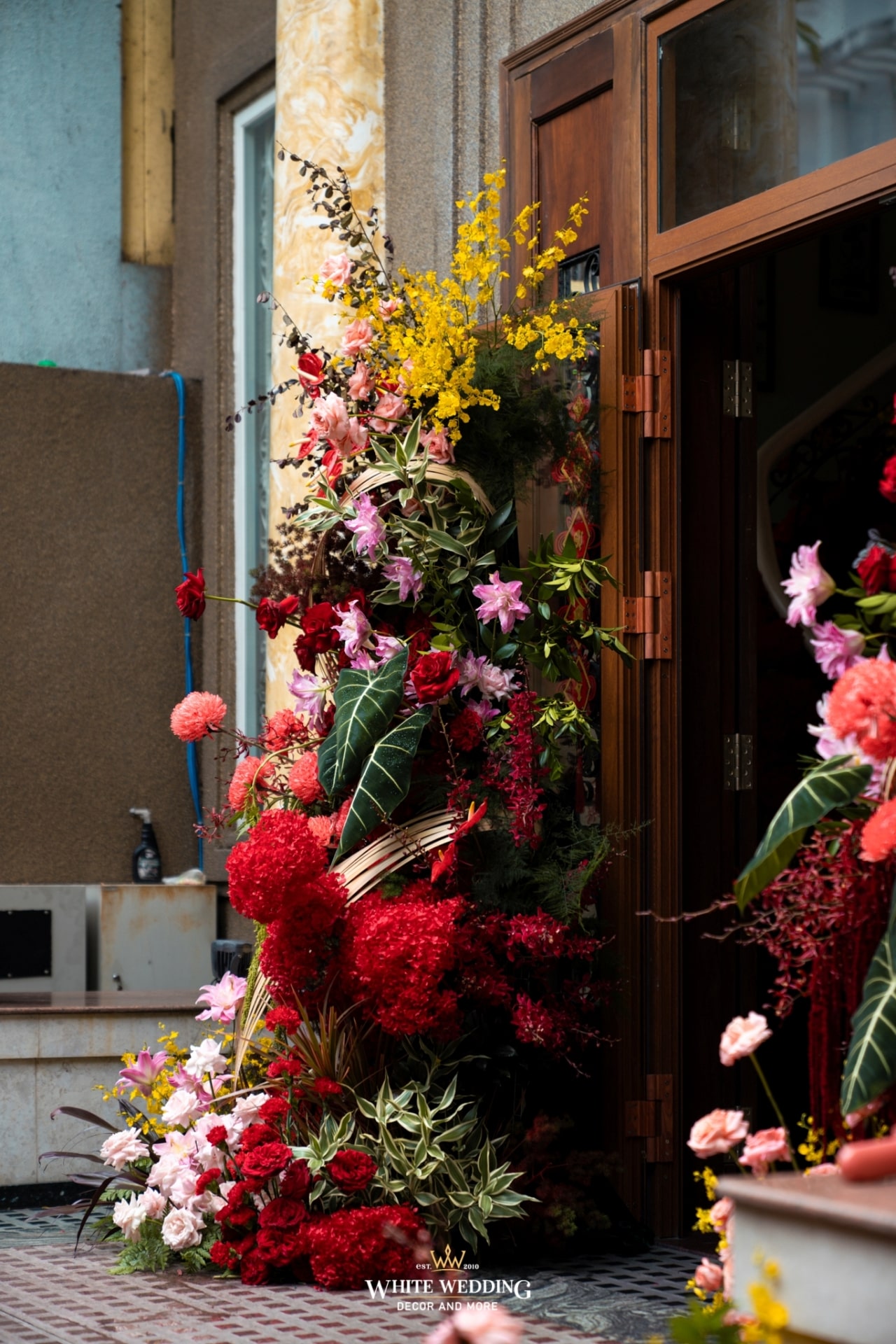 Không gian xung quanh cũng được chăm chút tỉ mỉ với chất liệu tre nứa đặc trưng của Indochine, điểm xuyết vào đó là hoa hồng, cẩm tú cầu, cúc mẫu đơn… Tất cả hòa quyện trong bảng màu đỏ trầm – gam màu biểu tượng cho hỷ sự và may mắn – cùng những tông màu tương sinh như vàng đồng, cam đất và xanh lá đậm. Một bản phối vừa nổi bật thị giác, vừa có chiều sâu phong thủy, như một lời nguyện cầu an lành cho hành trình lứa đôi.
