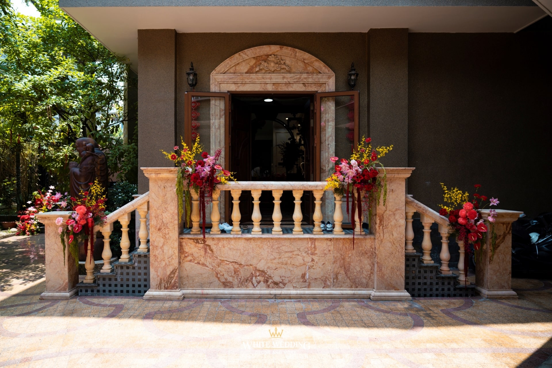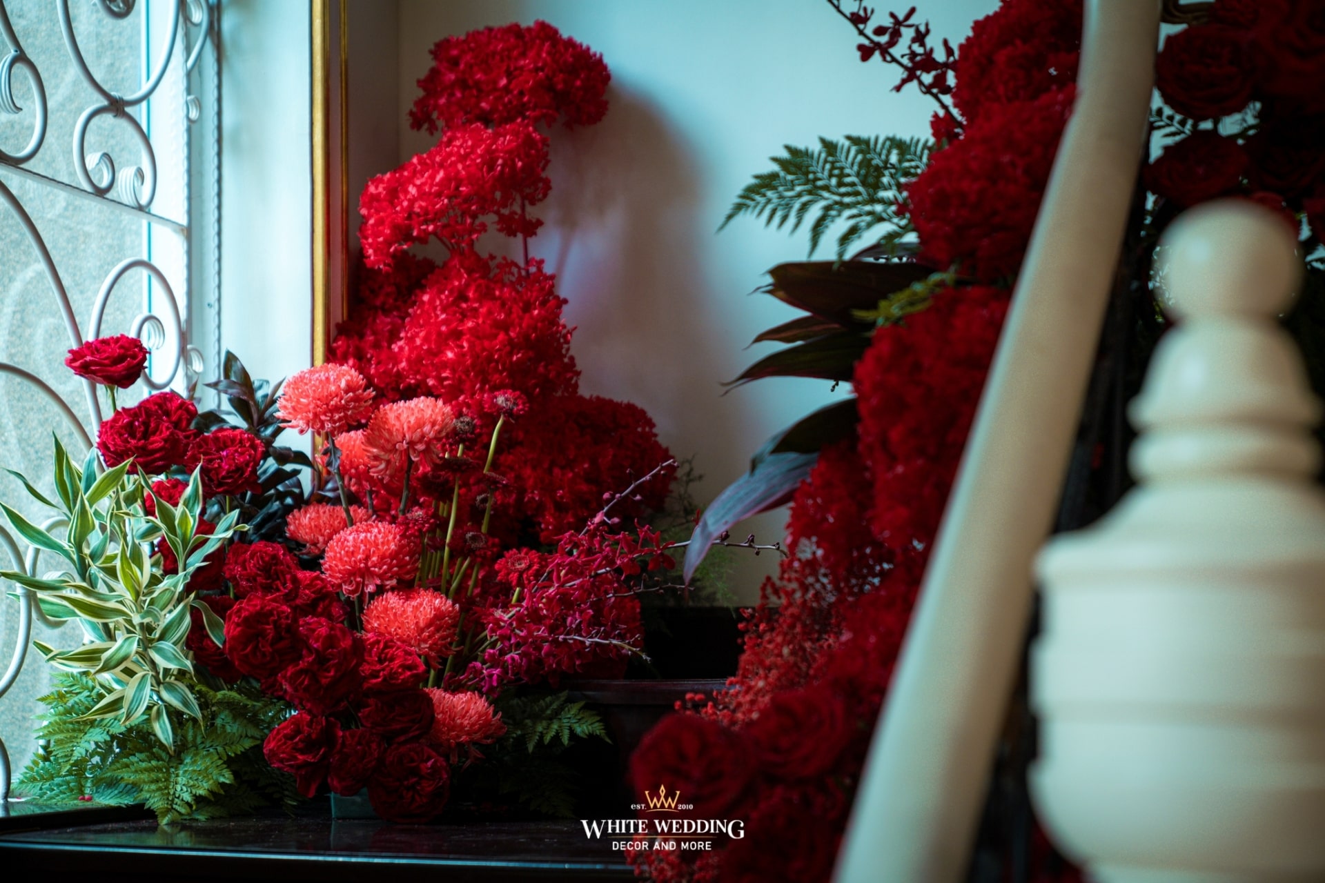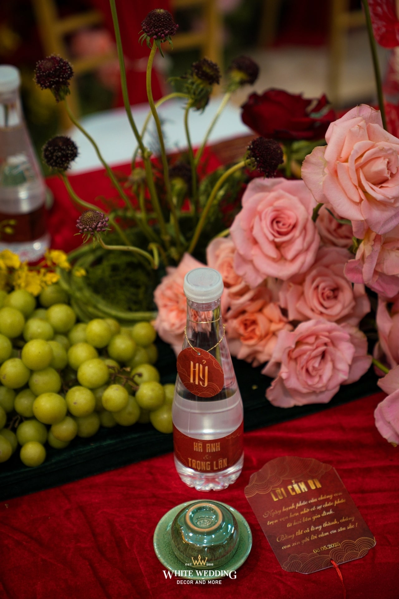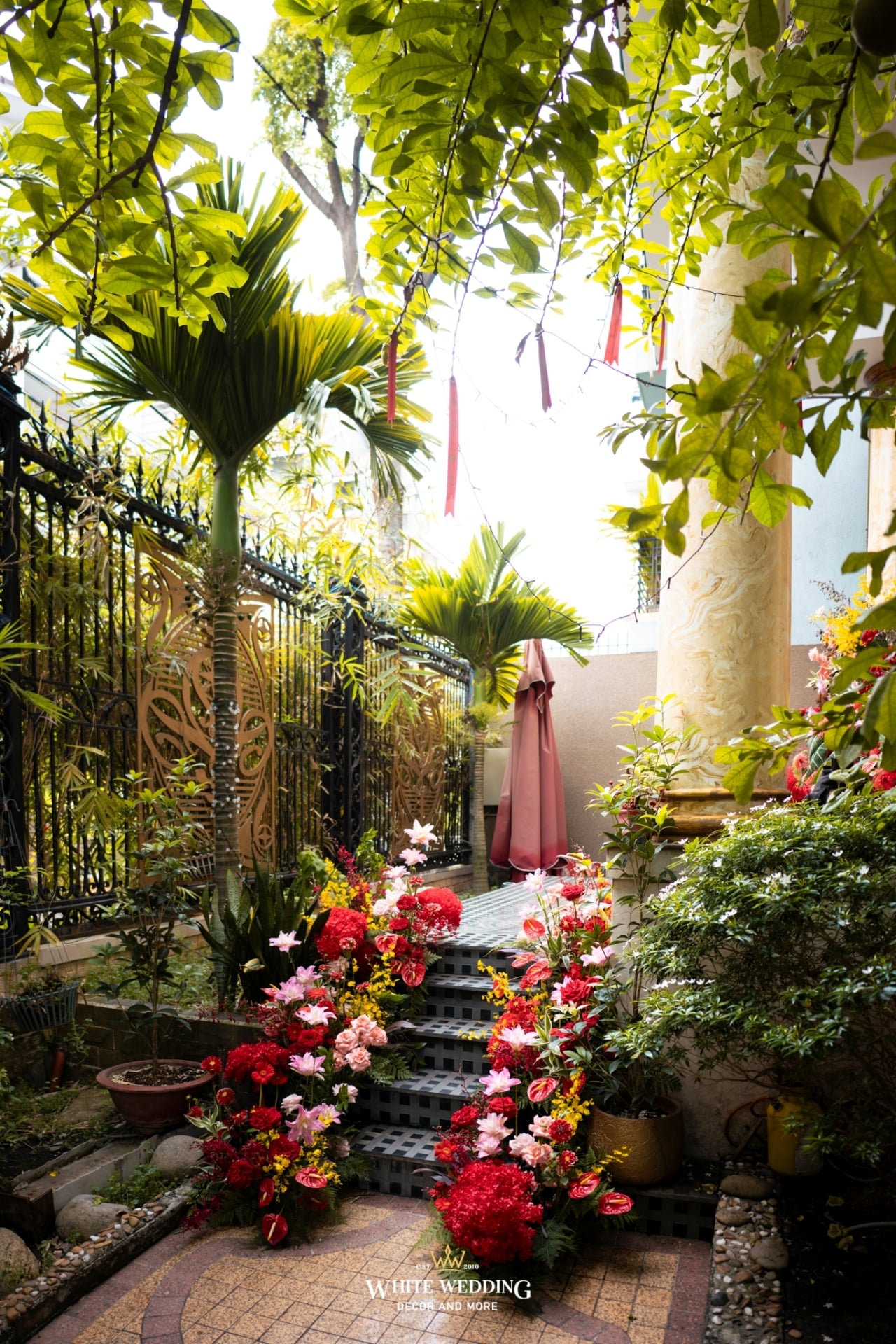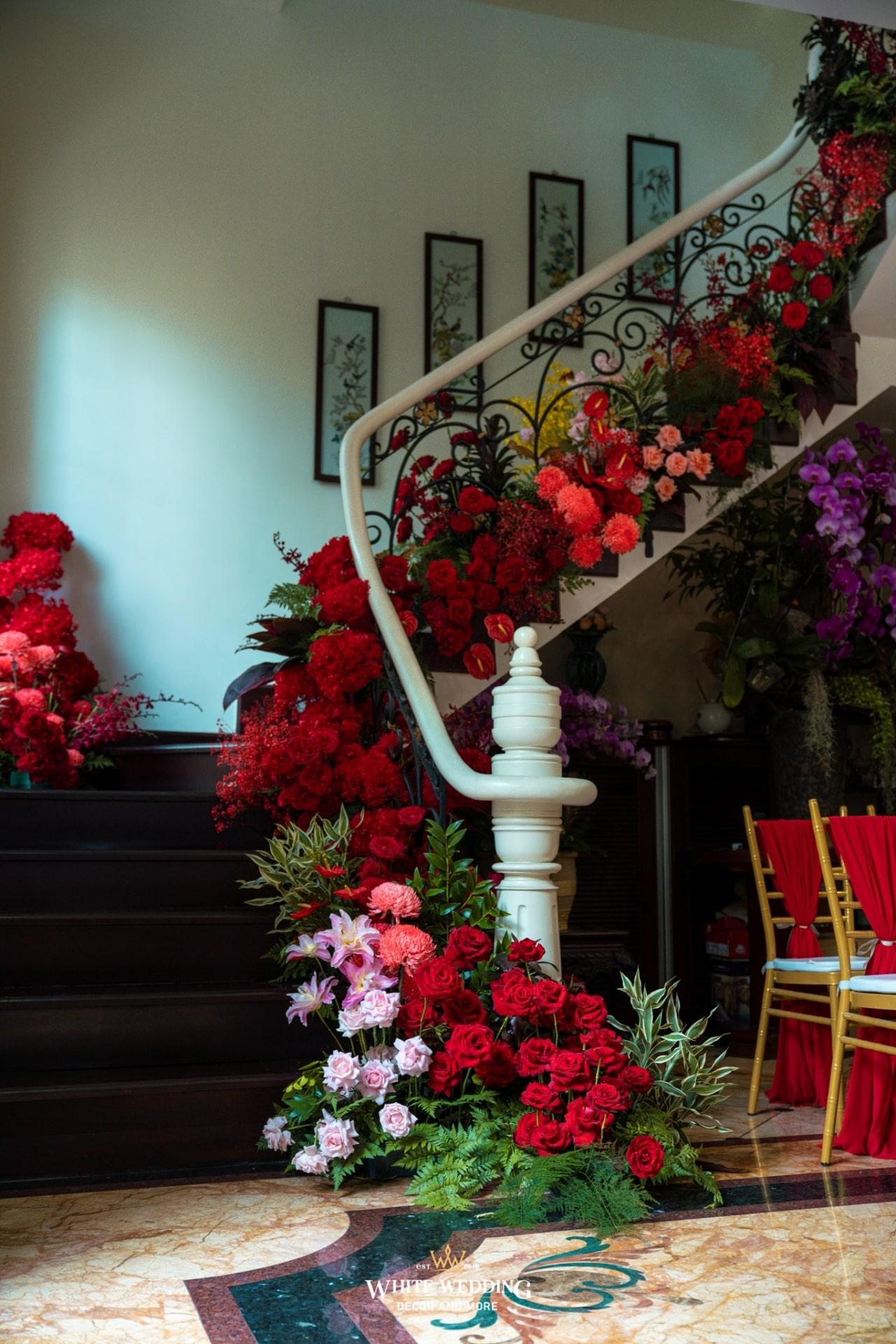 Không gian xung quanh cũng được chăm chút tỉ mỉ với chất liệu tre nứa đặc trưng của Indochine, điểm xuyết vào đó là hoa hồng, cẩm tú cầu, cúc mẫu đơn… Tất cả hòa quyện trong bảng màu đỏ trầm – gam màu biểu tượng cho hỷ sự và may mắn – cùng những tông màu tương sinh như vàng đồng, cam đất và xanh lá đậm. Một bản phối vừa nổi bật thị giác, vừa có chiều sâu phong thủy, như một lời nguyện cầu an lành cho hành trình lứa đôi.