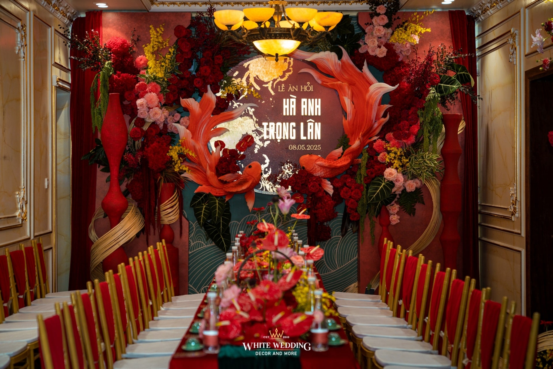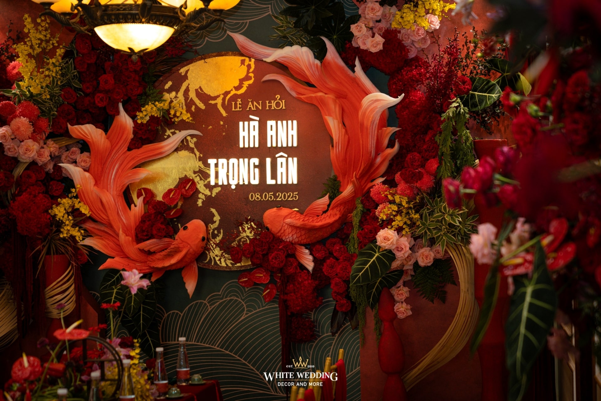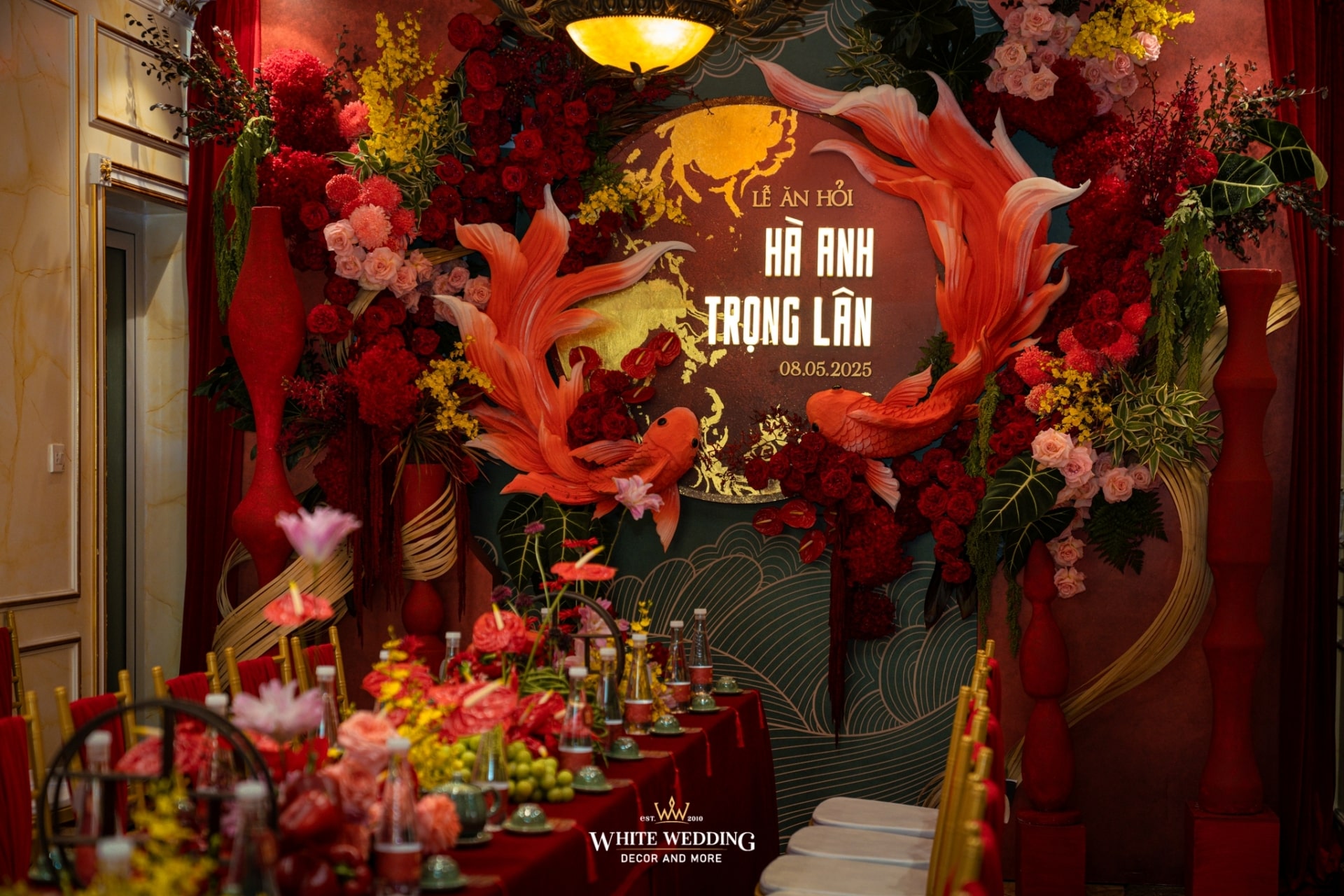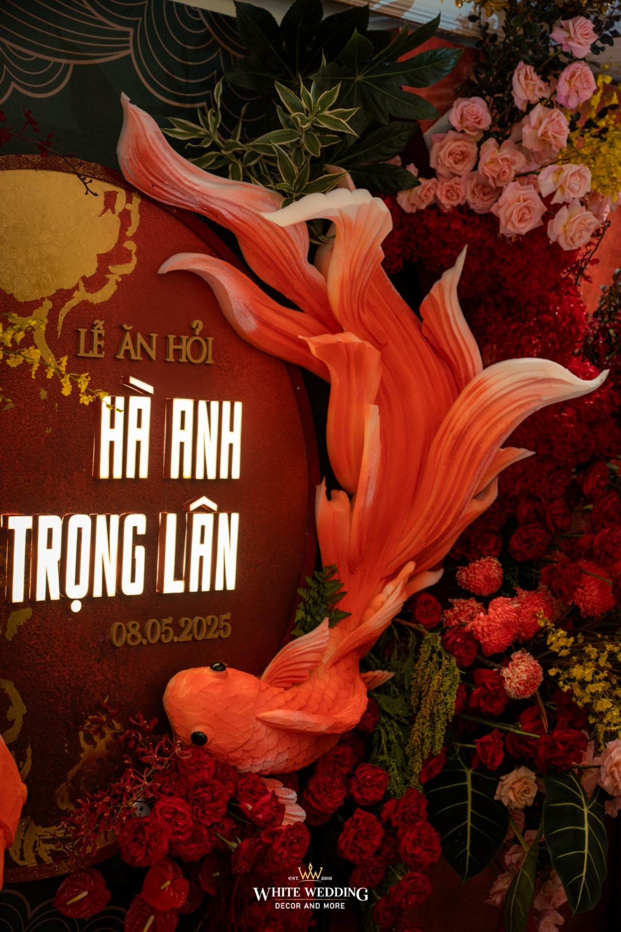 Với White, mỗi biểu tượng trong thiết kế không chỉ là điểm nhấn thị giác mà còn là lời chúc phúc được gửi gắm qua từng lớp nghĩa văn hoá. Nếu chim công tượng trưng cho sự vương giả, sếu đầu đỏ gợi nhắc đến sự thủy chung, thì trong lễ ăn hỏi của Trọng Lân & Hà Anh, cùng Lynh Thùy đã chọn hình tượng cá chép – biểu trưng cho hòa hợp, viên mãn và thịnh vượng – làm tâm điểm trong concept ̛ ́ ́.