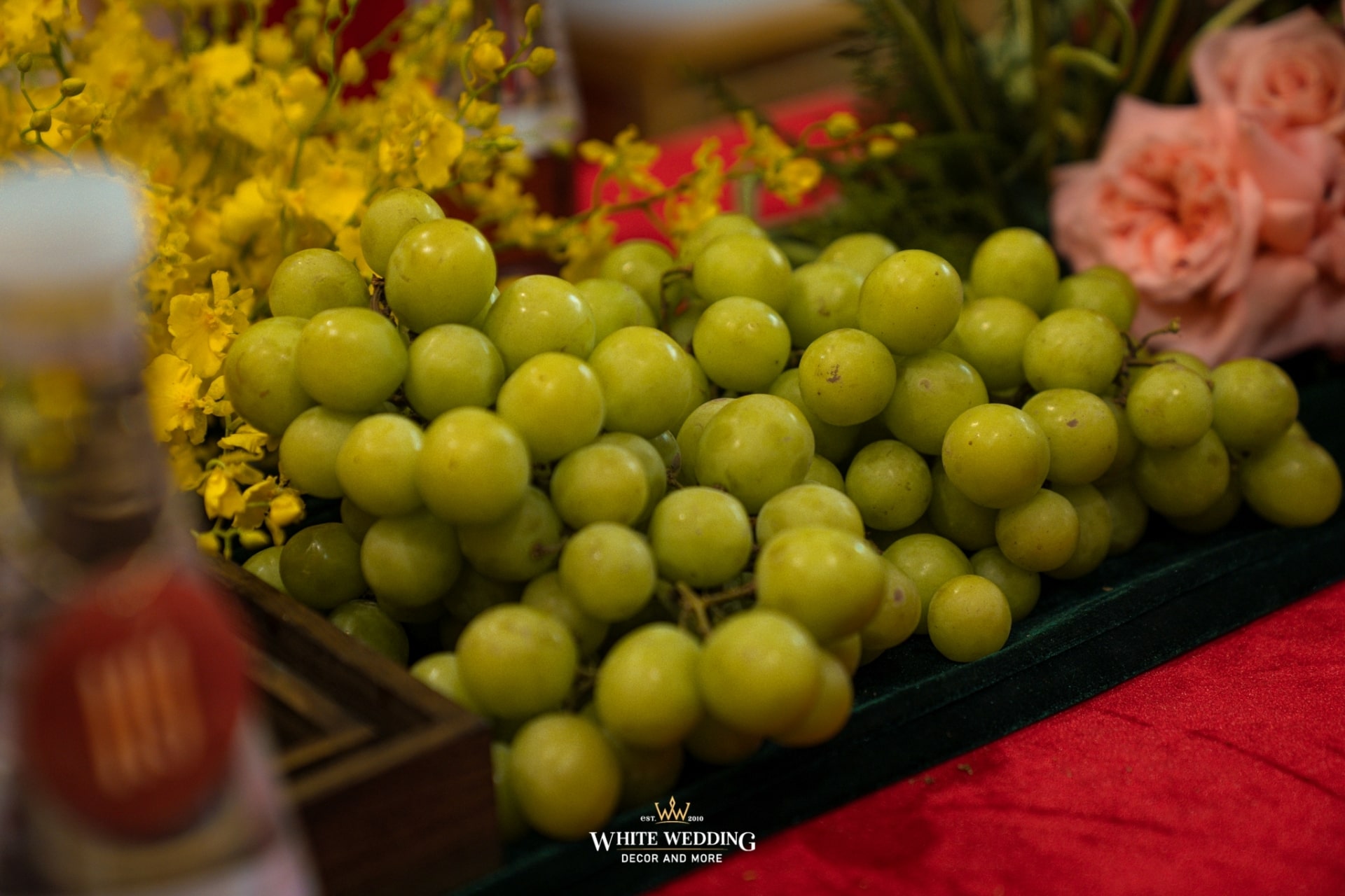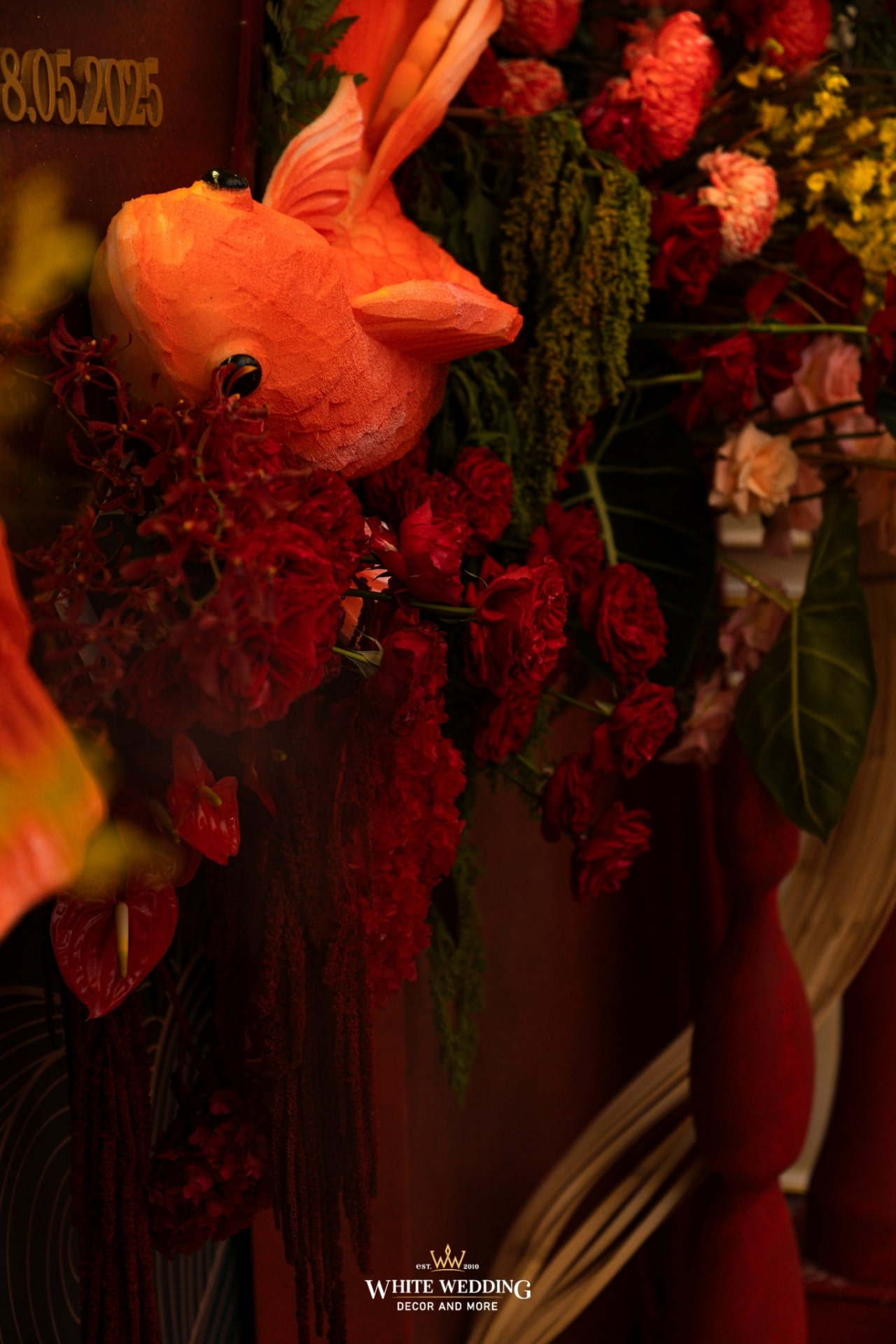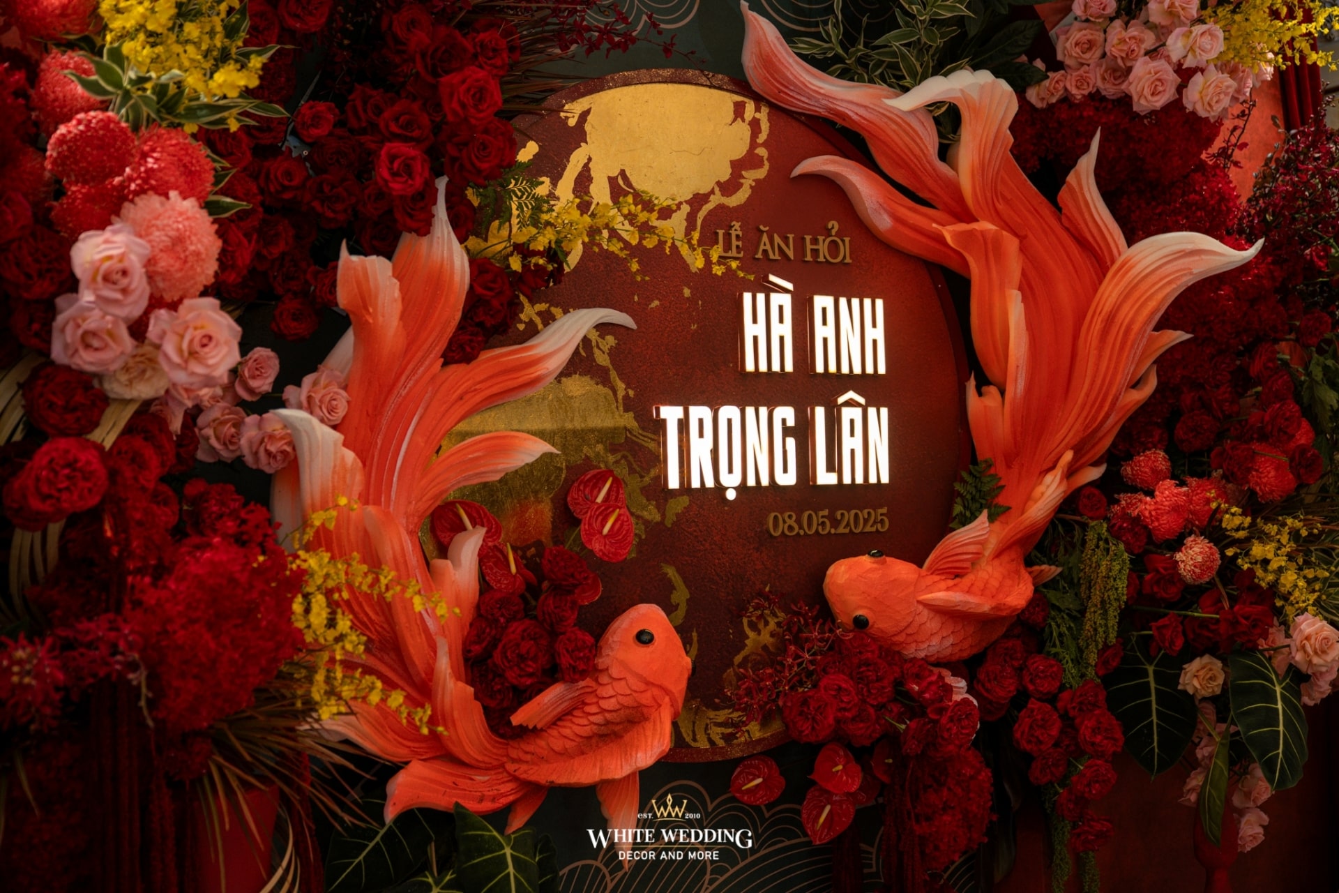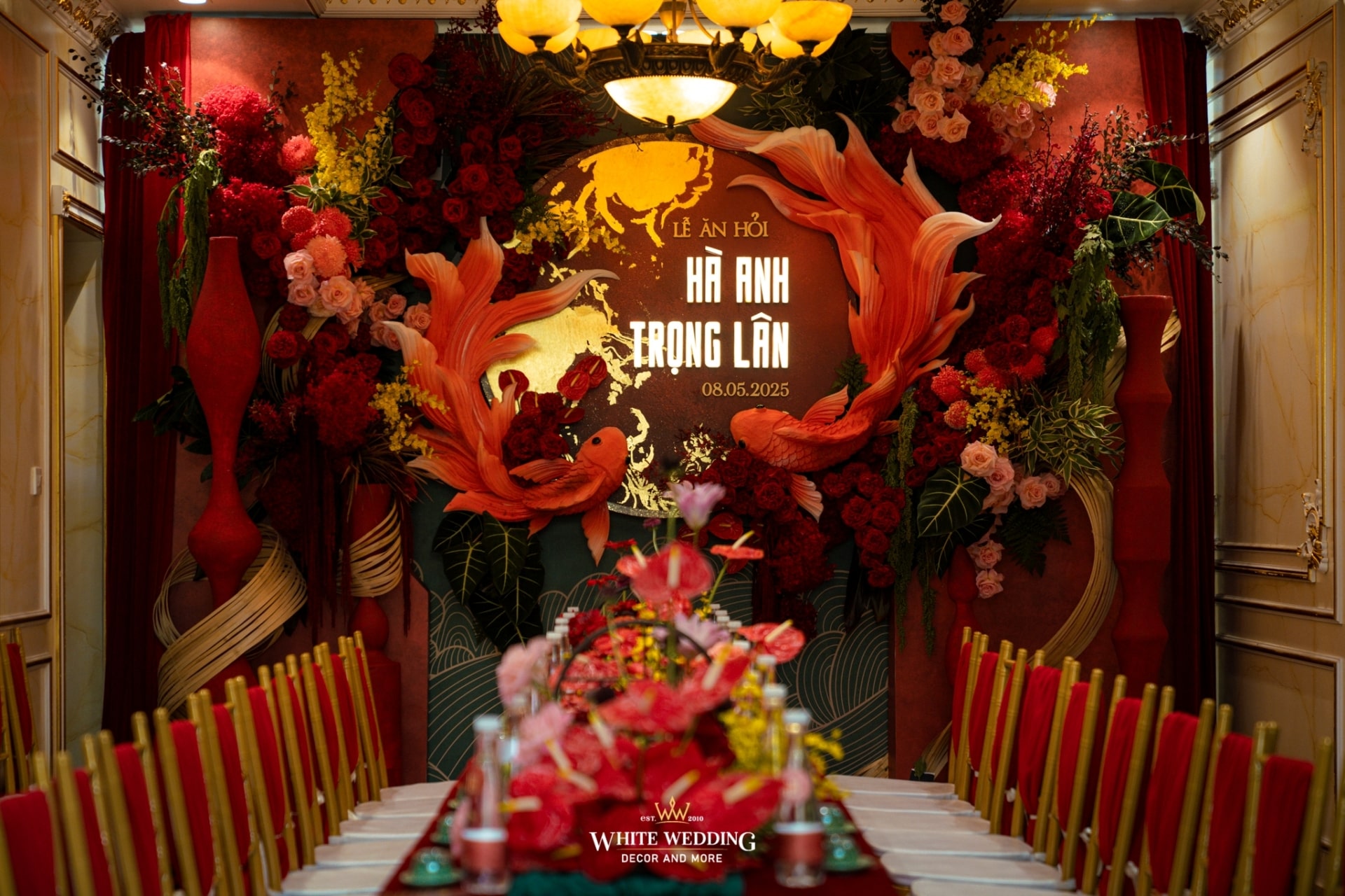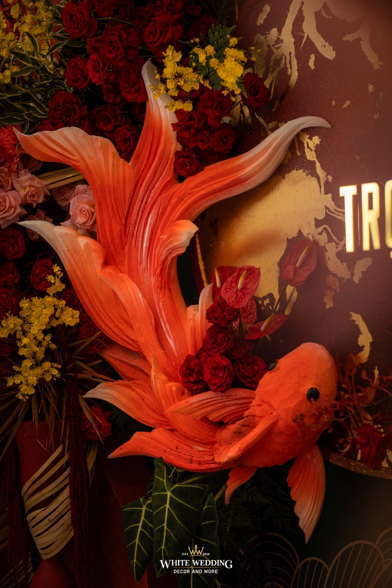 Với White, mỗi biểu tượng trong thiết kế không chỉ là điểm nhấn thị giác mà còn là lời chúc phúc được gửi gắm qua từng lớp nghĩa văn hoá. Nếu chim công tượng trưng cho sự vương giả, sếu đầu đỏ gợi nhắc đến sự thủy chung, thì trong lễ ăn hỏi của Trọng Lân & Hà Anh, cùng Lynh Thùy đã chọn hình tượng cá chép – biểu trưng cho hòa hợp, viên mãn và thịnh vượng – làm tâm điểm trong concept ̛ ́ ́.