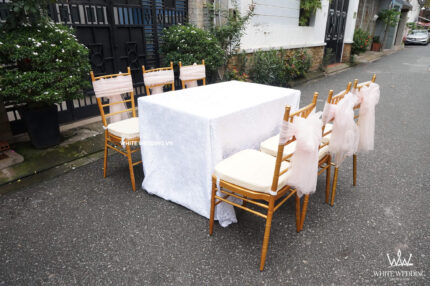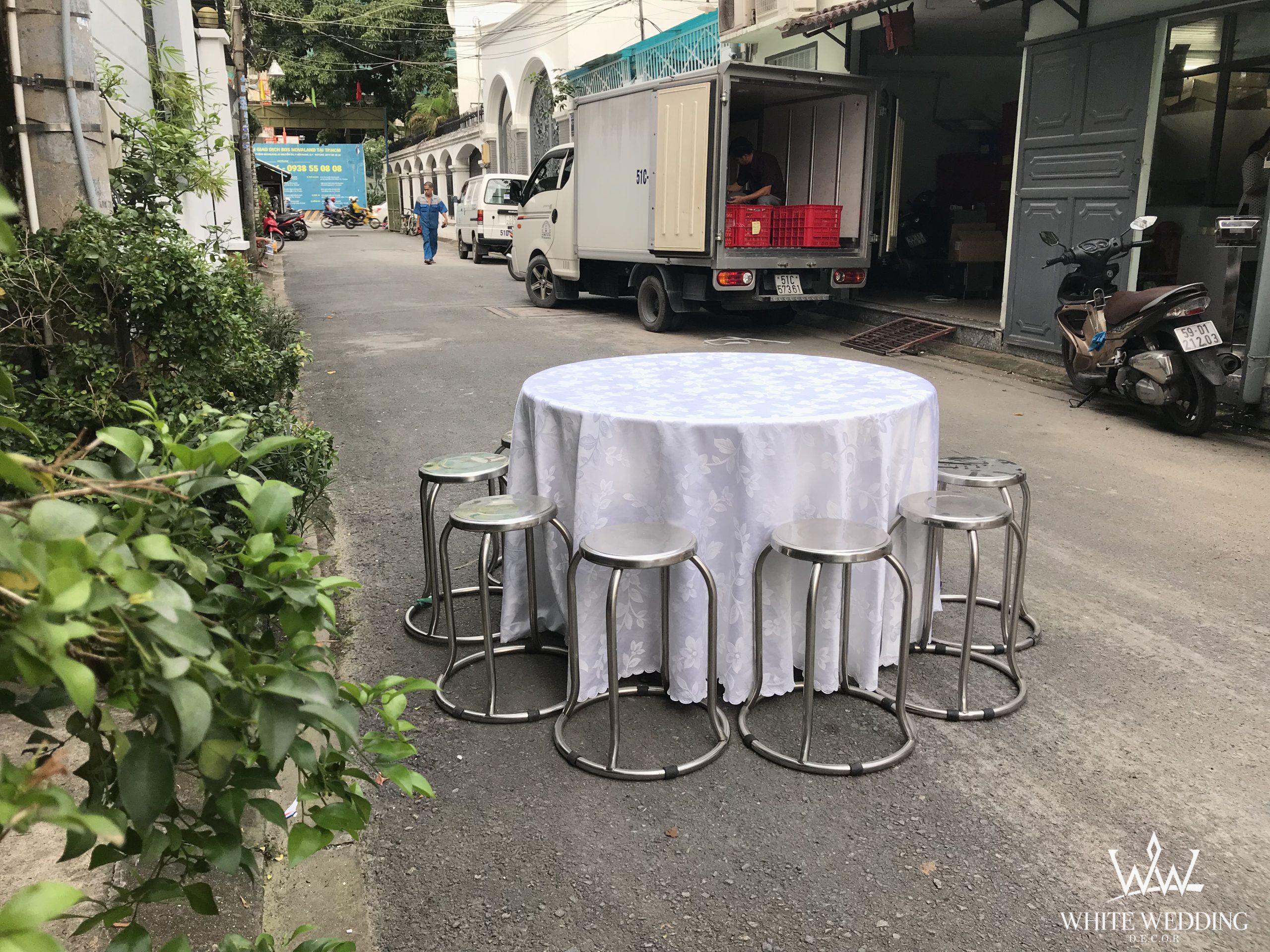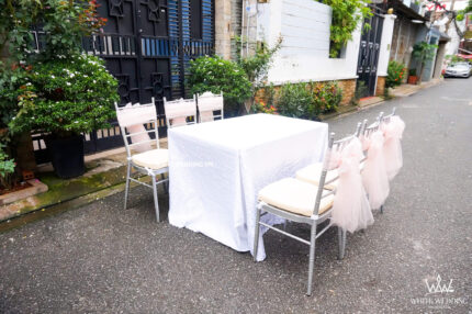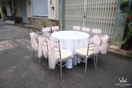 | ✔ Bộ bàn tròn ghế Inox: 350.000/bộ – 01 Bàn tròn 1m2 phủ gấm cao cấp – 10 ghế tiffany cột nơ theo tone màu trang trí |
