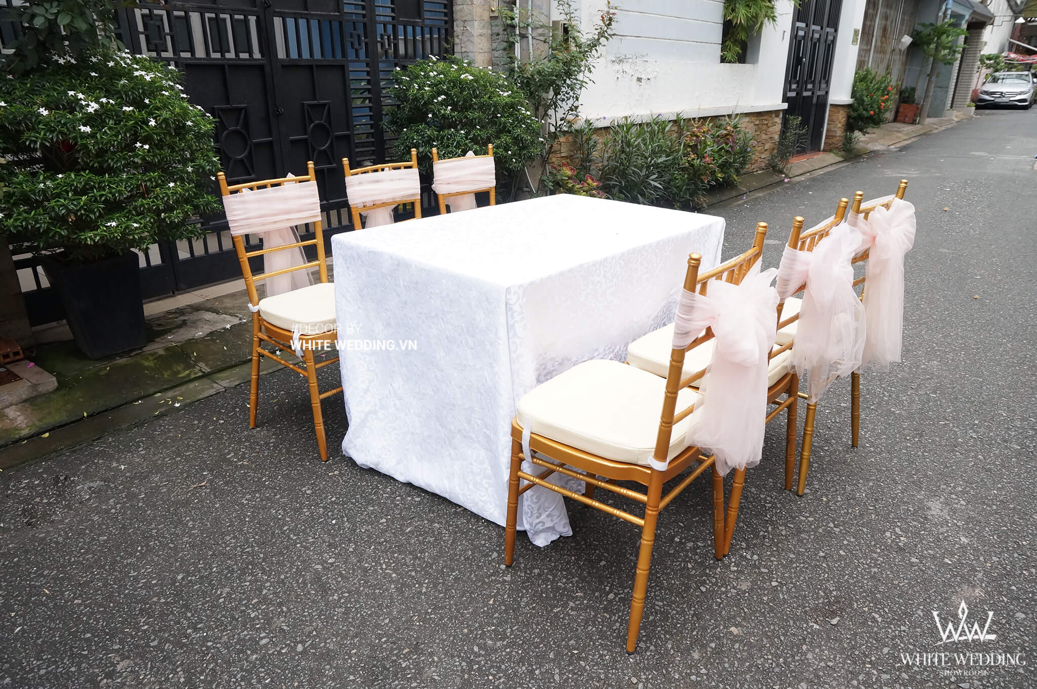 | ✔ Bộ Bàn Chữ Nhật Ghế Tiffany Gold: 540.000/bộ – 01 Bàn chữ nhật 1m2 phủ gấm cao cấp – 06 ghế tiffany cột nơ theo tone màu trang trí |
