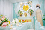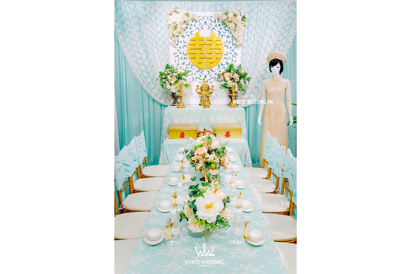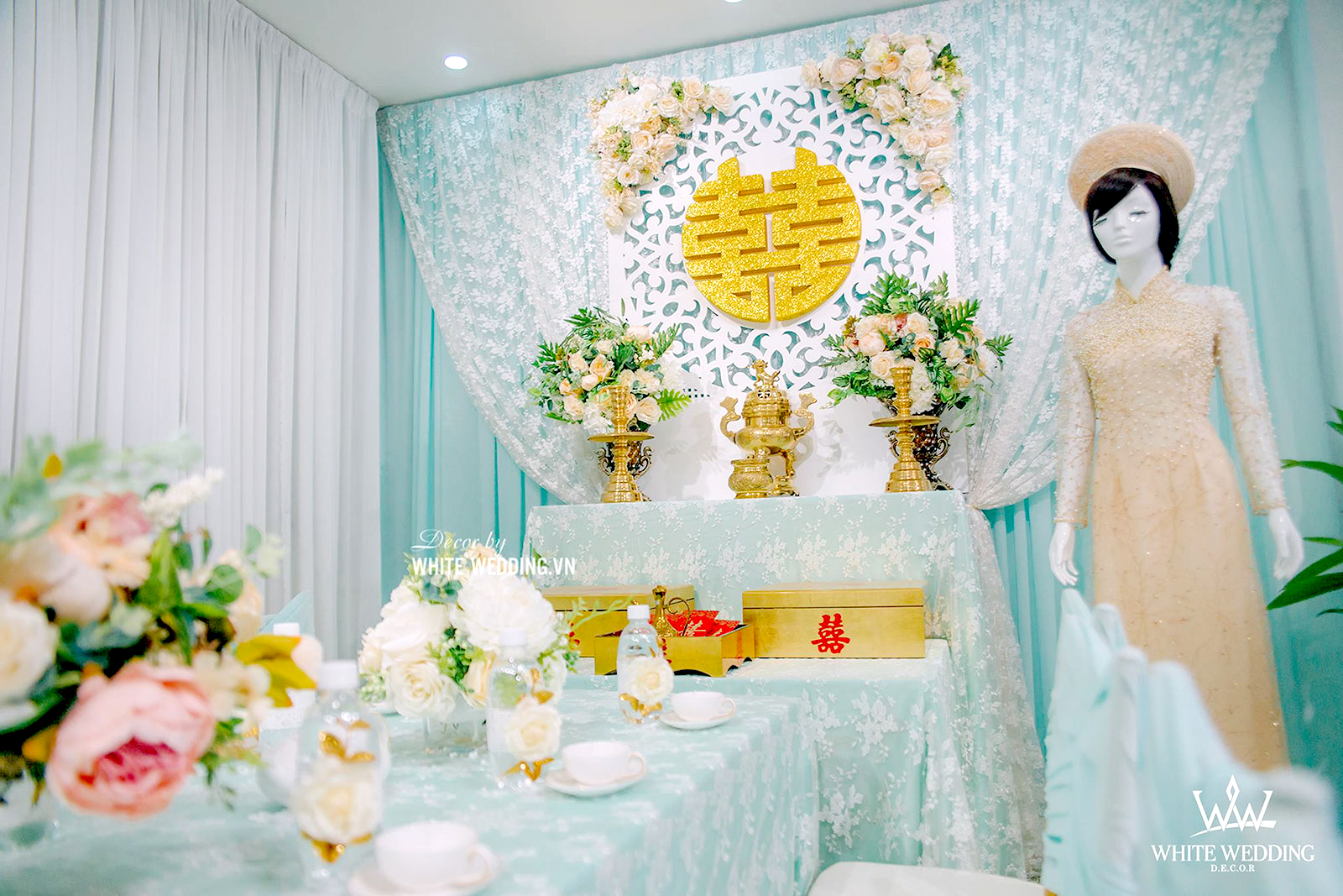 TRANG TRÍ GIA TIÊN THEO PHONG CÁCH VINTAGE ĐẸP MÊ Vintage xu hướng trang trí gia tiên chưa bao giờ giảm nhiệt, phong cách Vintage chính là sự pha trộn giữa phong cách cổ điển và hiện đại một cách hoàn hảo, tạo nên không gian ngày cưới thật sang trọng và ấn tượng. Lưu ý: • White Wedding sẽ tới nhà quý khách khảo sát trước khi trang trí set up. Thông thường set up hoàn thiện trước ngày lễ 1 ngày • Miễn phí phí vận chuyển và lắp đặt trang trí nhà trong vòng bán kính 5km (tính từ công ty)