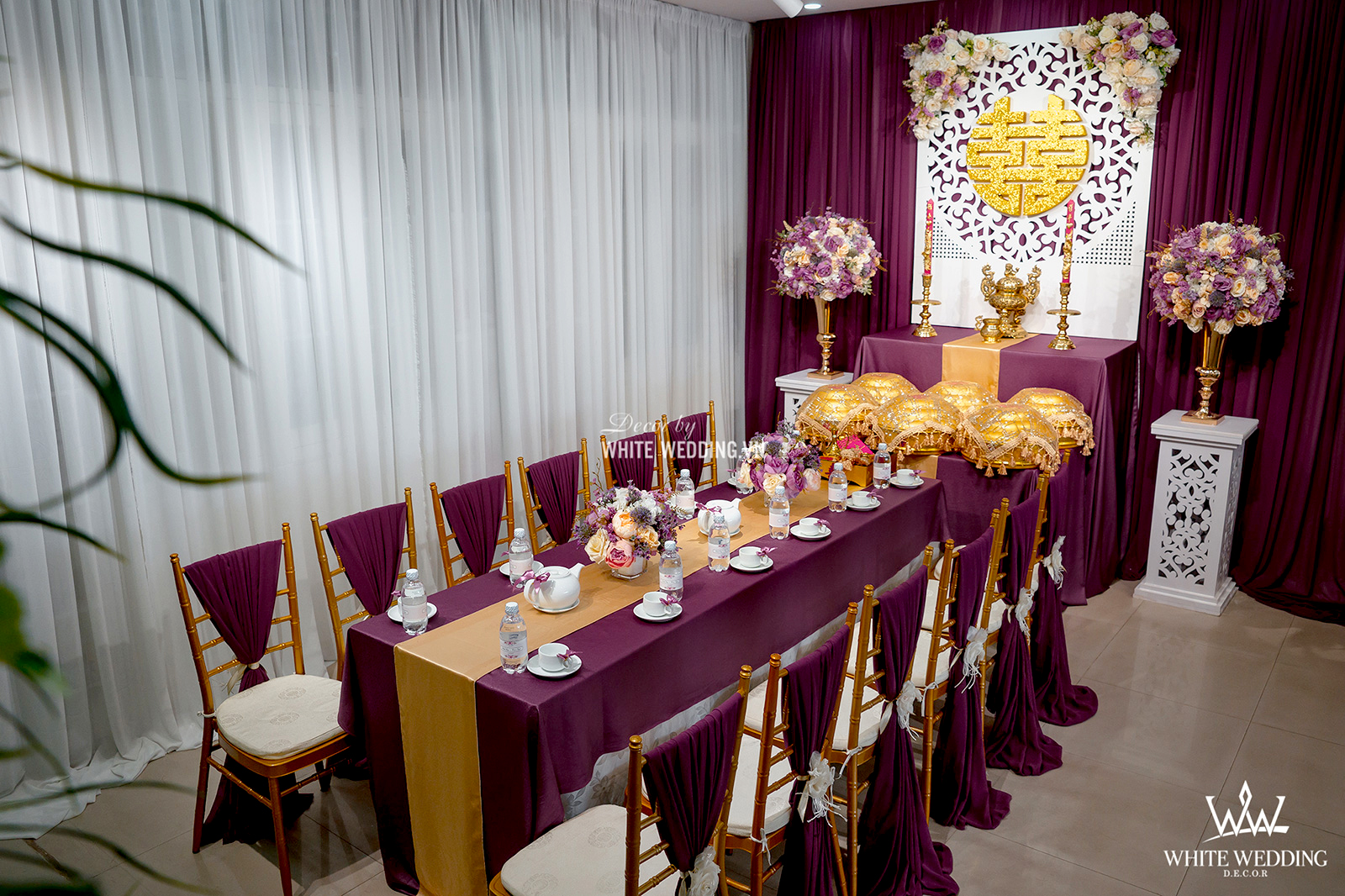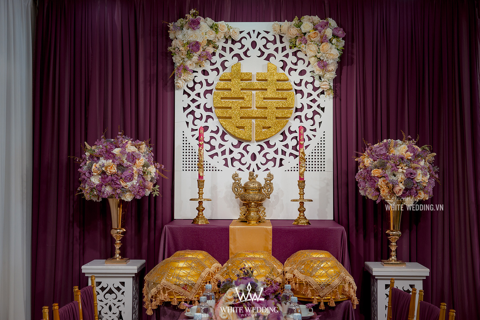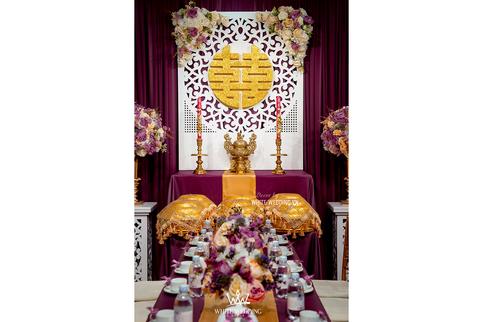 Backdrop gia tiên đơn giản với phông voan trắng điểm nhấn voan màu và chử hỷ CNC cách điệu. Bàn hai họ trang trọng khi phu gấm hoa văn cùng line kim sa lấp lánh mang đến không gian ngày cưới sang trọng. Lưu ý: • White Wedding sẽ tới nhà quý khách khảo sát trước khi trang trí set up. Thông thường set up hoàn thiện trước ngày lễ 1 ngày • Miễn phí phí vận chuyển và lắp đặt trang trí nhà trong vòng bán kính 5km (tính từ công ty)