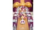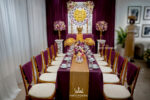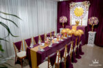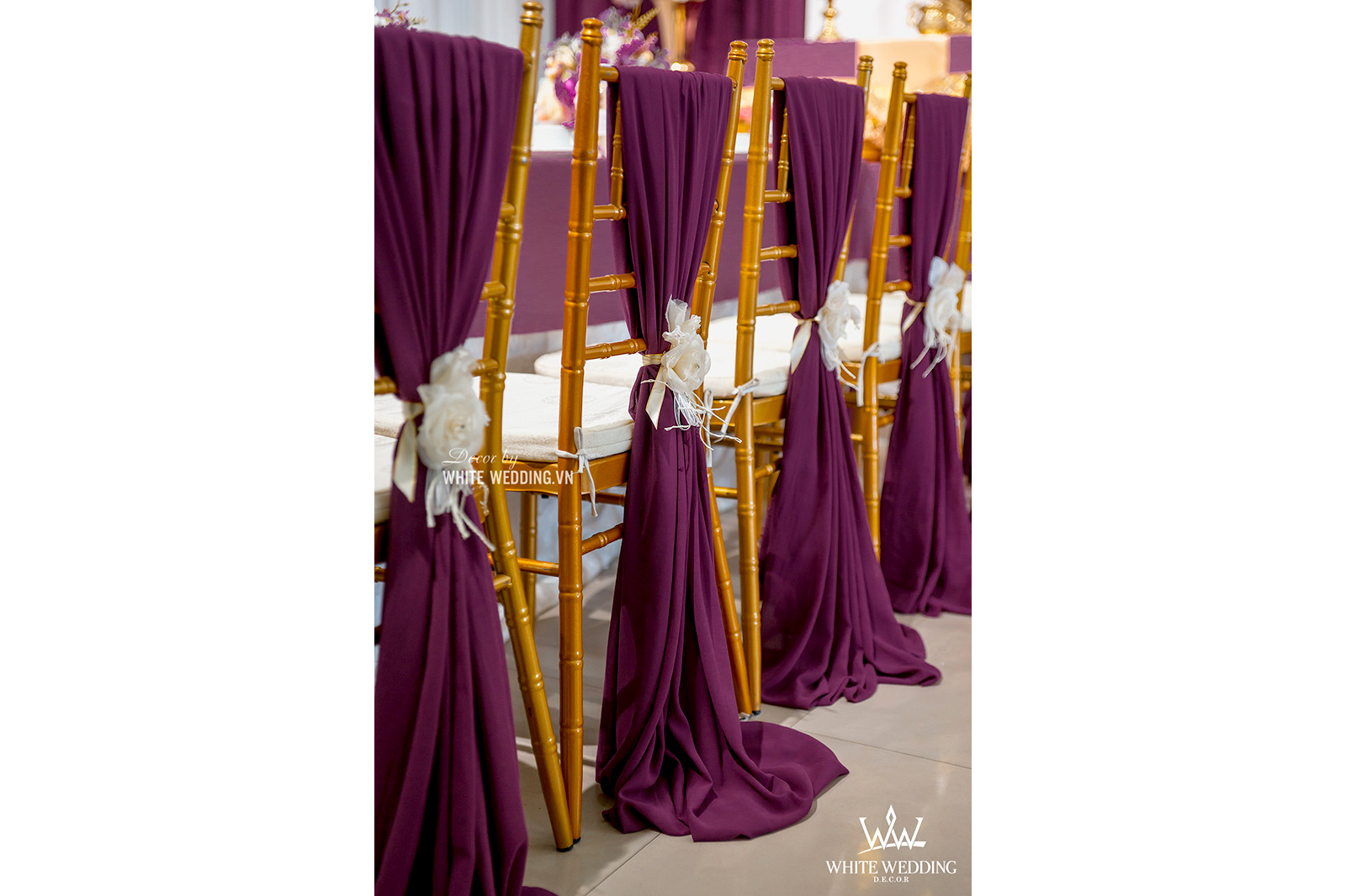 Sắc tím thủy chung được sử dụng làm tone nền chủ đạo kết hợp với màu gold của ghế tiffany và vật dụng trang trí khác. tạo một không gian ngày cưới ấn tượng nhưng không kém phần sang trọng.