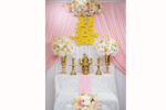 Backdrop gia tiên đơn giản với phông voan trắng điểm nhấn voan màu và chử hỷ. Bàn hai họ trang trọng phủ gấm và line voan hoa hồng mang đến không gian ngày cưới sang trọng.