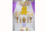 Backdrop gia tiên đơn giản với phông voan trắng điểm nhấn voan màu và chử hỷ. Bàn hai họ trang trọng phủ gấm và line voan hoa hồng mang đến không gian ngày cưới sang trọng.