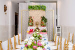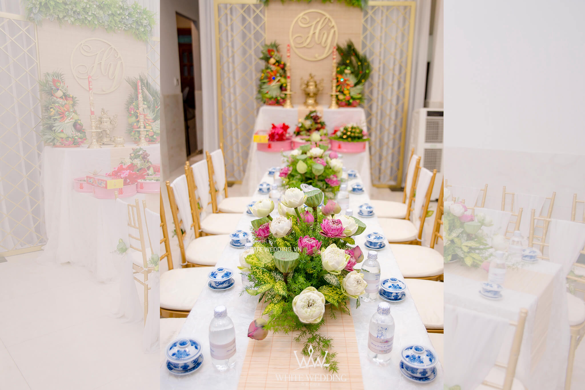 FLORINE – GIA TIÊN SANG TRỌNG VỚI PHONG CÁCH TỐI GIẢN Trang trí lễ gia tiên - Sự kết hợp tinh tế giữa sắc màu pastel hoa hồng - cẩm tủ cầu điểm nhấn cho họa tiết vàng gold sang trọng chữ Hỷ và backdrop hoa văn. Lưu ý: • White Wedding sẽ tới nhà quý khách khảo sát trước khi trang trí set up. Thông thường set up hoàn thiện trước ngày lễ 1 ngày • Miễn phí phí vận chuyển và lắp đặt trang trí nhà trong vòng bán kính 5km (tính từ công ty)
