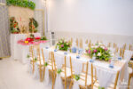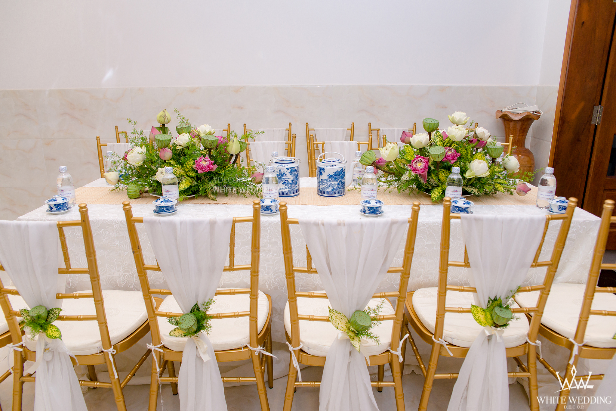 – 12 ghế tiffany vàng trang trí đính hoa – 02 ấm + 12 tách gốm Bát Tràng (2 ấm+ 12 tách+ 12 đĩa) ✔ Bảng tên CD-CR thiết kế ** Tặng 24 chai nước suối nhãn tên CD-CR ** Nếu sử dụng line lá tươi bù thêm 500.000đ |
