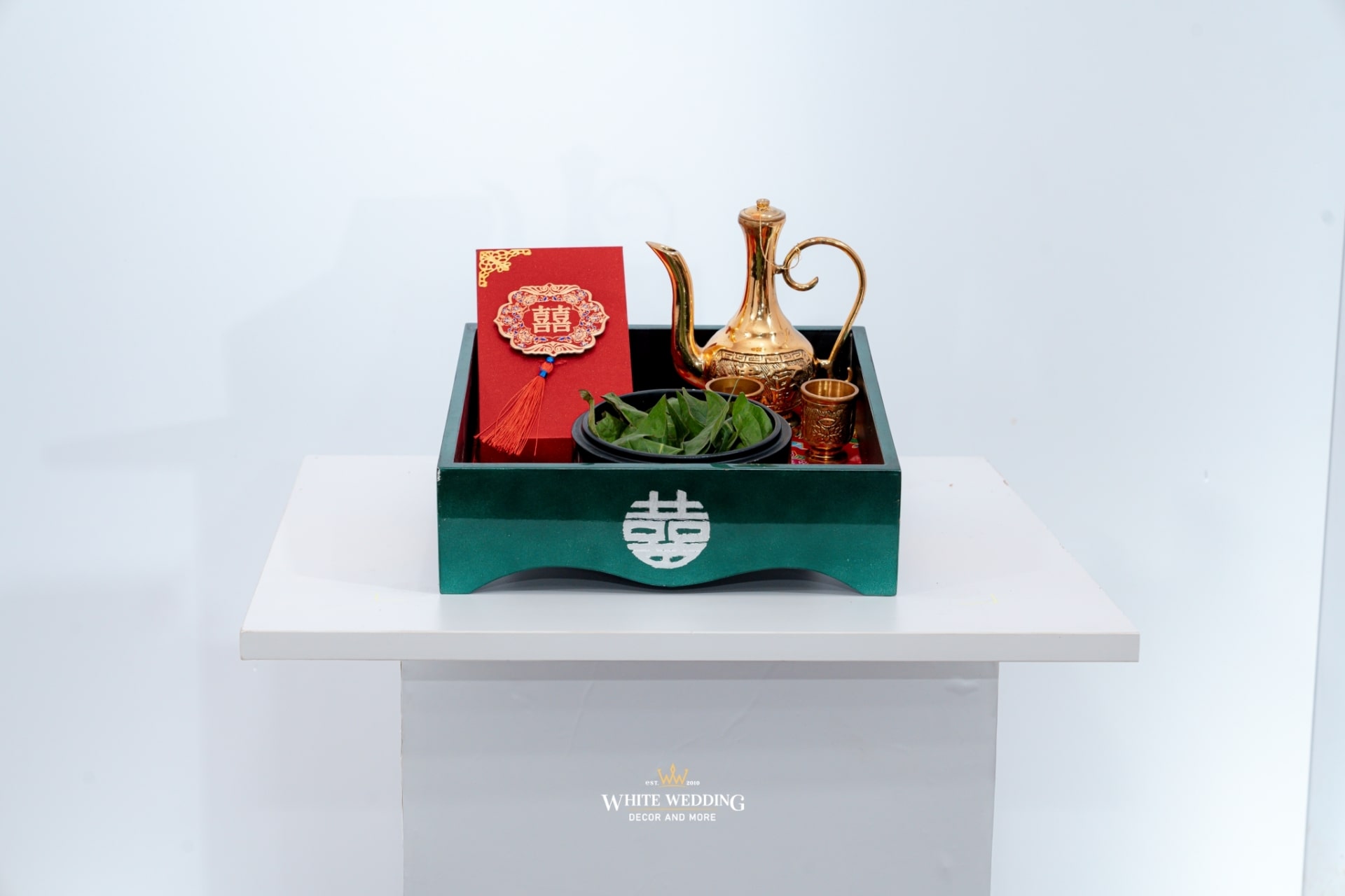 1 Khay rượu Bình 2 ly đồng + hộp trầu têm + chai rượu nếp + bao nạp tài