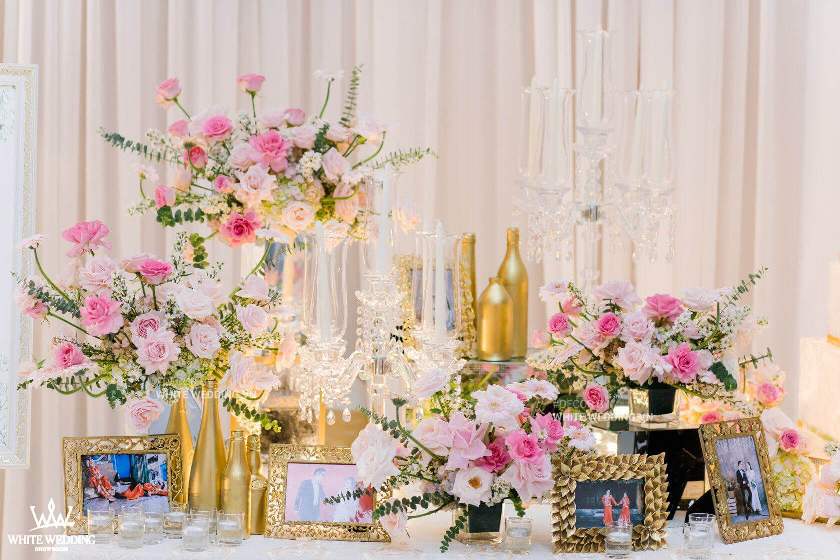 Biến không gian tiệc cưới trở nên sang trọng, lộng lẫy bằng hệ thống mẫu ấn tượng bậc nhất, kết hợp với hoa tươi nhập khẩu cao cấp.