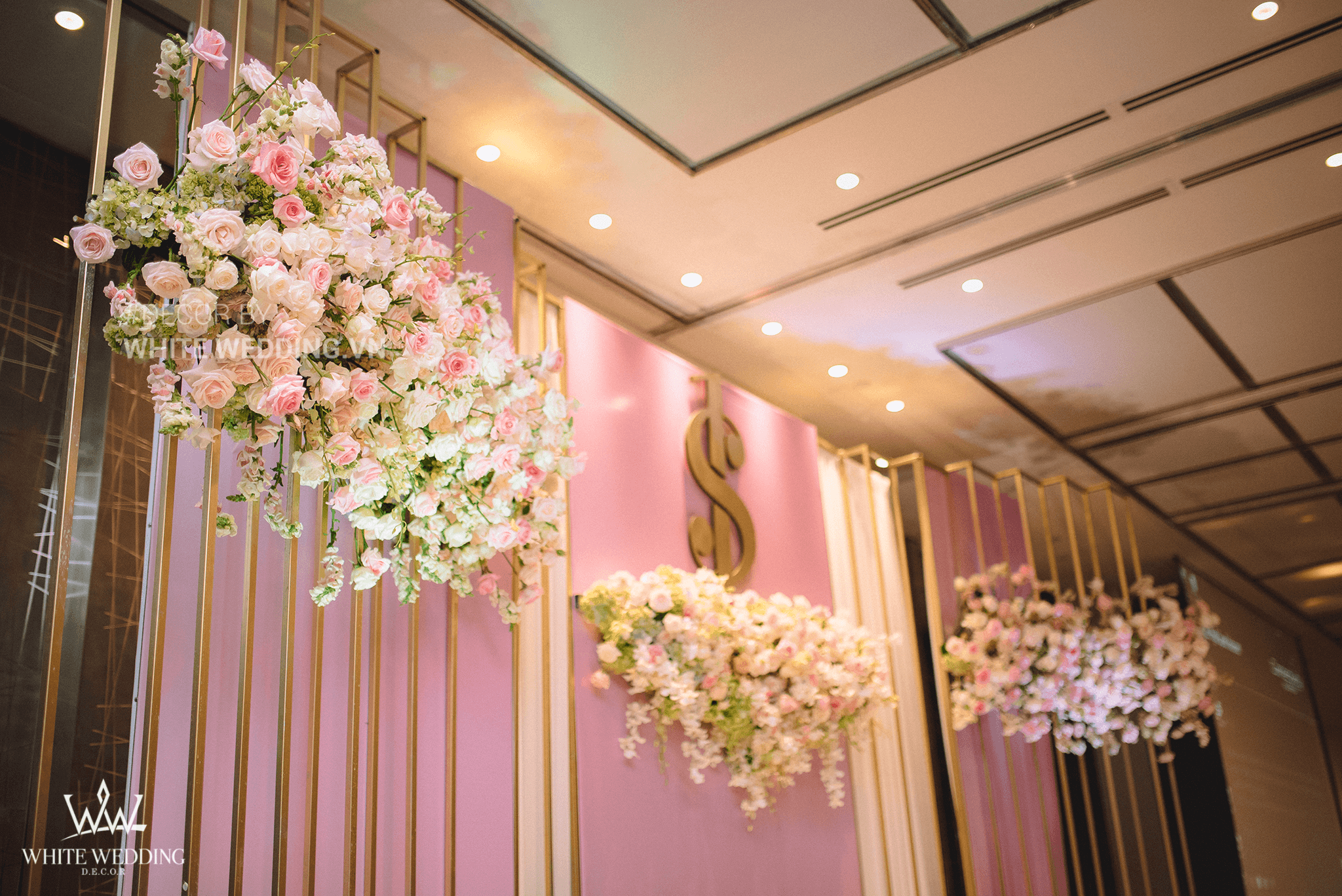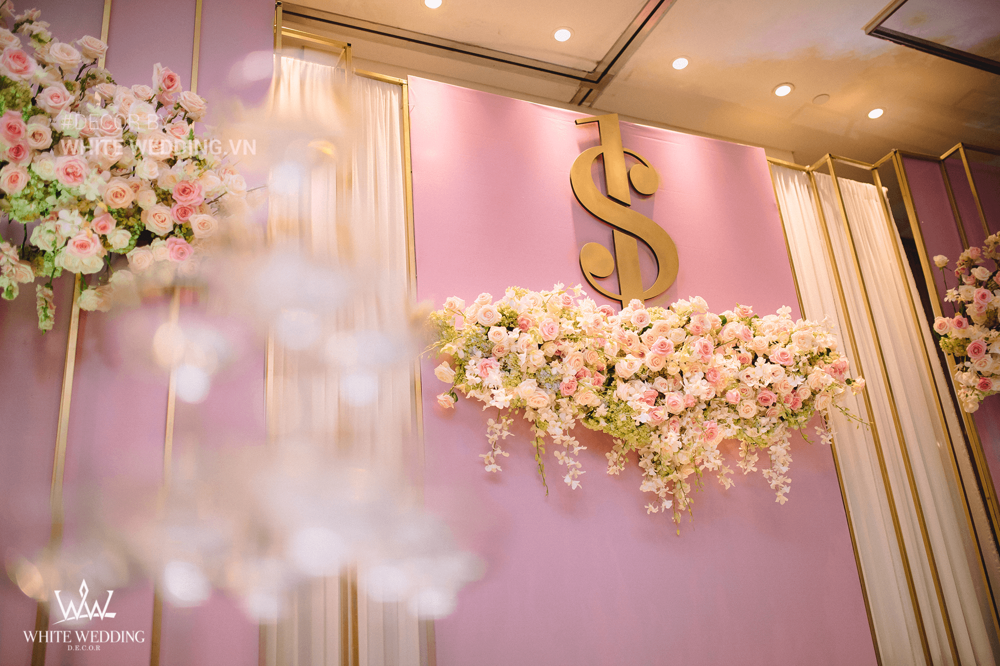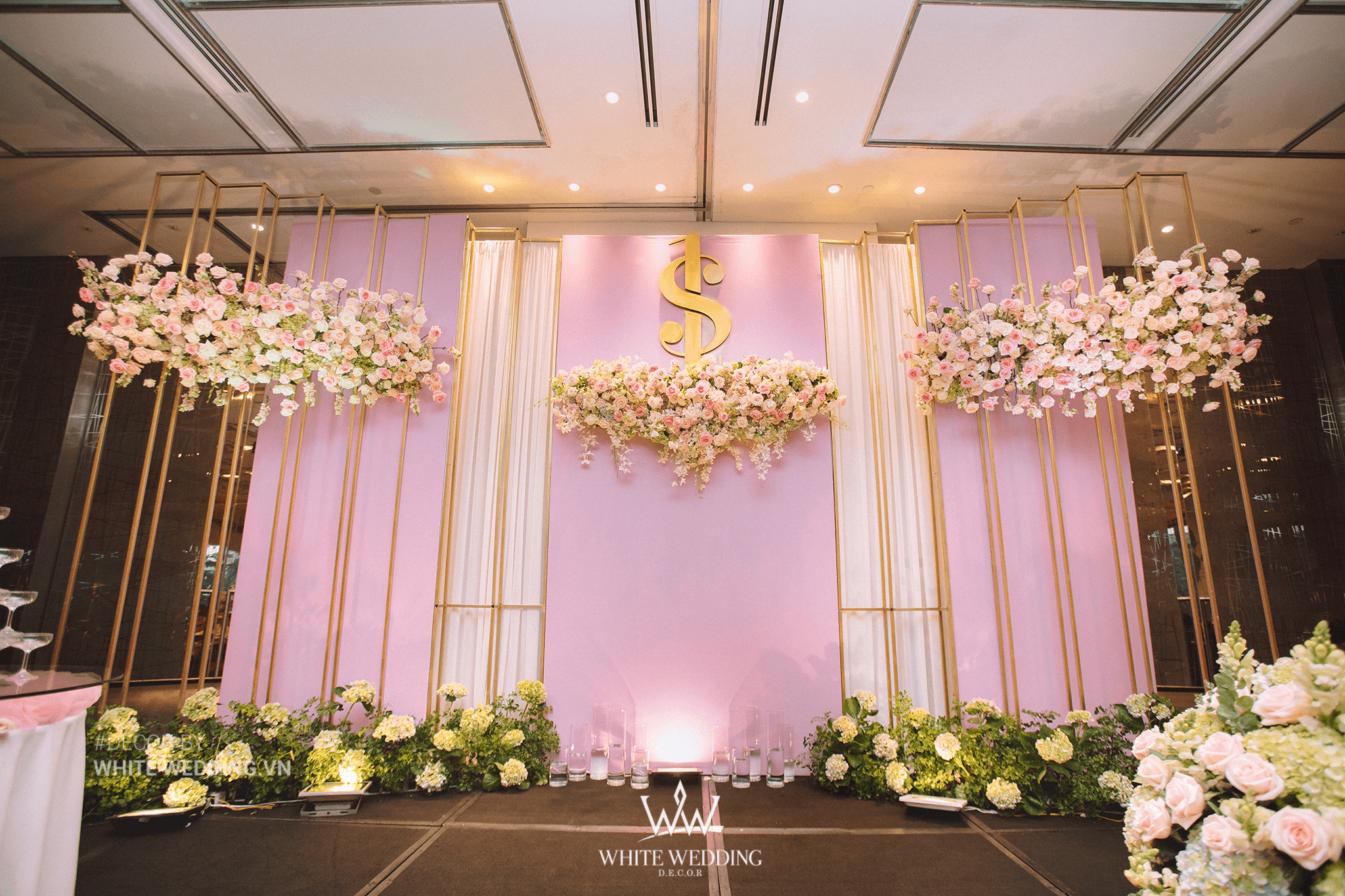 Có thể một tiệc cưới tone màu hồng ngọt ngào và gold ấm áp, kết hợp với họa tiết trang trí đơn giản sẽ kém phần sang trọng, nhưng hiệu ứng của backdrop đã tạo nên không gian ngày cưới trở nên thật ấn tượng với vẻ đẹp vô tận và thanh lịch.