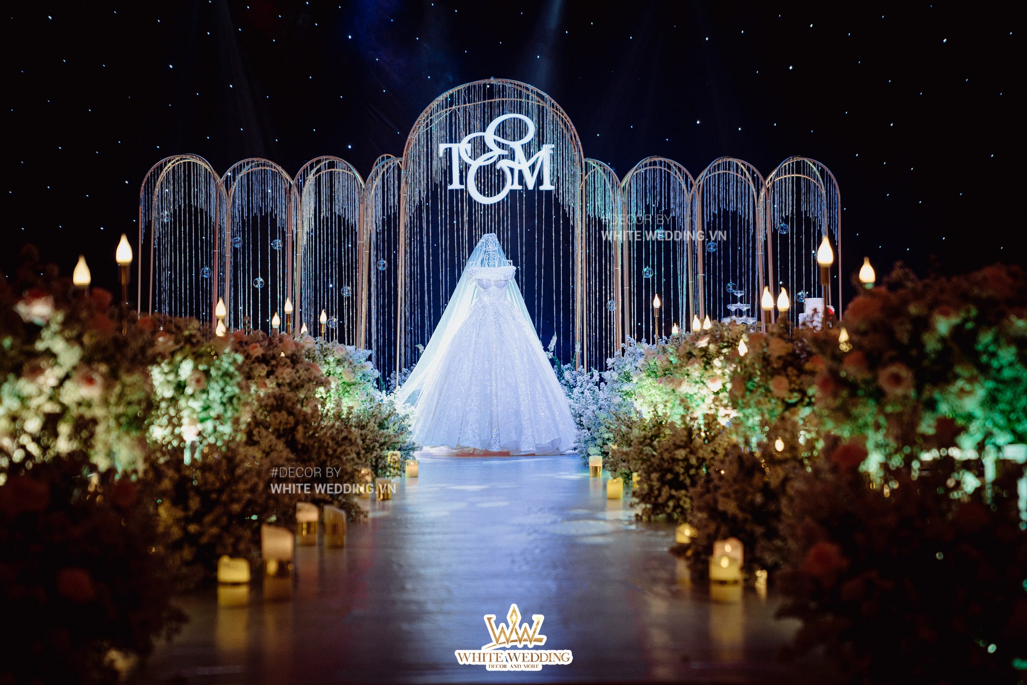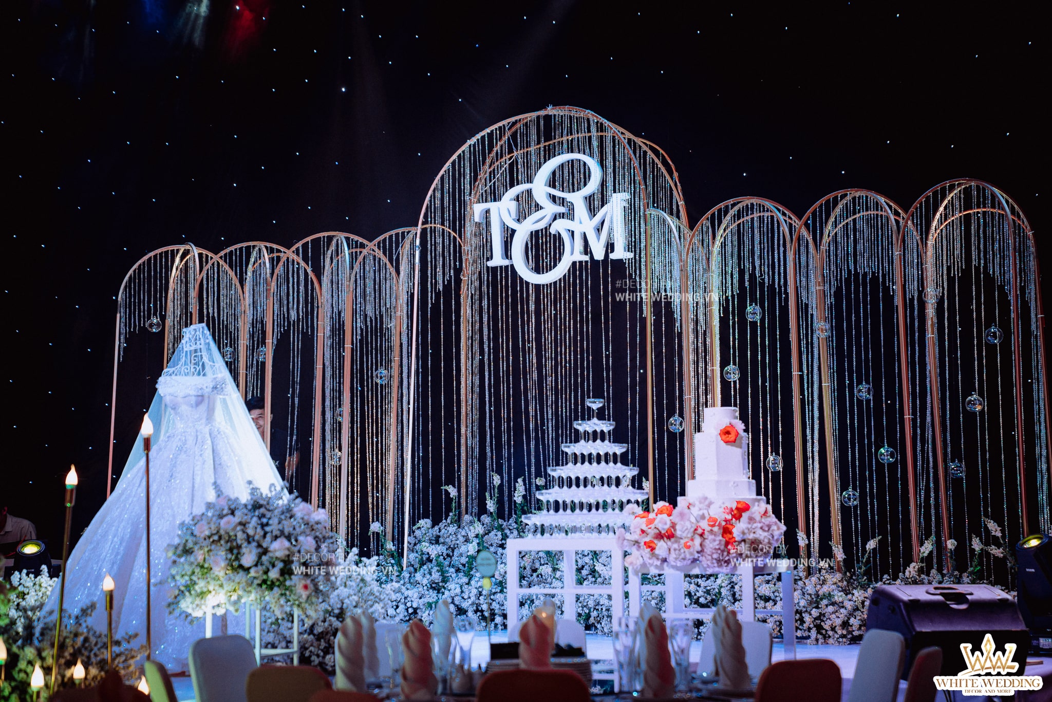 Biến không gian tiệc cưới trở nên sang trọng, lộng lẫy bằng hệ thống mẫu ấn tượng bậc nhất, kết hợp với hoa tươi nhập khẩu cao cấp.