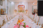SẮC ĐỎ TRUYỀN THỐNG ẤN TƯỢNG NGÀY CƯỚI Sự kết hợp độc đáo giữa tone màu nóng của sắc đỏ, kim sa vàng lấp lánh và tone màu lạnh xanh ghi của hoa cẩm tú cầu điểm xuyến line hoa bàn hai họ, backdrop nền lá xanh tươi mát mang đến không gian ngày cưới sang trọng và ngập tràn hương hoa tươi.