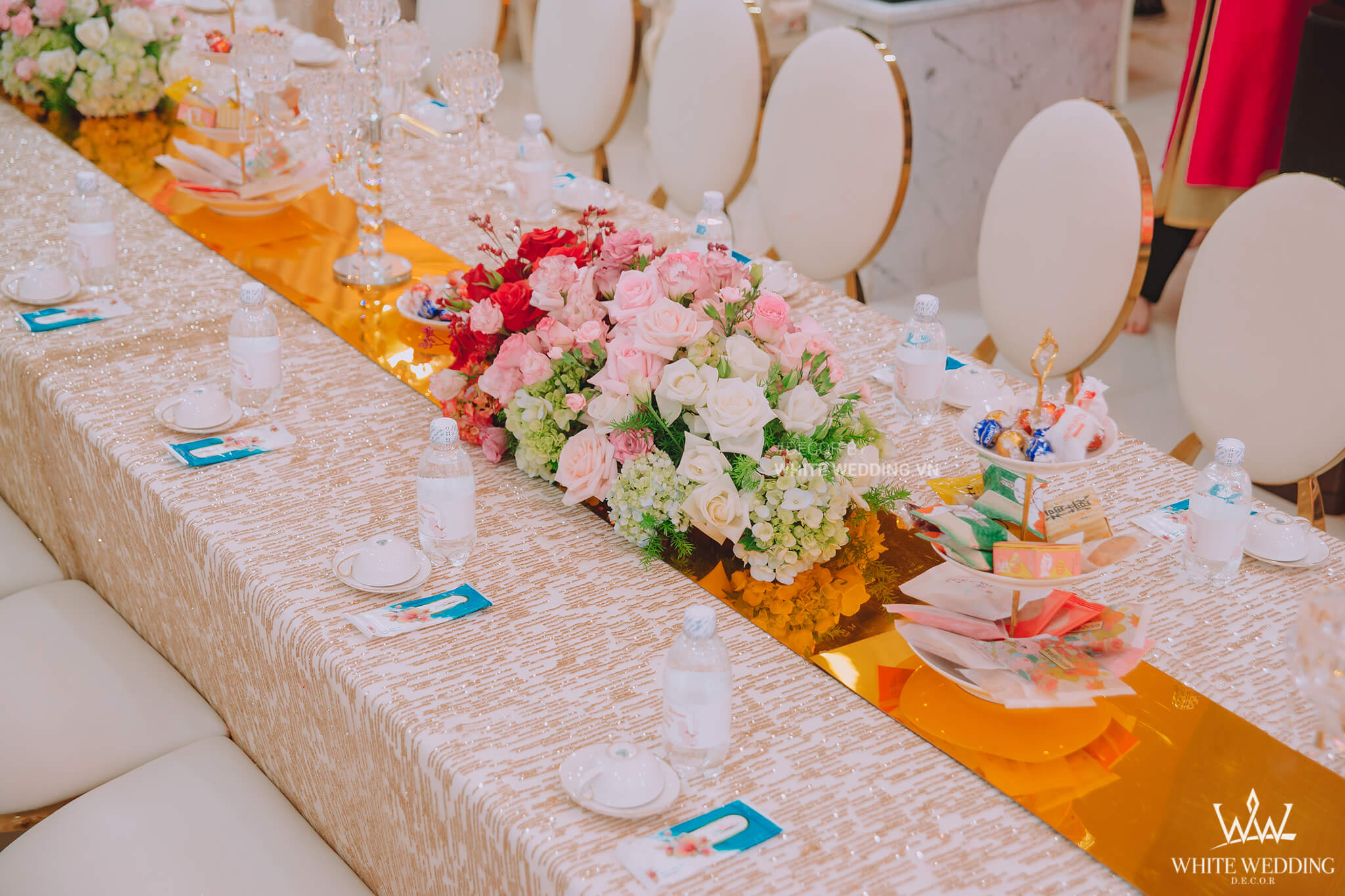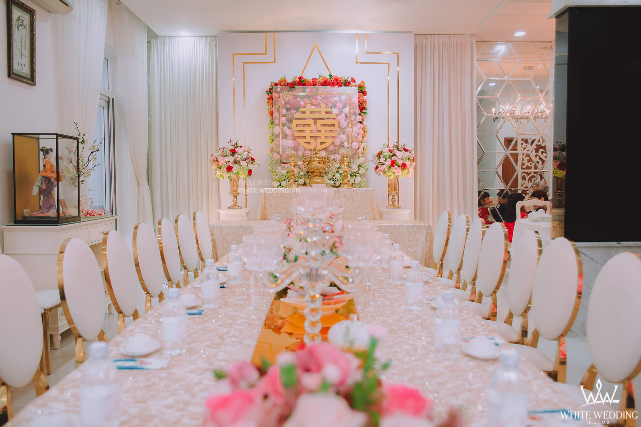 SANG TRỌNG VÀ TINH TẾ CÙNG FAIRY SECRET Trang hoàng gia tiên với Fairy Secret mang sắc màu Pastel nhẹ nhàng, ngọt ngào tưởng chừng sẽ rất "sến sẩm". Nhưng Fairy Secret mang đến một không gian ngày cưới vô cùng sang trọng và ấn tượng với điểm nhấn backdrop trong suốt viền gold bắt mắt, còn được tô điểm bởi những bông hoa cao cấp nhập khẩu và phân phối bởi WHITESTORE - Party and More. Lưu ý: • White Wedding sẽ tới nhà quý khách khảo sát trước khi trang trí set up. Thông thường set up hoàn thiện trước ngày lễ 1 ngày • Miễn phí phí vận chuyển và lắp đặt trang trí nhà trong vòng bán kính 5km (tính từ công ty)