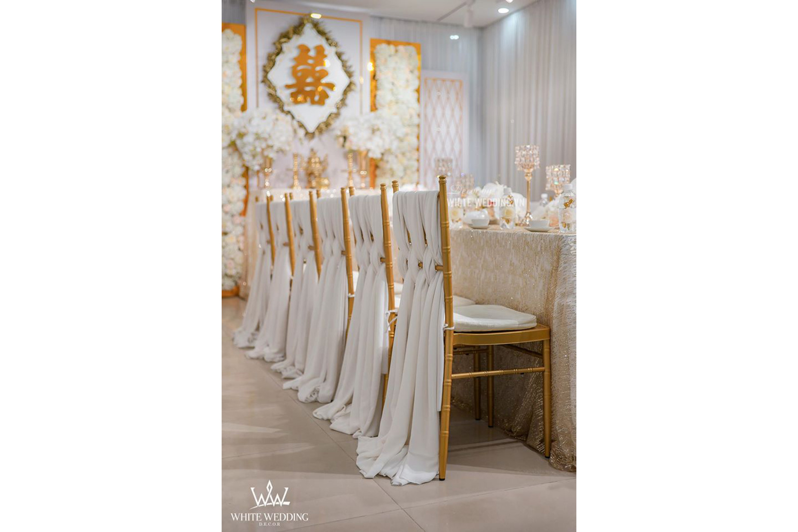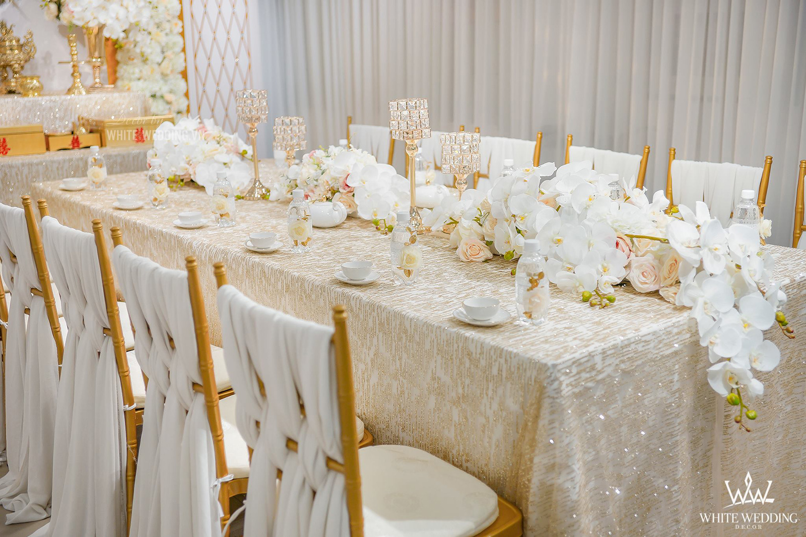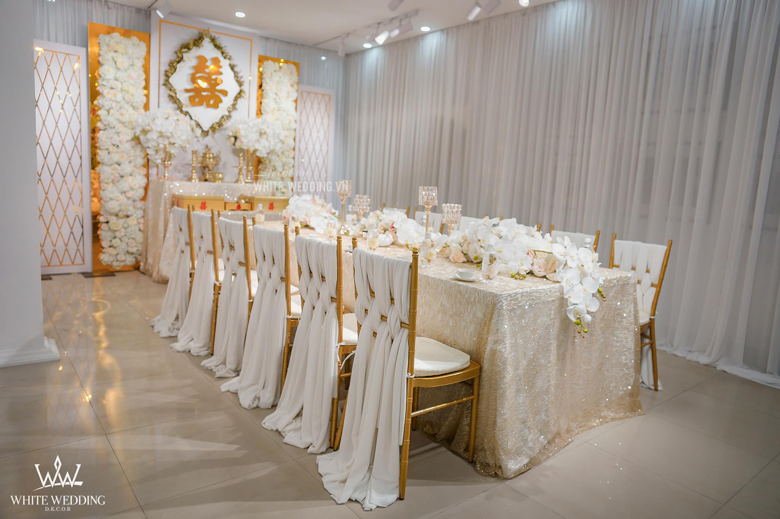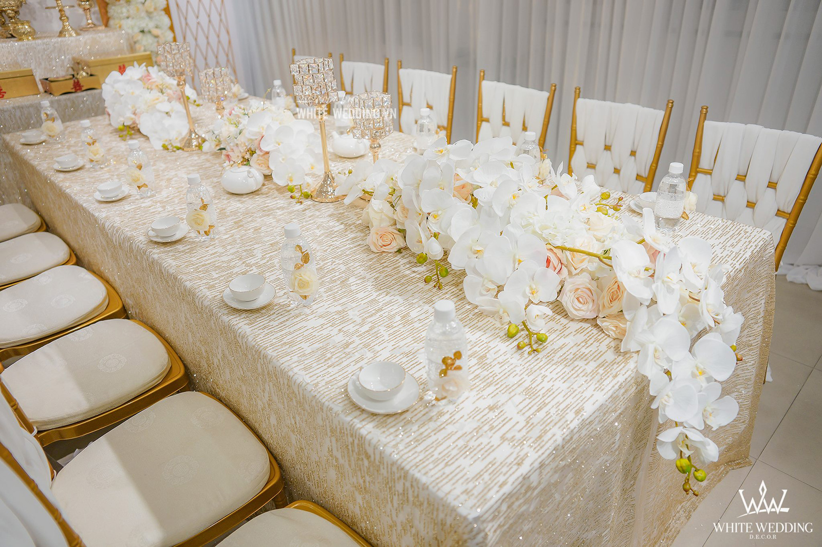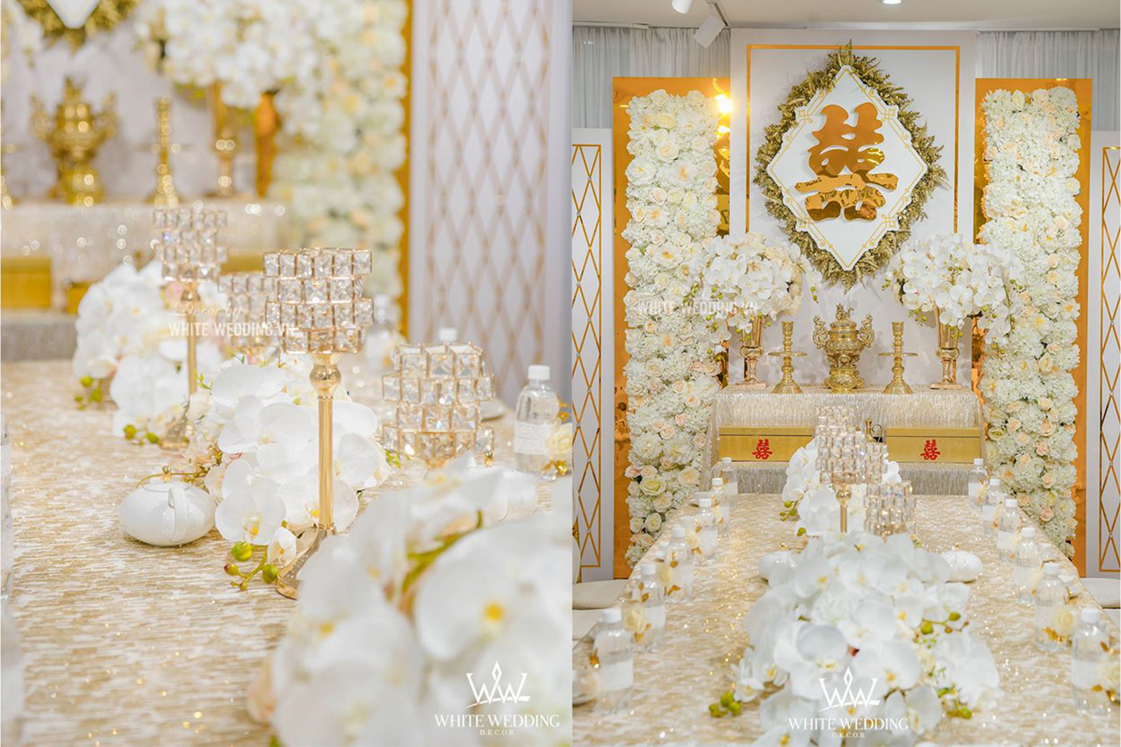 TRANG TRÍ GIA TIÊN VỚI KIM SA LẤP LÁNH Không gian ngày cưới phủ sắc vàng ánh kim ấn tượng. Từ backsdrop chính kim sa, bàn tơ hồng, cho đến phụ kiện đi kèm như khăn trải bàn, áo ghế, bộ ấm tách cao cấp và 4 bình hoa tươi cũng được chuẩn bị chỉn chu và tỉ mỉ. Lưu ý: • White Wedding sẽ tới nhà quý khách khảo sát trước khi trang trí set up. Thông thường set up hoàn thiện trước ngày lễ 1 ngày • Miễn phí phí vận chuyển và lắp đặt trang trí nhà trong vòng bán kính 5km (tính từ công ty)