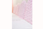 Backdrop gia tiên đơn giản với phông voan trắng điểm nhấn line hoa giấy và chử hỷ cùng tone màu. Bàn hai họ trang trọng phủ gấm và line voan hoa hồng mang đến không gian ngày cưới sang trọng.