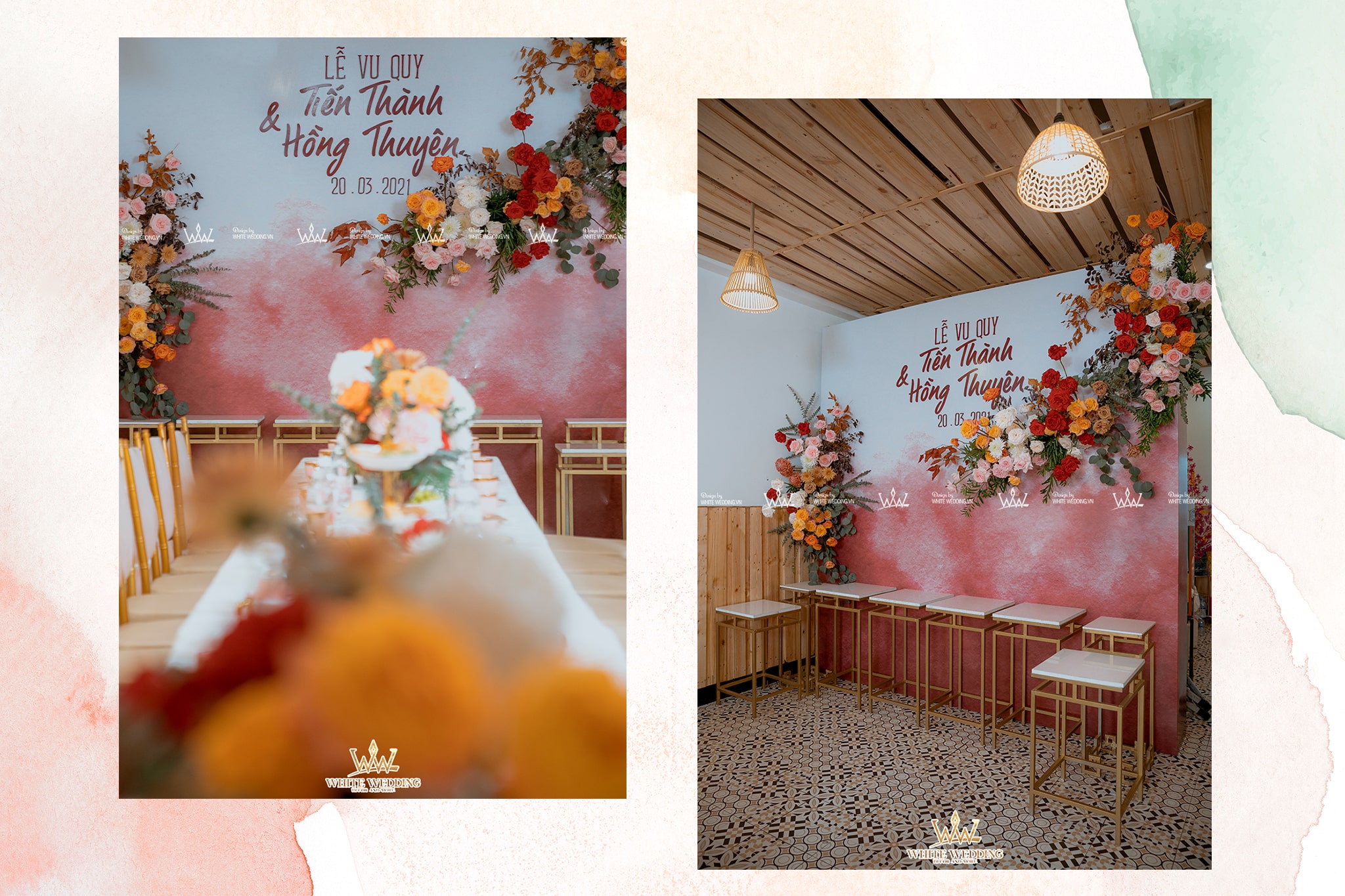 MARIAGE TERACOTTA – GIA TIÊN PHÁ CÁCH VỚI SẮC MÀU HIỆN ĐẠI Trang trí lễ gia tiên - Sắc màu hiện đại trẻ trung và phá cách được sử dụng tạo điểm nhấn trên phông nền trắng đơn điệu kết hợp với chữ hỷ truyền thống và bạn hai họ. Tạo nên không gian lễ cưới gần gũi và sang trọng. Lưu ý: • White Wedding sẽ tới nhà quý khách khảo sát trước khi trang trí set up. Thông thường set up hoàn thiện trước ngày lễ 1 ngày • Miễn phí phí vận chuyển và lắp đặt trang trí nhà trong vòng bán kính 5km (tính từ công ty)