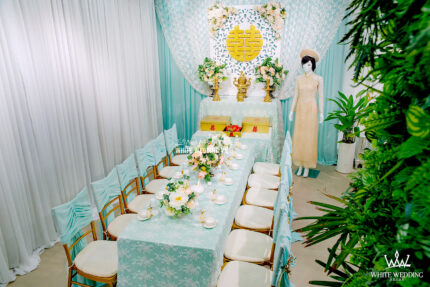 TRANG TRÍ GIA TIÊN XANH MINT TẠI SAO KHÔNG Xanh Mint một trong những màu sắc tươi mát, chưa bao giờ lỗi thời và rất được lòng Cô Dâu - Chú Rể đón nhận trong ngày trọng đại của mình. Sắc màu nhẹ nhàng không mới mẻ cũng như phá cách nhưng vẫn thể hiện sự sang trọng đầy tinh tế của buổi lễ. Lưu ý: • White Wedding sẽ tới nhà quý khách khảo sát trước khi trang trí set up. Thông thường set up hoàn thiện trước ngày lễ 1 ngày • Miễn phí phí vận chuyển và lắp đặt trang trí nhà trong vòng bán kính 5km (tính từ công ty)