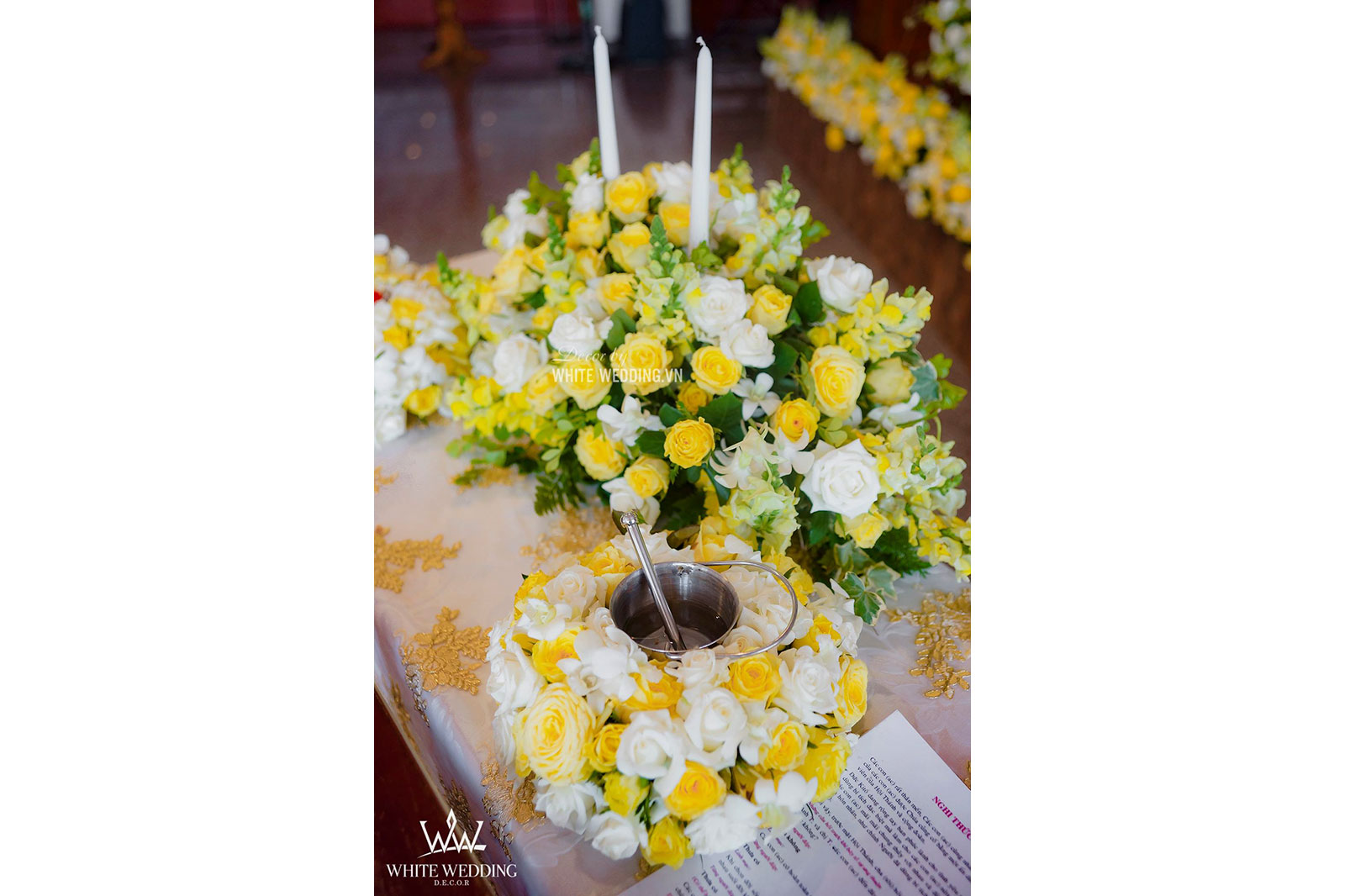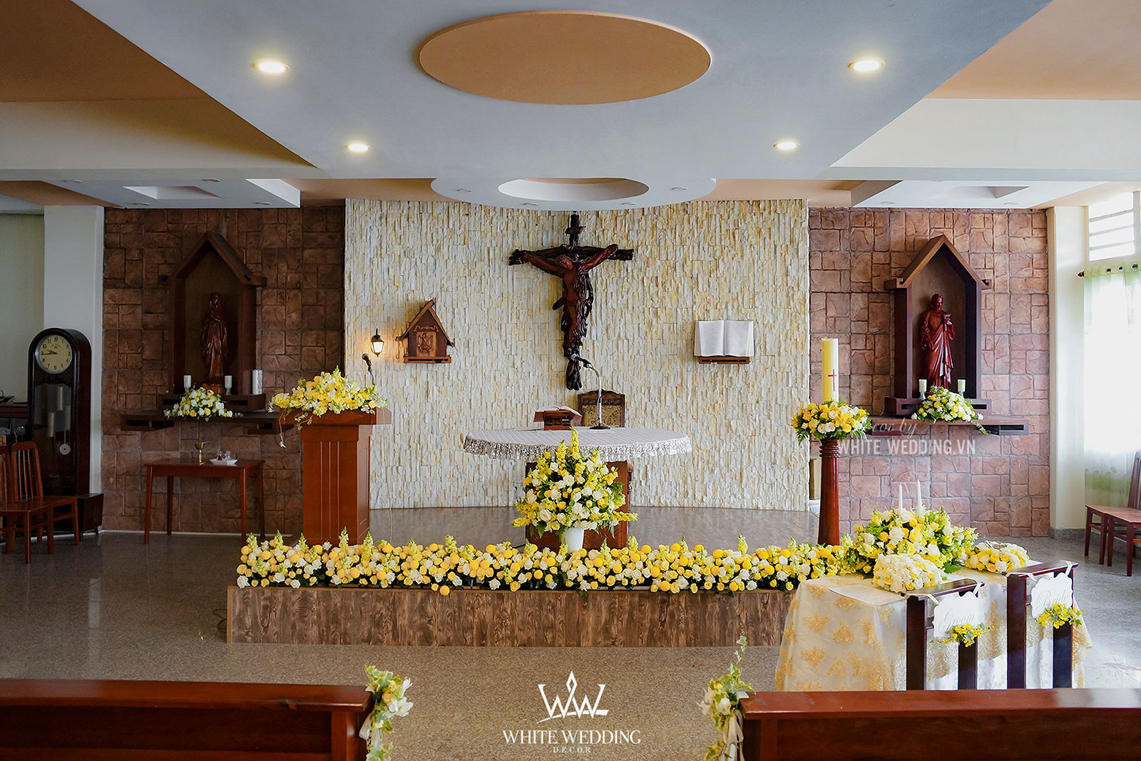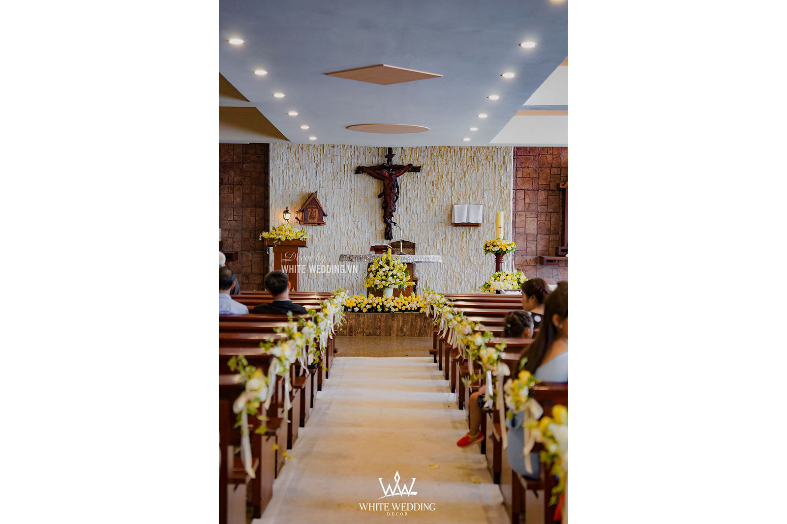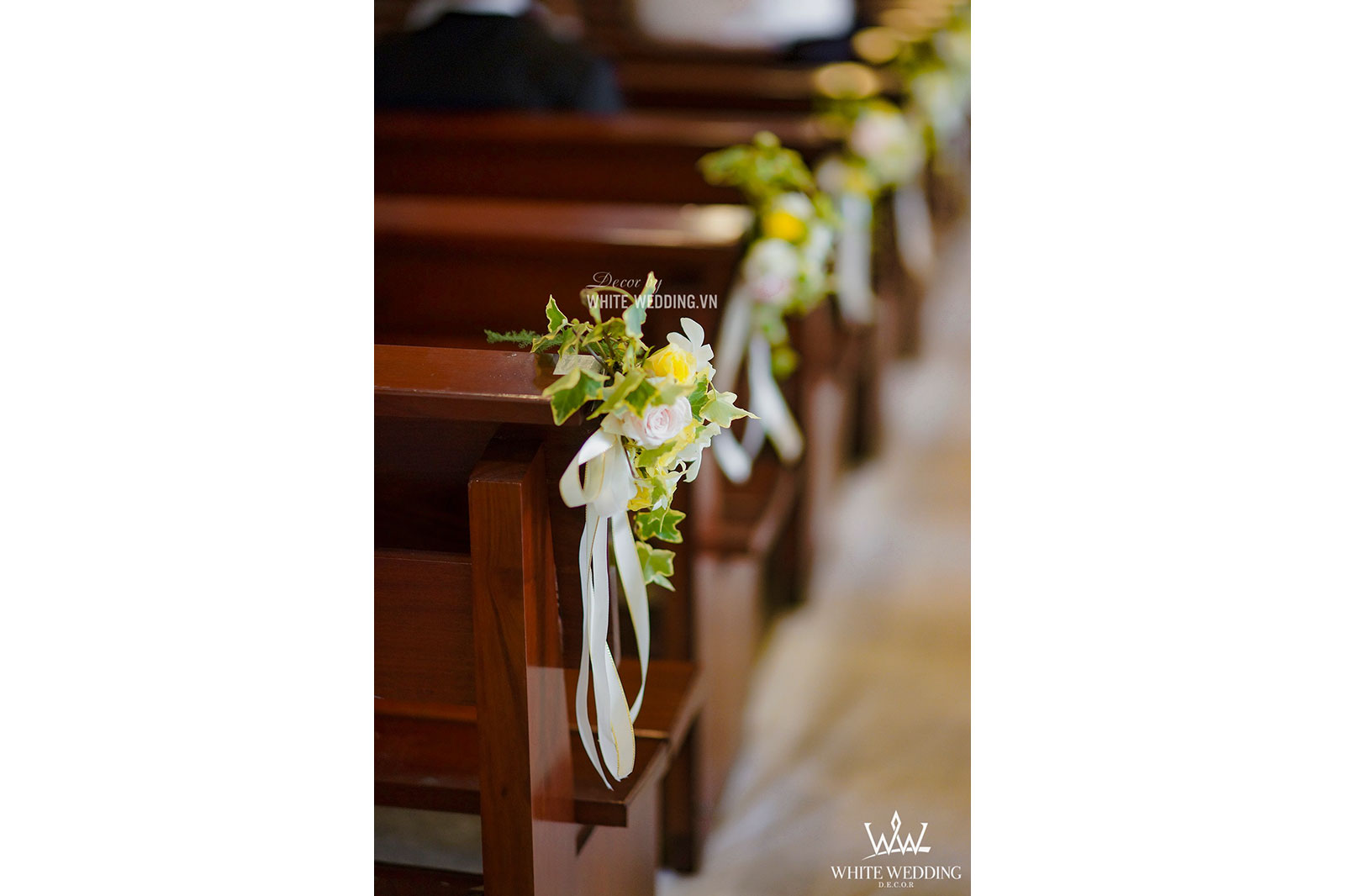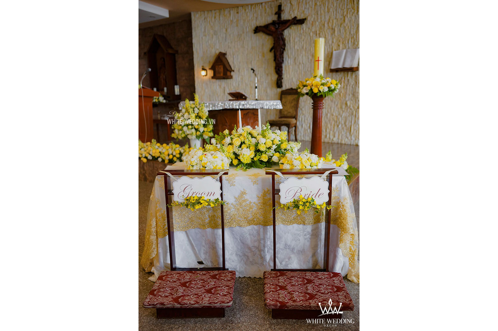 Lễ thánh đường trở nên thật ấm áp với tone màu vàng chủ đạo, kết hợp với hồng pastel nhẹ nhàng và xanh của thường xuân mang ý nghĩa gắn kết bên lâu. Tiến vào lễ đường chính là line hoa nhỏ nhắn được gắn dọc trên ghế ngồi khách tham dự. Khu vực bục phát biểu cũng được White Wedding trang trí chỉnh chu với hoa tươi đẹp nhất. Tất cả mang đến môt không gian cưới trở thật lãng mạn và sang trọng.