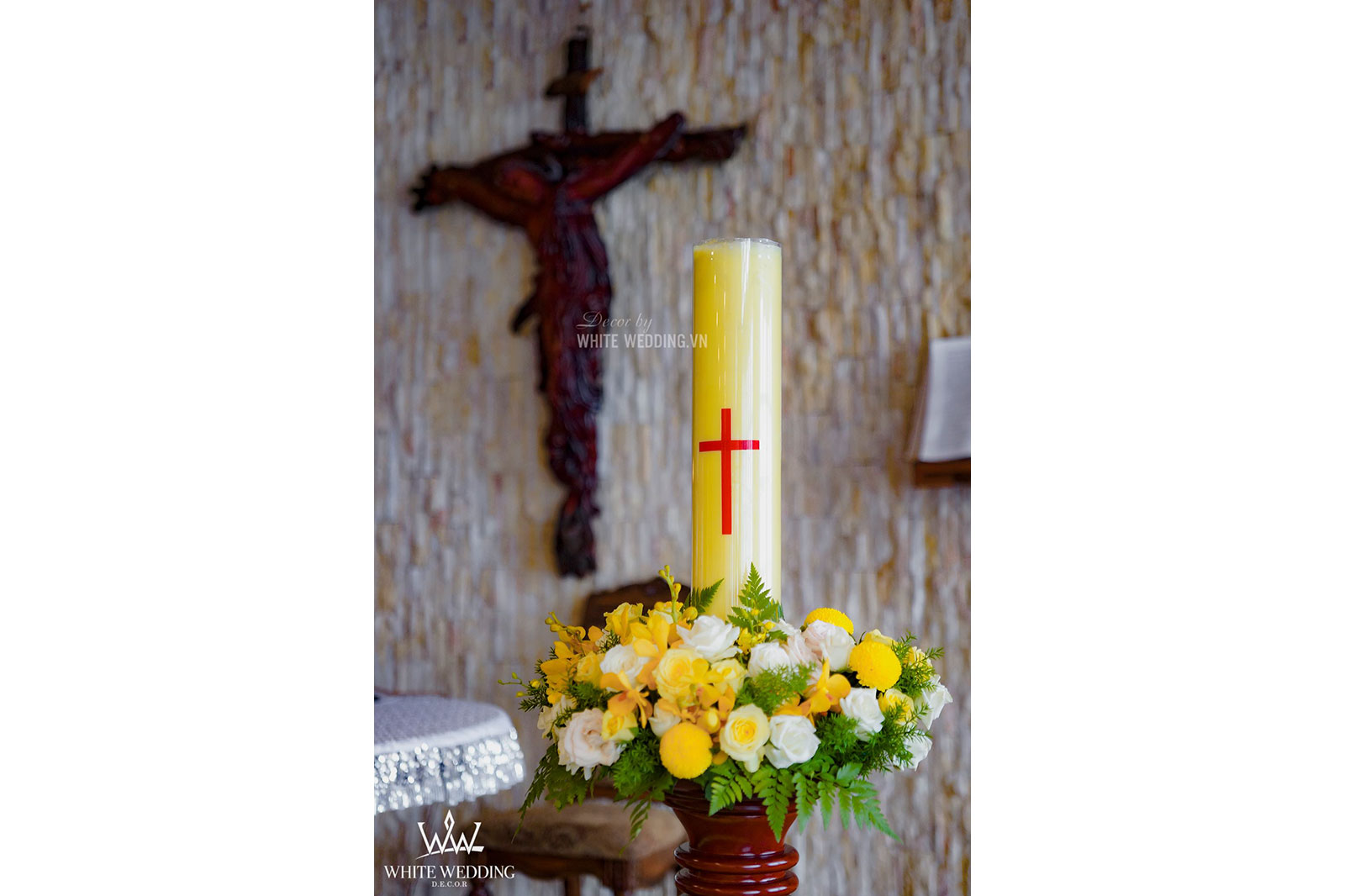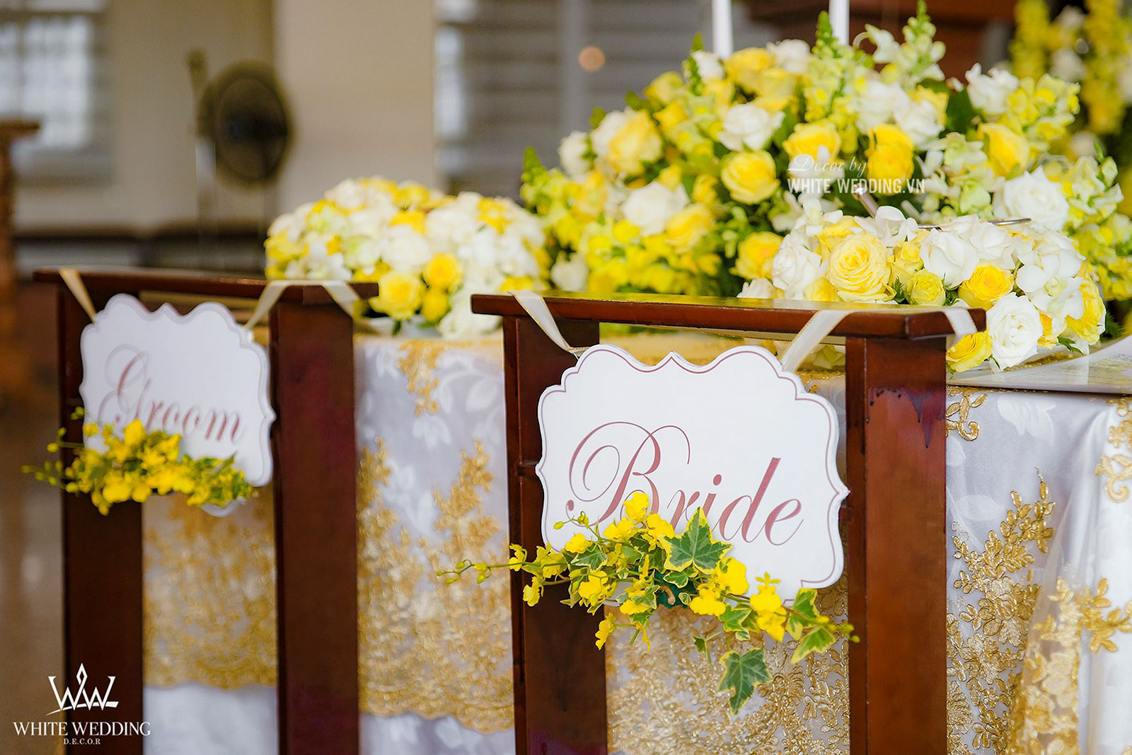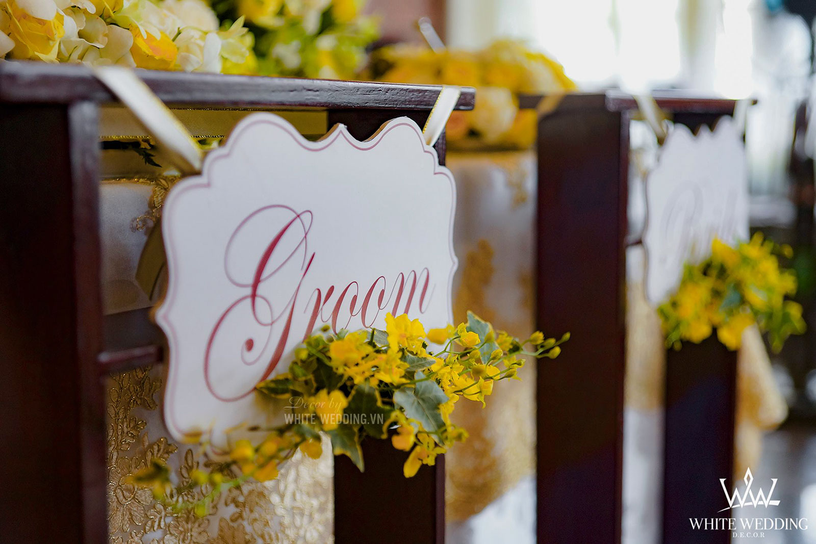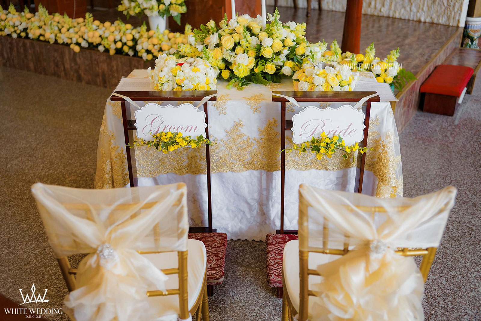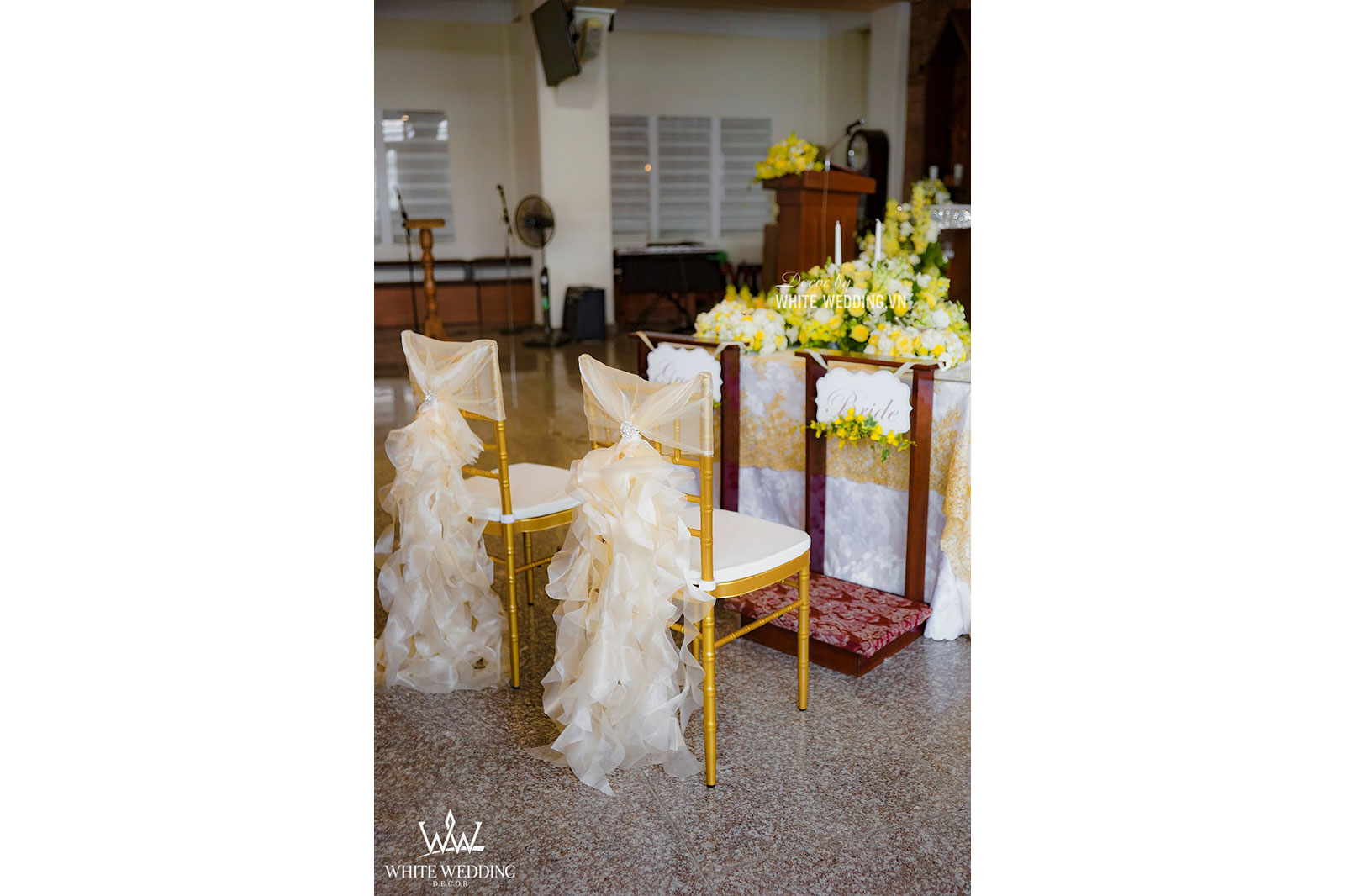 Lễ thánh đường trở nên thật ấm áp với tone màu vàng chủ đạo, kết hợp với hồng pastel nhẹ nhàng và xanh của thường xuân mang ý nghĩa gắn kết bên lâu. Tiến vào lễ đường chính là line hoa nhỏ nhắn được gắn dọc trên ghế ngồi khách tham dự. Khu vực bục phát biểu cũng được White Wedding trang trí chỉnh chu với hoa tươi đẹp nhất. Tất cả mang đến môt không gian cưới trở thật lãng mạn và sang trọng.