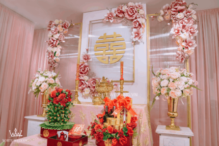 LOTUS I – VẺ ĐẸP TRUYỀN THỐNG VĨNH CỬU Trang trí lễ gia tiên với tone hồng ngọt ngào và điểm nhấn chủ đạo Hoa Sen hiện đang là một trong những xu hướng trang trí không gian ngày lễ sang trọng, được các cặp đôi yêu thích cũng như trưởng bối rất hài lòng. Bởi Sen vừa mang một vẻ đẹp dịu dàng, thanh lịch, vừa gần gũi và còn là biểu tượng Việt Nam. Lưu ý: • White Wedding sẽ tới nhà quý khách khảo sát trước khi trang trí set up. Thông thường set up hoàn thiện trước ngày lễ 1 ngày • Miễn phí phí vận chuyển và lắp đặt trang trí nhà trong vòng bán kính 5km (tính từ công ty)