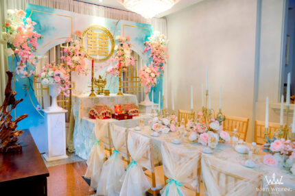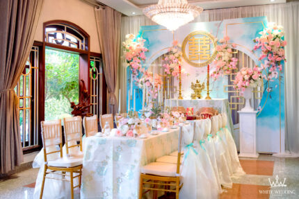 SANG TRỌNG VÀ TINH TẾ CÙNG FAIRY SECRET Trang hoàng gia tiên với Fairy Secret mang sắc màu Pastel nhẹ nhàng, ngọt ngào tưởng chừng sẽ rất "sến sẩm". Nhưng Fairy Secret mang đến một không gian ngày cưới vô cùng sang trọng và ấn tượng với điểm nhấn backdrop trong suốt viền gold bắt mắt, còn được tô điểm bởi những bông hoa cao cấp nhập khẩu và phân phối bởi WHITESTORE - Party and More. Lưu ý: • White Wedding sẽ tới nhà quý khách khảo sát trước khi trang trí set up. Thông thường set up hoàn thiện trước ngày lễ 1 ngày • Miễn phí phí vận chuyển và lắp đặt trang trí nhà trong vòng bán kính 5km (tính từ công ty)