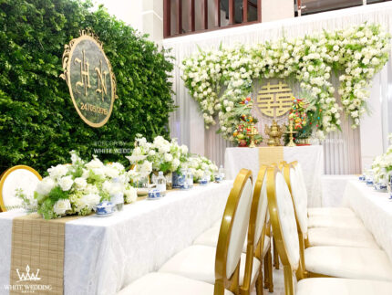 ENTERNAL LOVE (Hoa Tươi) – CONCEPT VÀNG GOLD SANG TRỌNG Trang trí lễ gia tiên - Sắc màu hiện đại và sang trọng được sử dụng tạo điểm nhấn trên phông nền trắng họa văn cách điệu kết hợp với chữ hỷ truyền thống và bạn hai họ. Tạo nên không gian lễ cưới gần gũi và sang trọng. Lưu ý: • White Wedding sẽ tới nhà quý khách khảo sát trước khi trang trí set up. Thông thường set up hoàn thiện trước ngày lễ 1 ngày • Miễn phí phí vận chuyển và lắp đặt trang trí nhà trong vòng bán kính 5km (tính từ công ty)