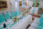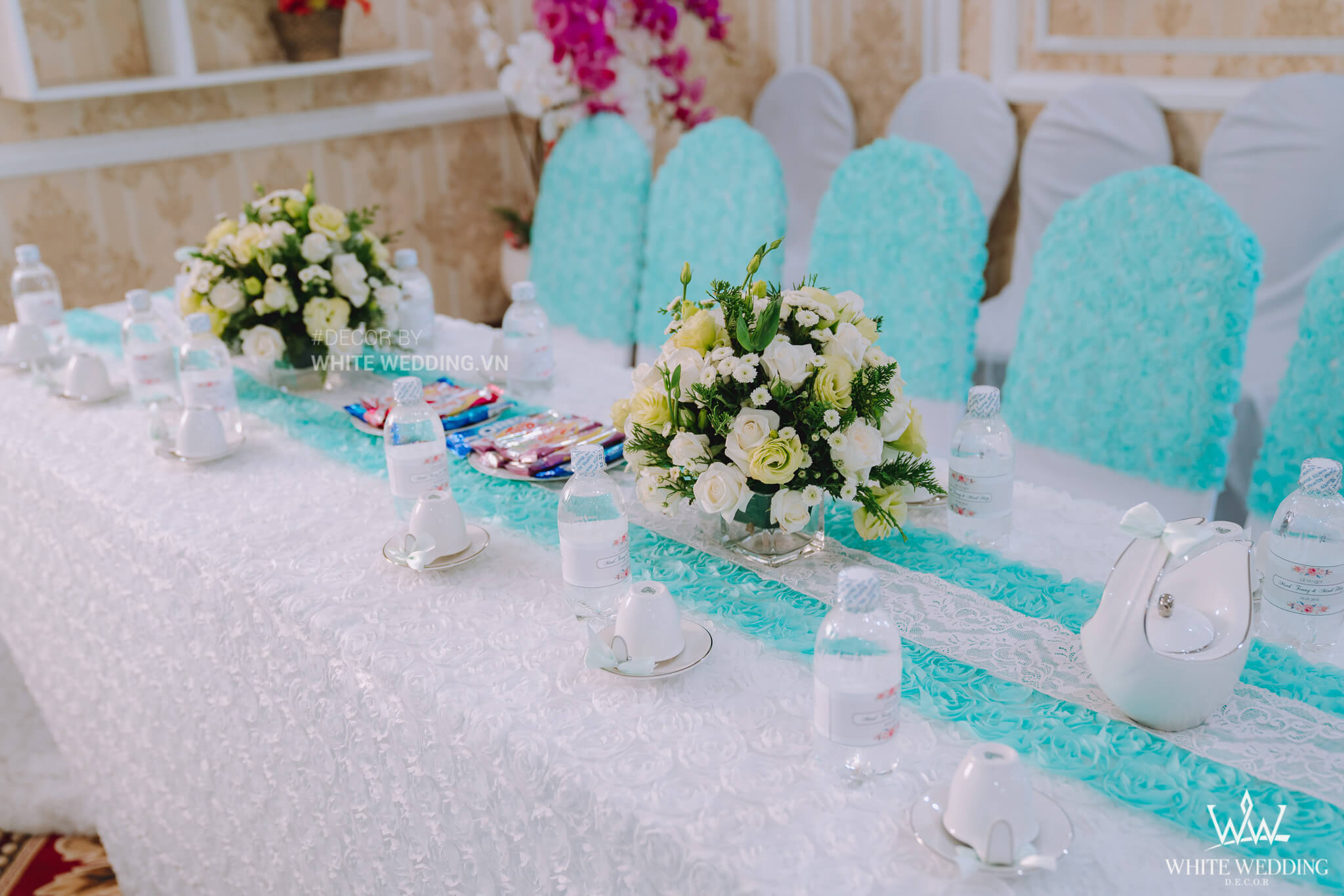Điểm đặc biệt ở gói chính là sự kết hợp xanh mint và trắng kem cùng họa hoa 3D trên backdrop, khăn trải bàn, khăn phủ và bàn hai họ được trang trí hoa tươi mang đến không gian ngày cưới ngập tràn hương hoa thật nhẹ nhàng mà vẫn sang trọng