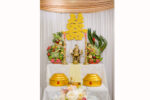 – Bộ lư đồng, đế nến, bát nhang đồng, chữ Hỷ – Cặp long phụng trái cây tươi ✔ Cổng hoa lụa tiêu chuẩn ✔ Bảng vu quy (hoặc tân hôn) ✔ Bàn để mâm quả phủ voan hoa hồng cao cấp (6 quả) |