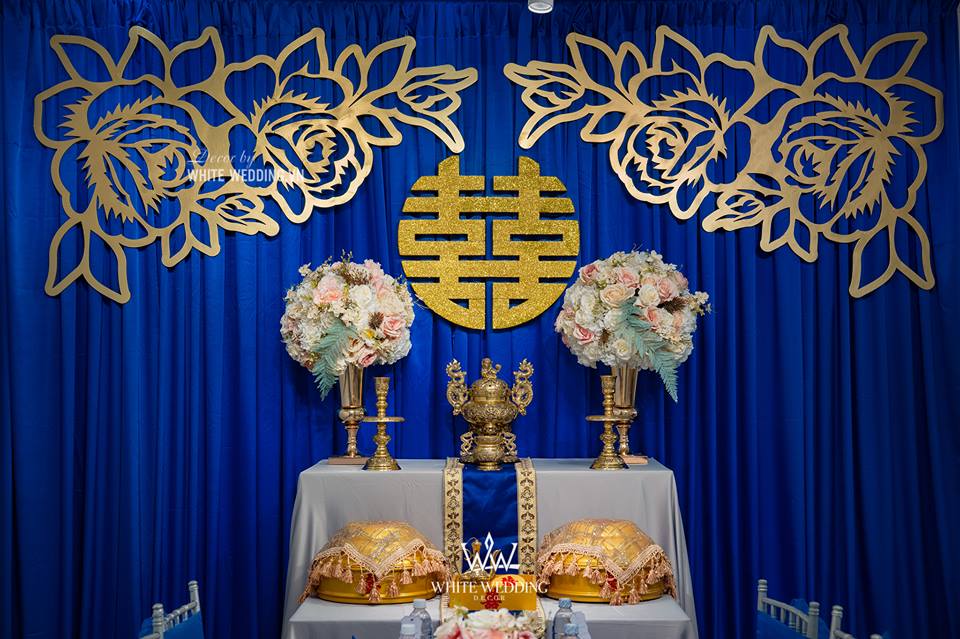 Backdrop gia tiên đơn giản với phông voan trắng điểm nhấn voan màu và chử hỷ CNC cách điệu. Bàn hai họ trang trọng khi phu gấm hoa văn cùng line kim sa lấp lánh mang đến không gian ngày cưới sang trọng. Lưu ý: • White Wedding sẽ tới nhà quý khách khảo sát trước khi trang trí set up. Thông thường set up hoàn thiện trước ngày lễ 1 ngày • Miễn phí phí vận chuyển và lắp đặt trang trí nhà trong vòng bán kính 5km (tính từ công ty)
