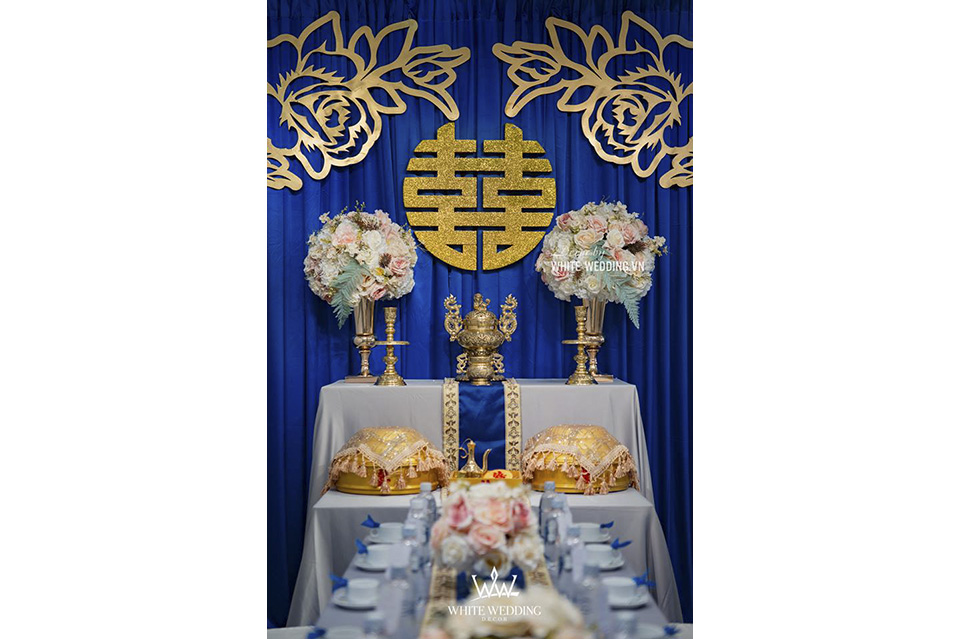 Trang trí gia tiên với tone màu chủ đạo là xanh Navy của sự bình yên, biển cả và đất trời kết hợp với hoa văn cách điệu và chữ Hỷ vàng gold mang đến không gian ngày cưới sang trọng và ấn tượng.