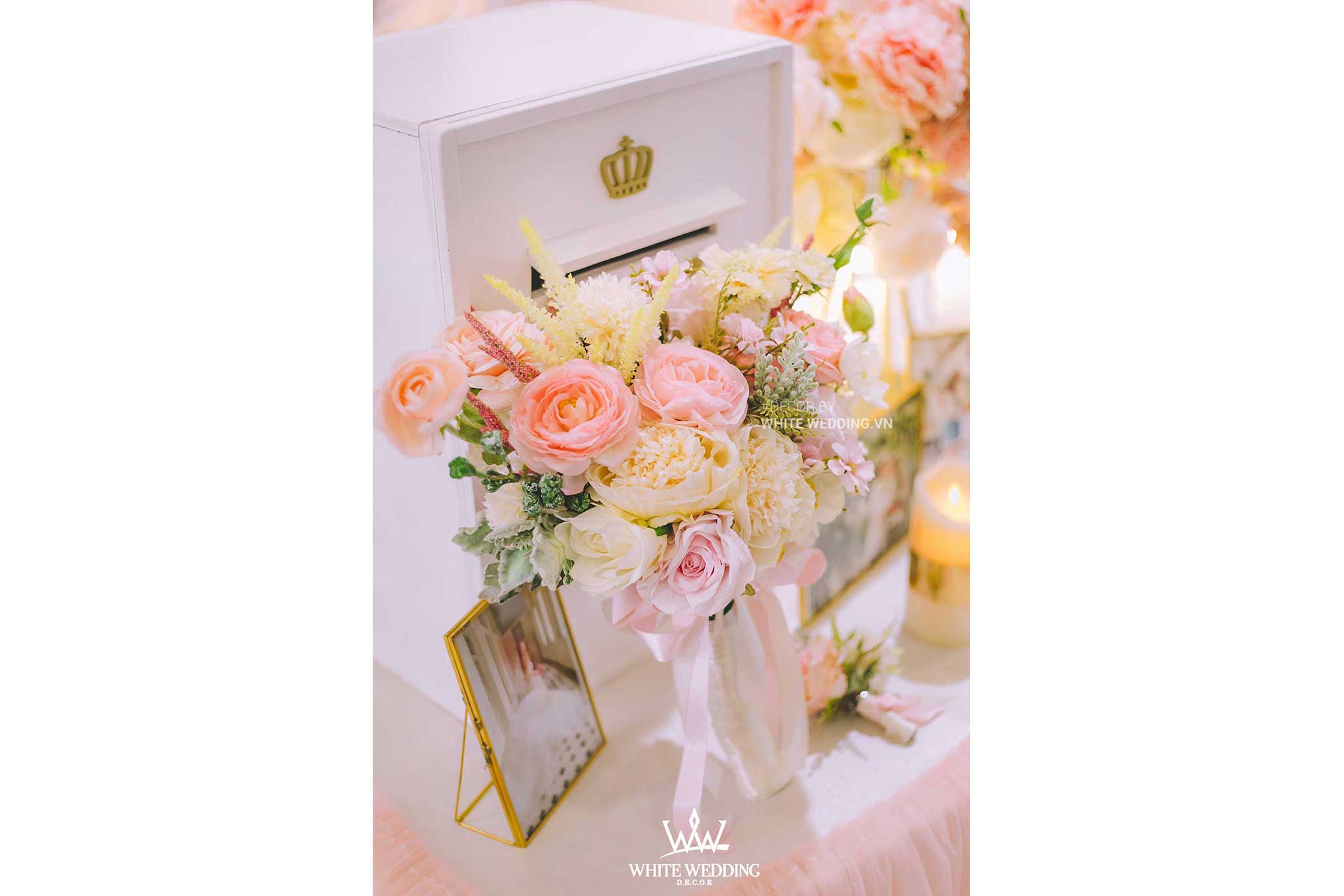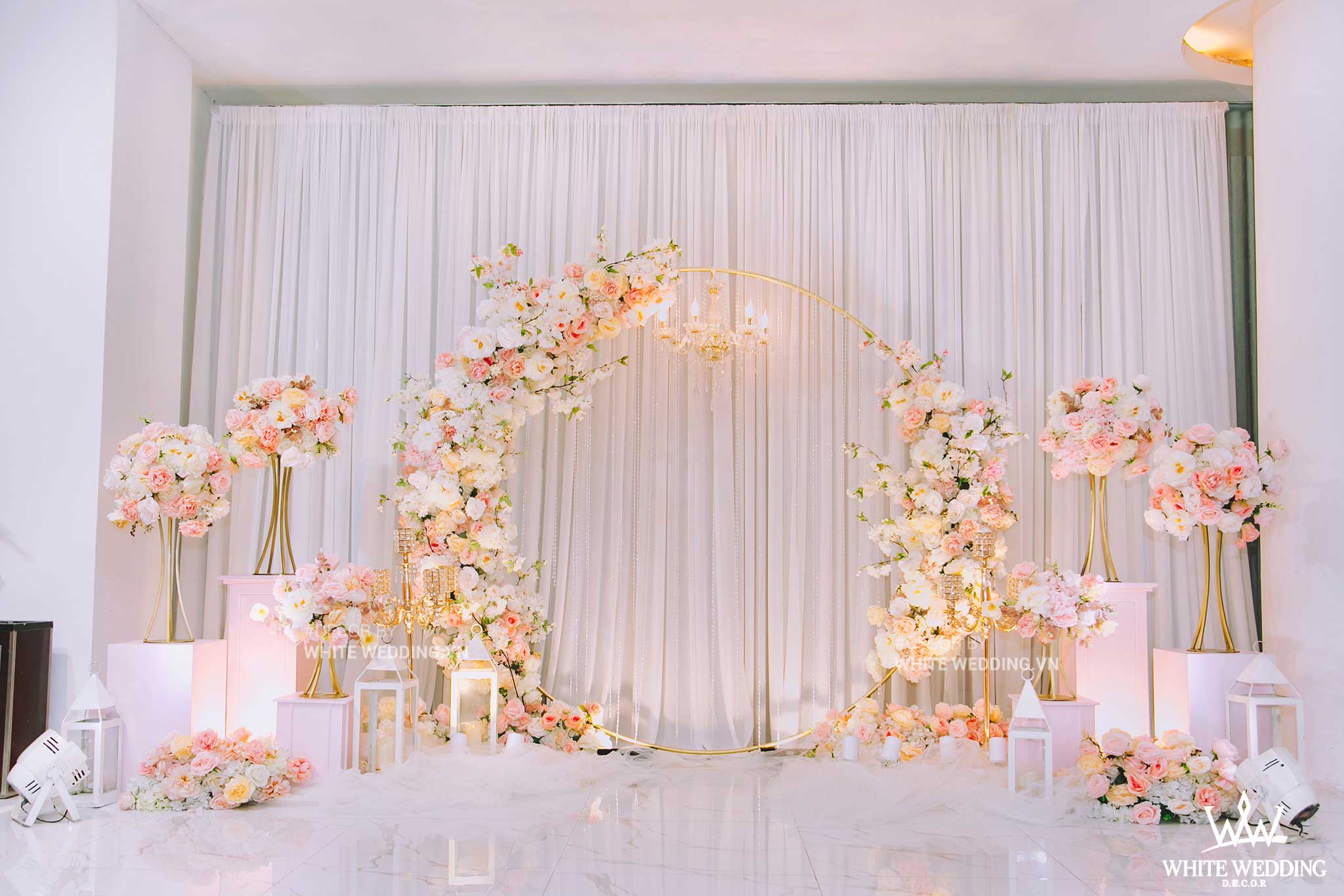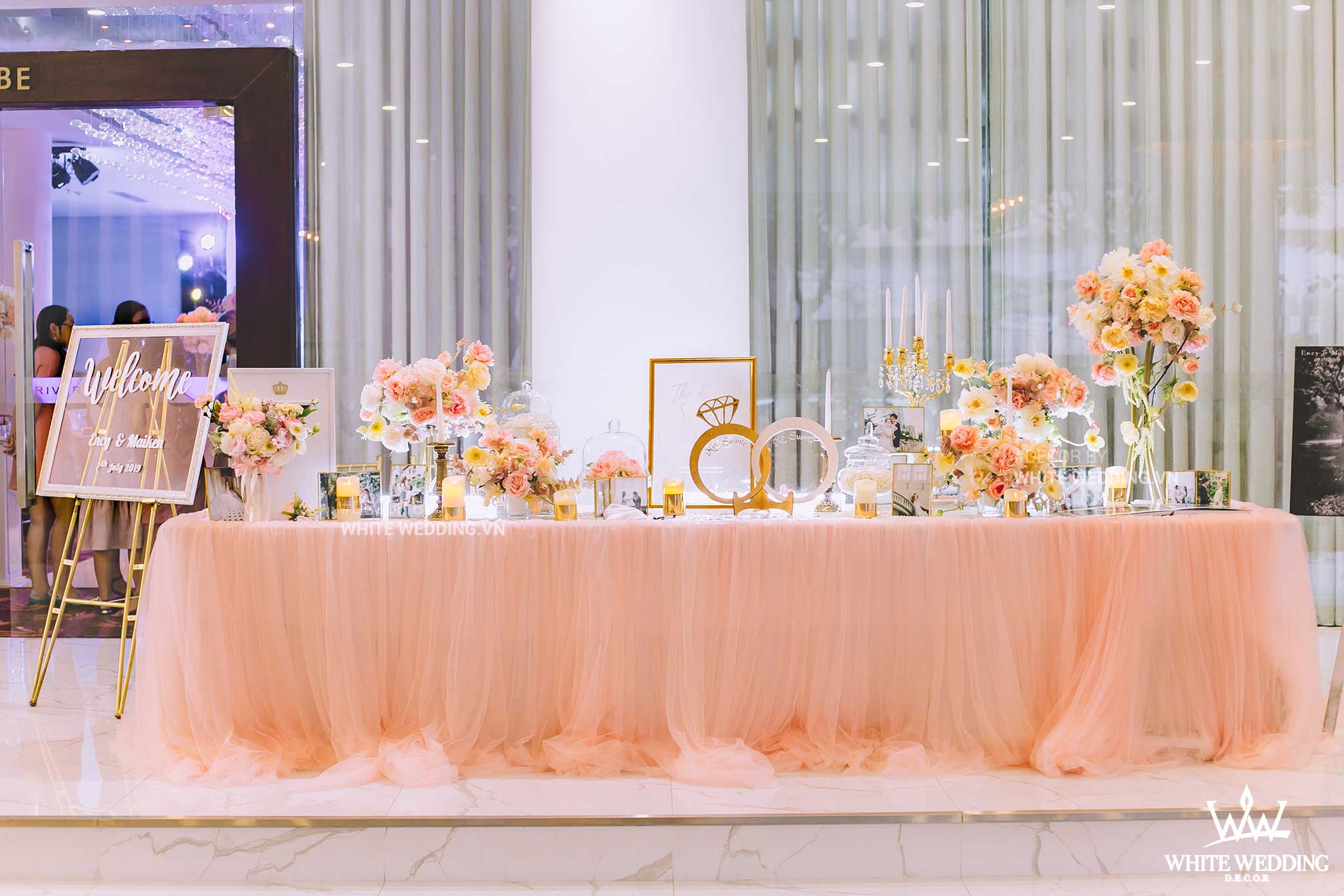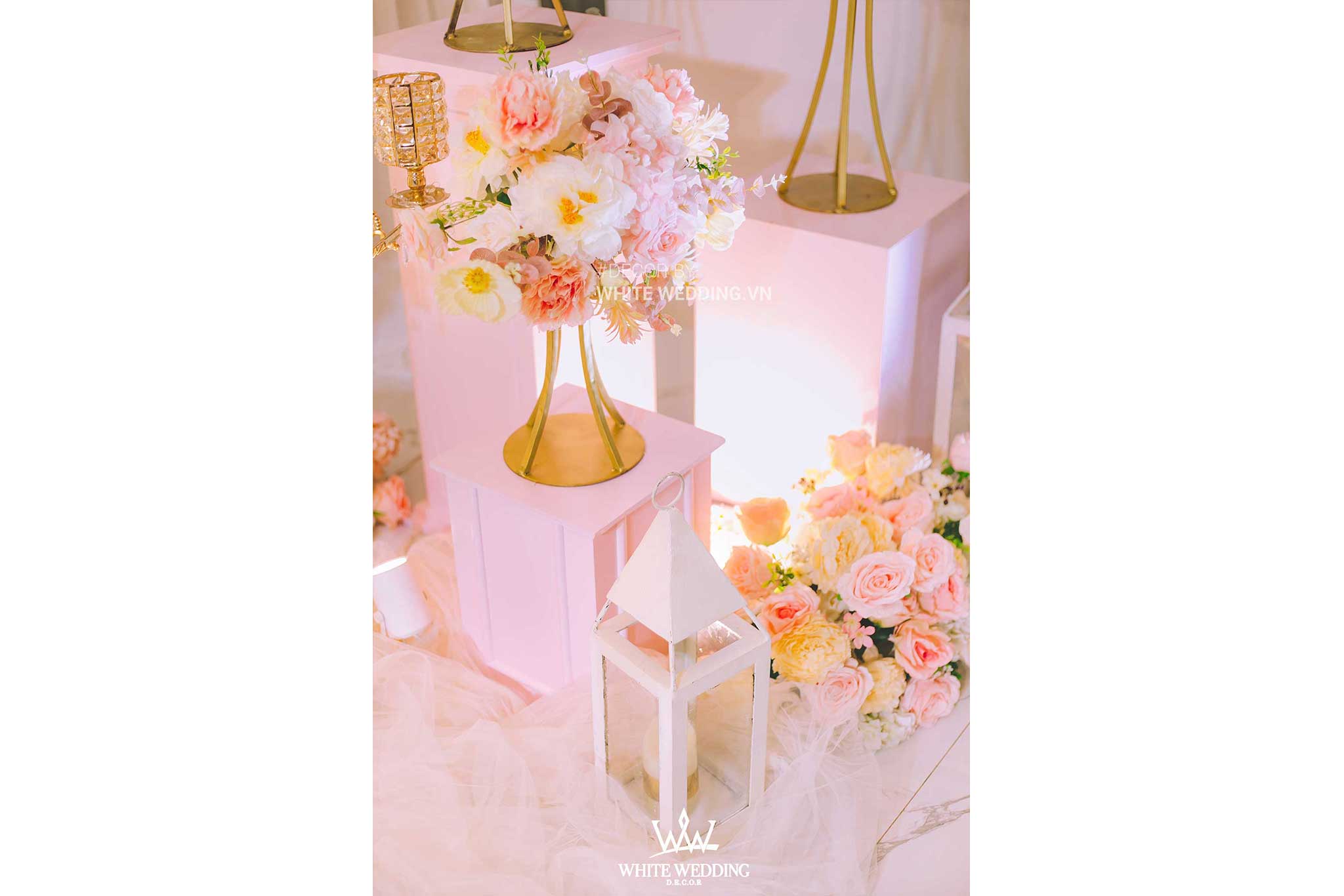 PINKY PRINCESS – siêu phẩm dành cho nàng dịu dàng, gây ấn tượng với thiết kế cổng hoa cưới phá cách vòng tròn được kết hợp độc đáo bằng những tone màu nhã nhặn như hồng pastel, trắng điểm xuyến trên những vật trang trí golden sang trọng và tinh tế. Tất cả tạo nên một không gian tiệc cưới hoàng gia thật lãng mạn và đẳng cấp.