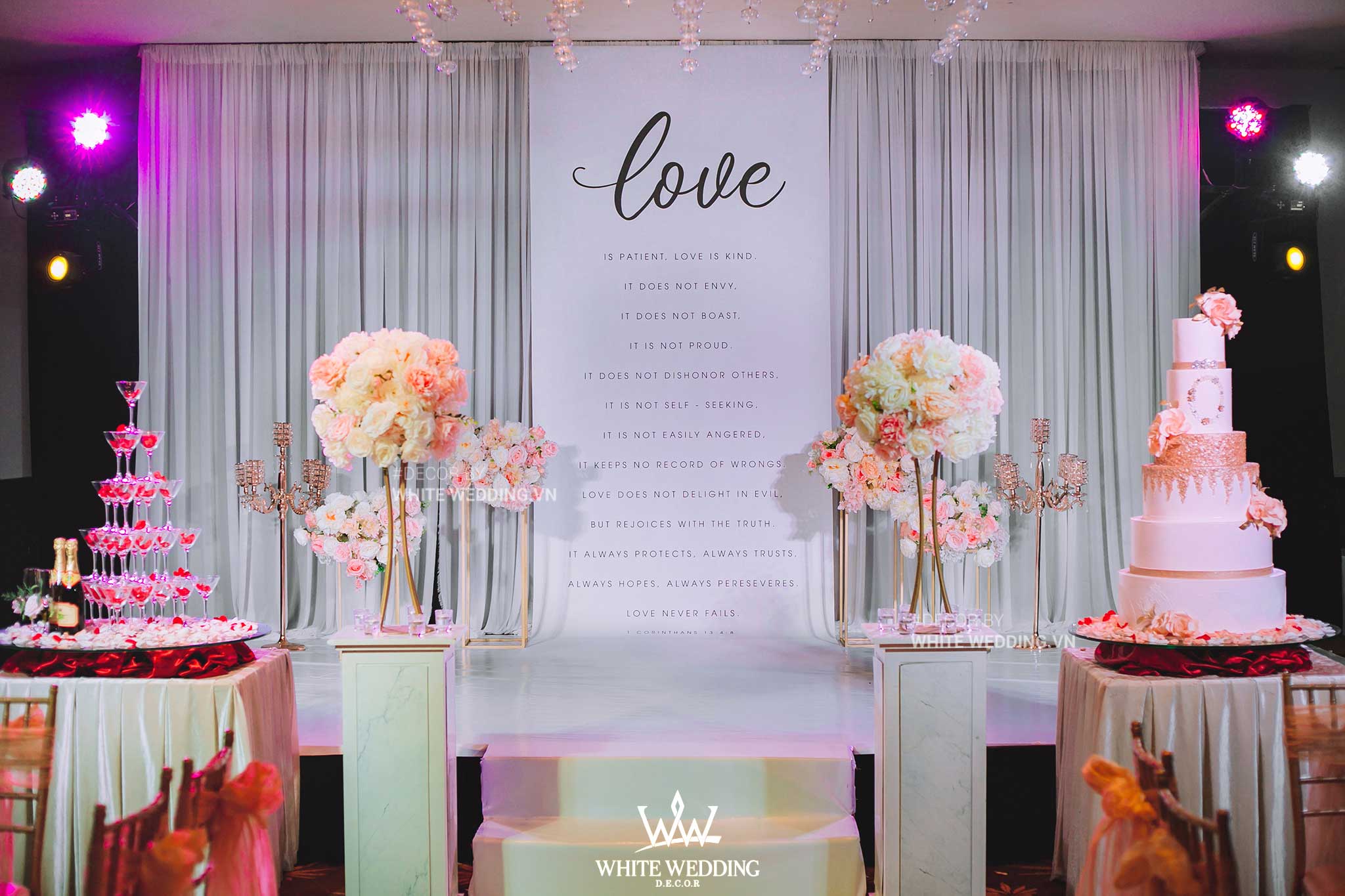 Biến không gian tiệc cưới trở nên sang trọng, lộng lẫy bằng hệ thống mẫu ấn tượng bậc nhất, kết hợp với hoa tươi nhập khẩu cao cấp.
