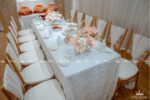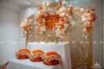 Trang trí lễ gia tiên – Được lấy cảm hứng từ sắc đỏ truyền thống, chấm phá thêm sắc cam rực rỡ, sử dụng thêm sắc hồng nhẹ nhàng tạo nên một không gian lễ gia tiên tươi mới, ngọt ngào. Backdrop được sử dụng tone vàng đồng sang trọng với những đường cắt tinh tế làm tôn lên trọn vẹn sắc màu của chữ hỷ và các line hoa.