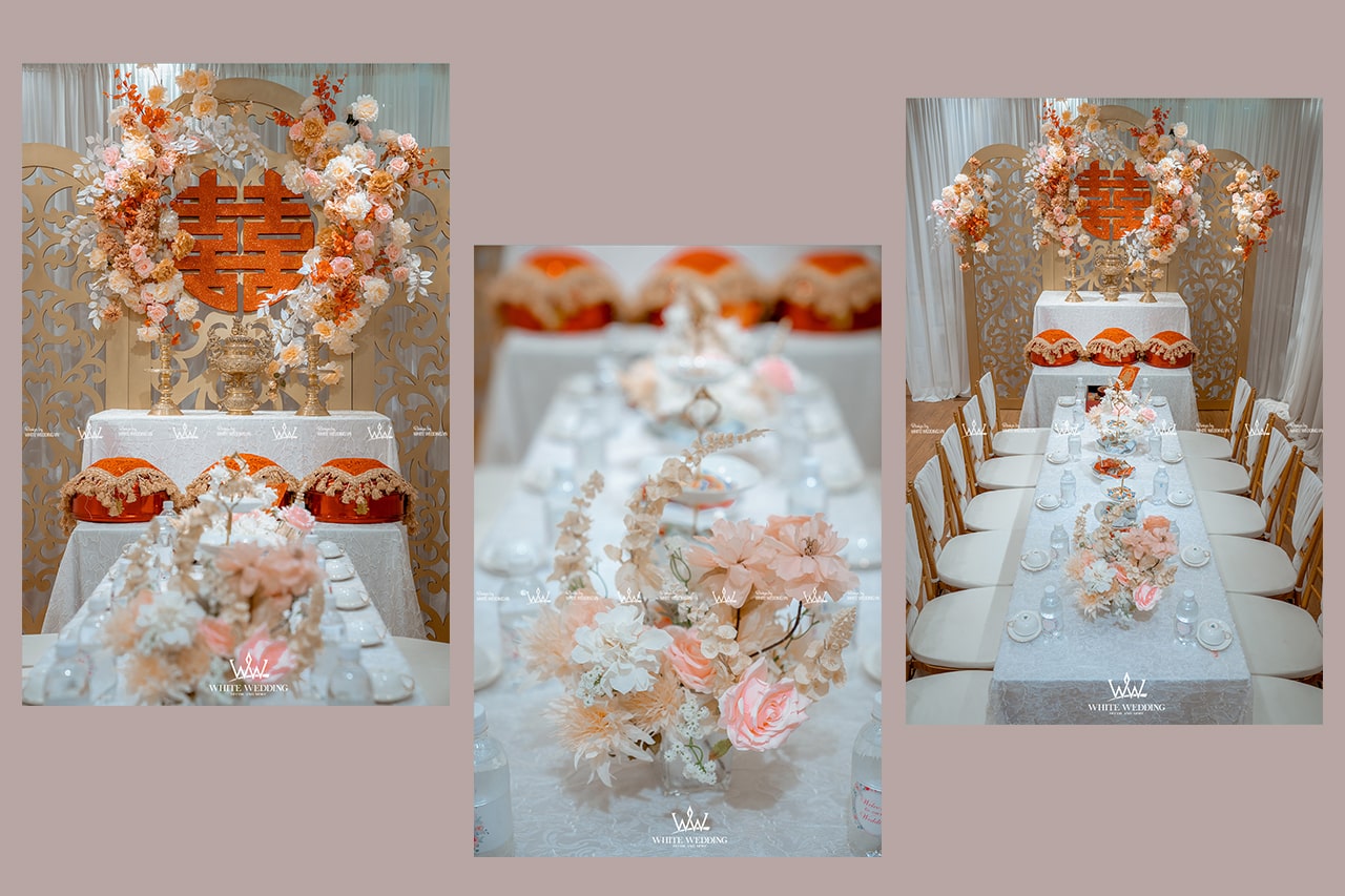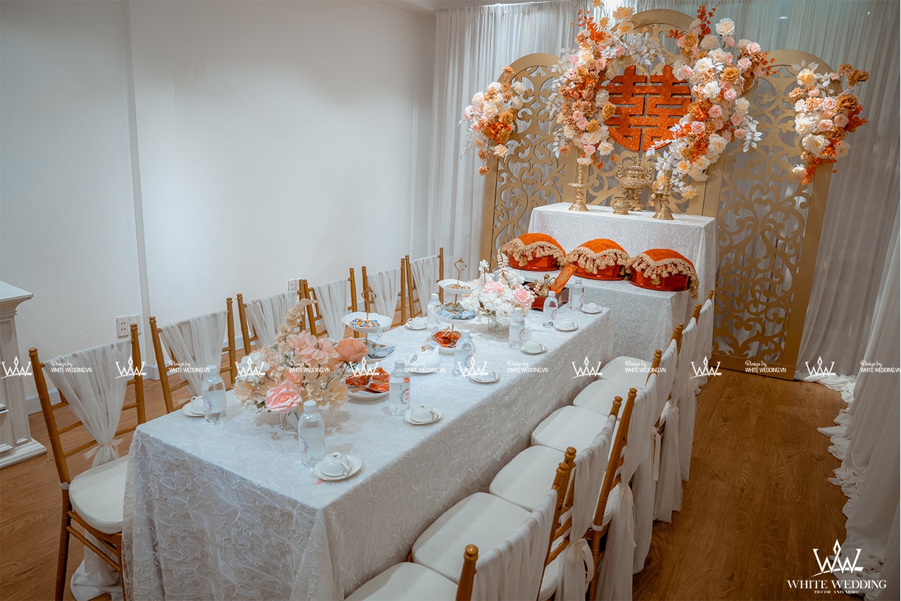 LOVE STORY – LẤY CẢM HỨNG TỪ PHONG CÁCH CLASSIC Trang trí lễ gia tiên - Lễ Vu Quy sắc hồng anh đào vẽ nên một câu chuyện tình lãng mạn và hành trình hạnh phúc với những điều tốt đẹp tương lai. Sự kết hợp tinh tế giữa tone màu pastel nhẹ nhàng của hoa hồng và baby trắng điểm xuyến lên backdrop hoa anh đào nở rộ và họa tiết vàng gold sang trọng. Lấy cảm hứng từ phong cách classic thổi hồn vào không gian ngày lễ trở nên ấn tượng. Lưu ý: • White Wedding sẽ tới nhà quý khách khảo sát trước khi trang trí set up. Thông thường set up hoàn thiện trước ngày lễ 1 ngày • Miễn phí phí vận chuyển và lắp đặt trang trí nhà trong vòng bán kính 5km (tính từ công ty)