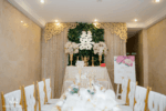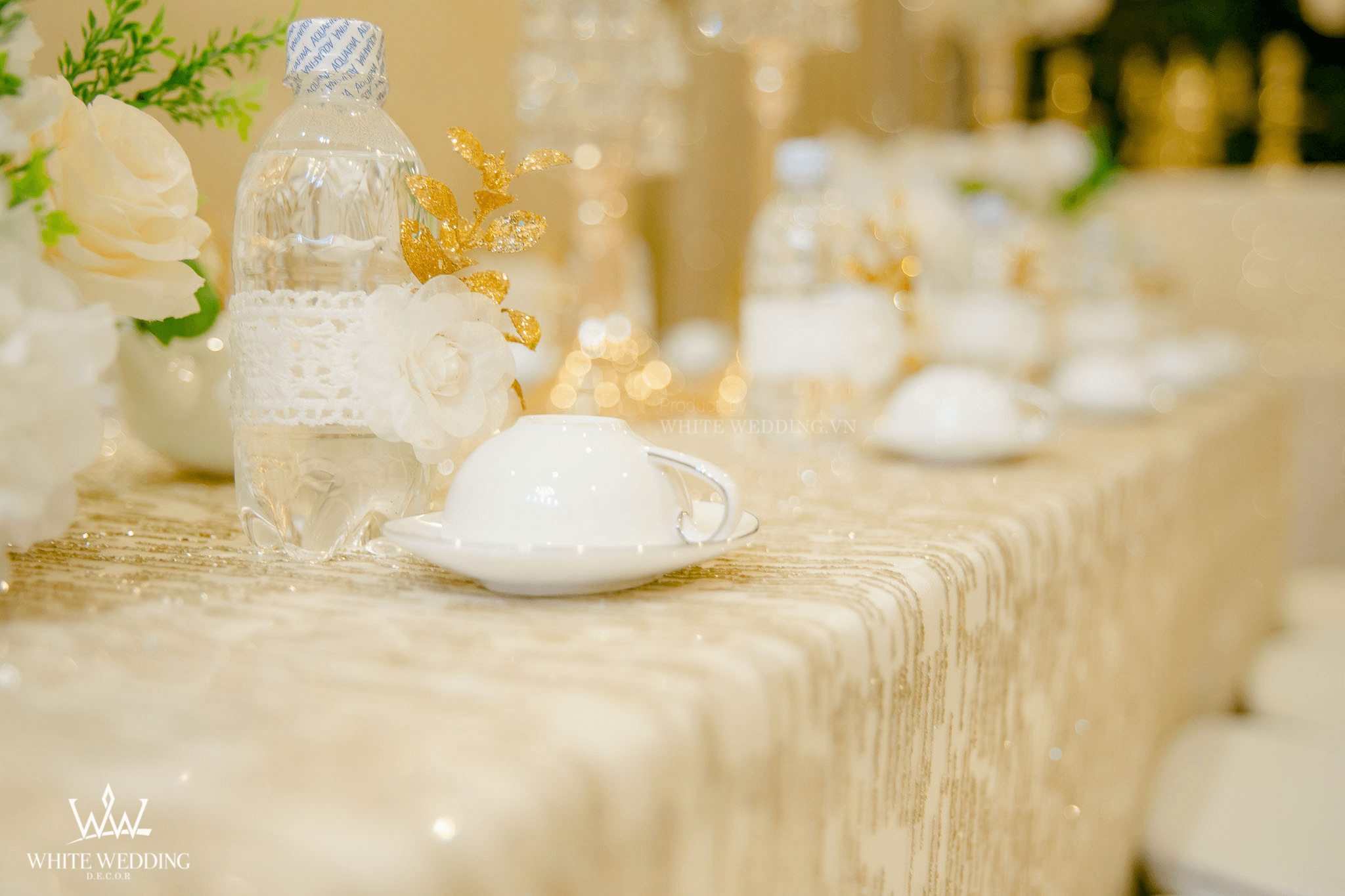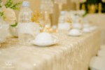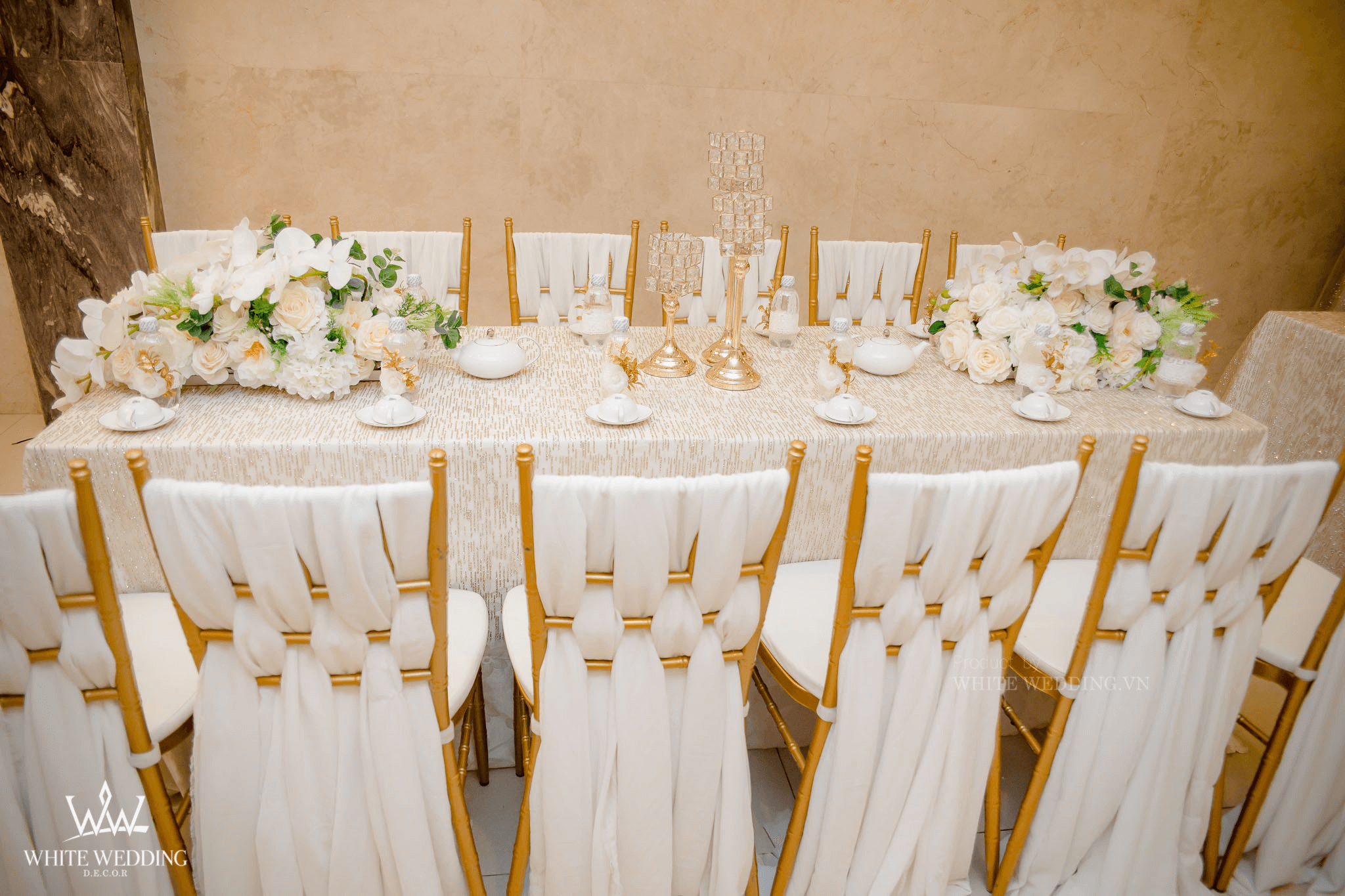 – 03 cụm hoa lụa để bàn điểm lan hồ điệp – 12 ghế Tiffany vàng đan vải – 02 bộ ấm tách Minh Long cao cấp (2 ấm, 12 tách , 12 đĩa) – Bảng tên CD- CR thiết kế 2D – 12 chai nước suối thiết kế đính hoa lụa |