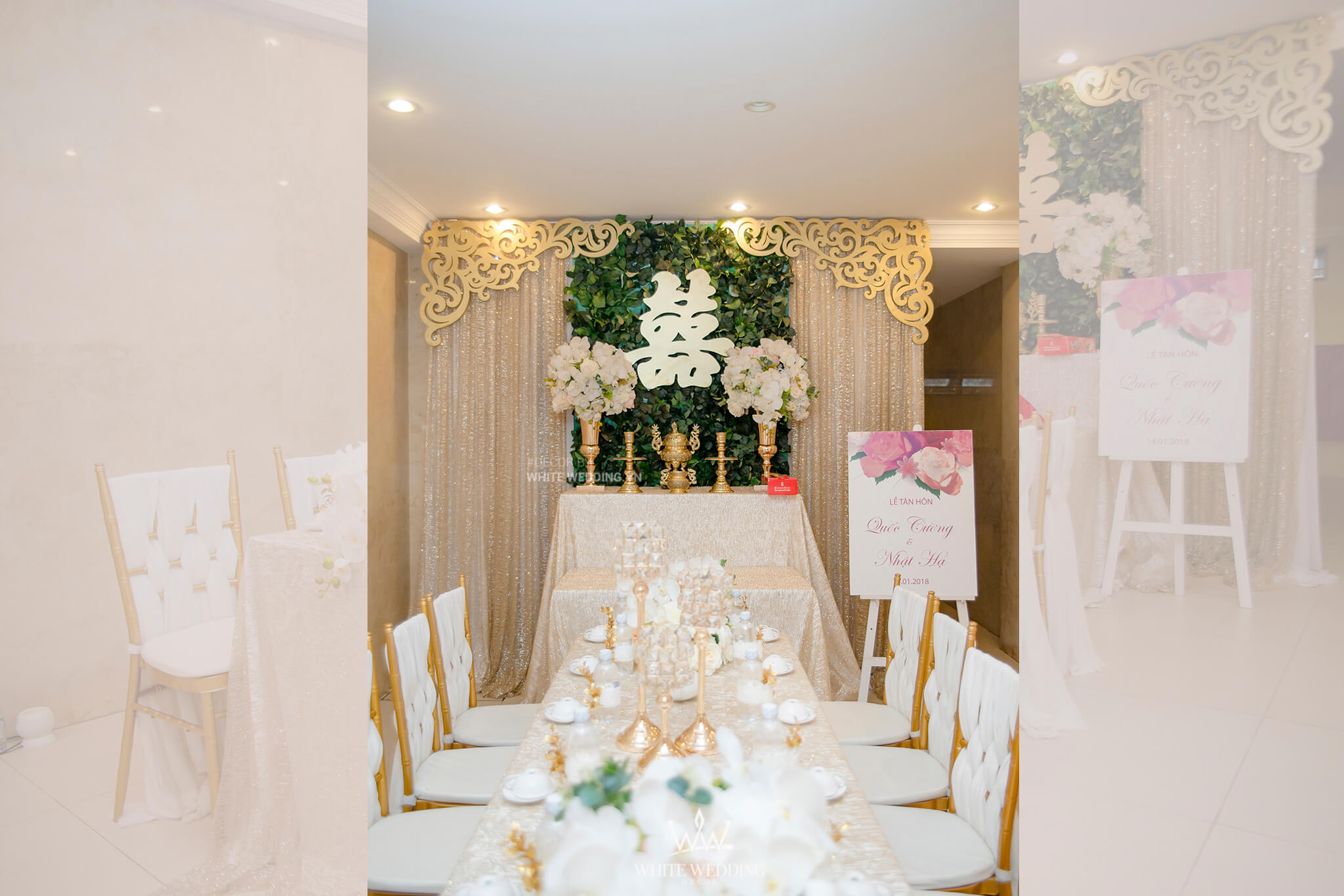 CHÚT ÁNH NẮNG CHO MÙA ĐÔNG LẠNH Sáng tạo trong gói trang trí gia tiên MIX KIM SA GOLD với vách ngăn chạm trổ hoa văn nghệ thuật và chữ Hỷ biểu tượng của tình yêu cũng được thiết kế tinh xảo, tất cả tạo nên một không gian sang trọng và hiện đại cho ngày cưới. Lưu ý: • White Wedding sẽ tới nhà quý khách khảo sát trước khi trang trí set up. Thông thường set up hoàn thiện trước ngày lễ 1 ngày • Miễn phí phí vận chuyển và lắp đặt trang trí nhà trong vòng bán kính 5km (tính từ công ty)