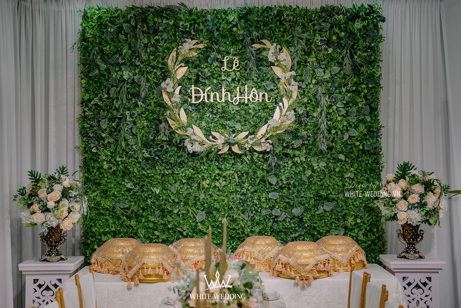 | ✔ Backdrop chính: – 01 khung voan trắng. – Nền lá lụa 2m4. – Vòng nguyệt quế CNC – Tên lễ hoặc chữ Hỷ theo yêu cầu. |